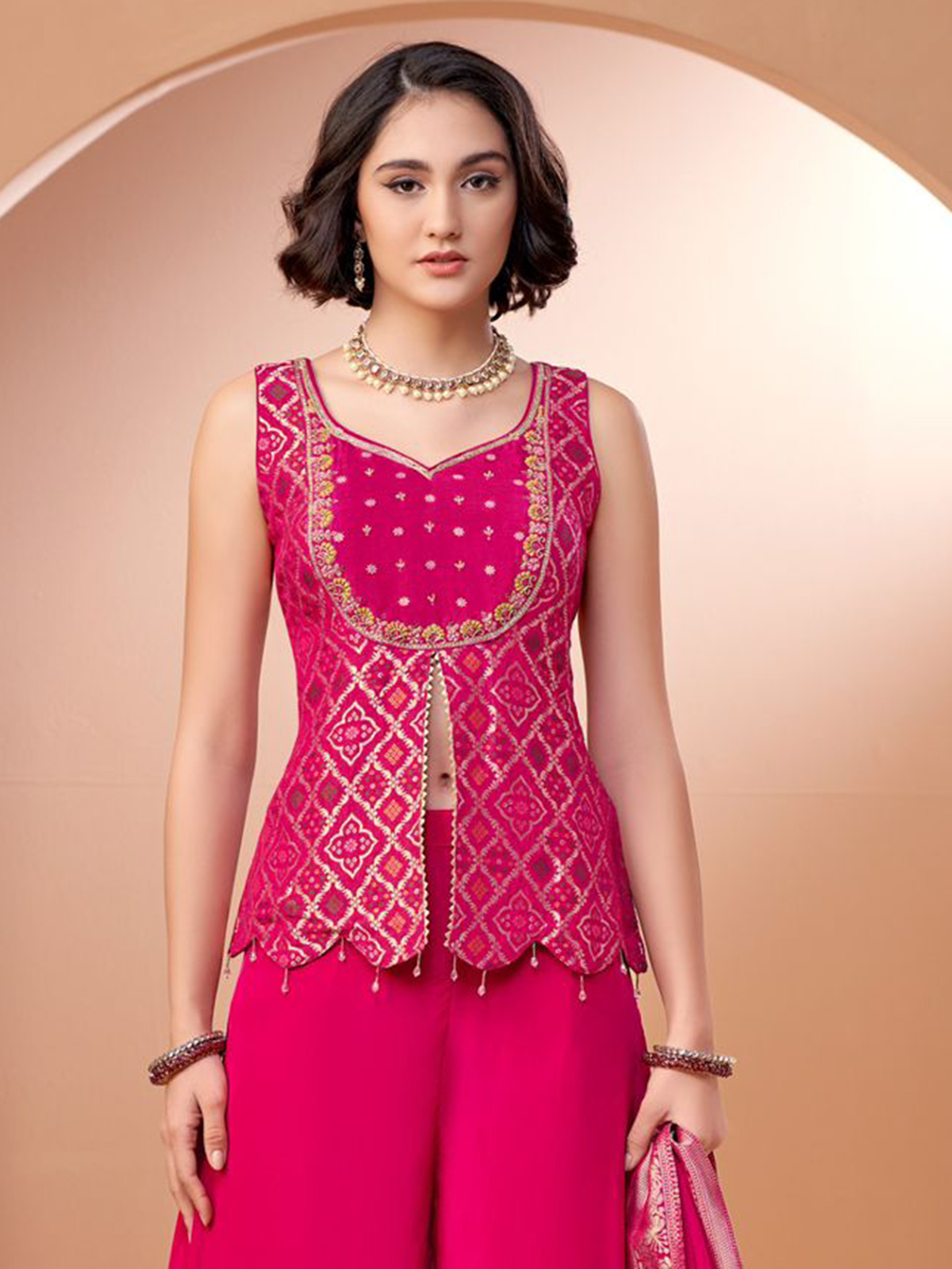 Bold elegance defines this magenta silk palazzo suit adorned with zari, gota, sequins, and threadwork. A sweetheart neckline and sleeveless finish lend a modern edge. Complemented with a dupatta, it becomes an ideal statement piece for weddings, Diwali rituals, and festive evenings.