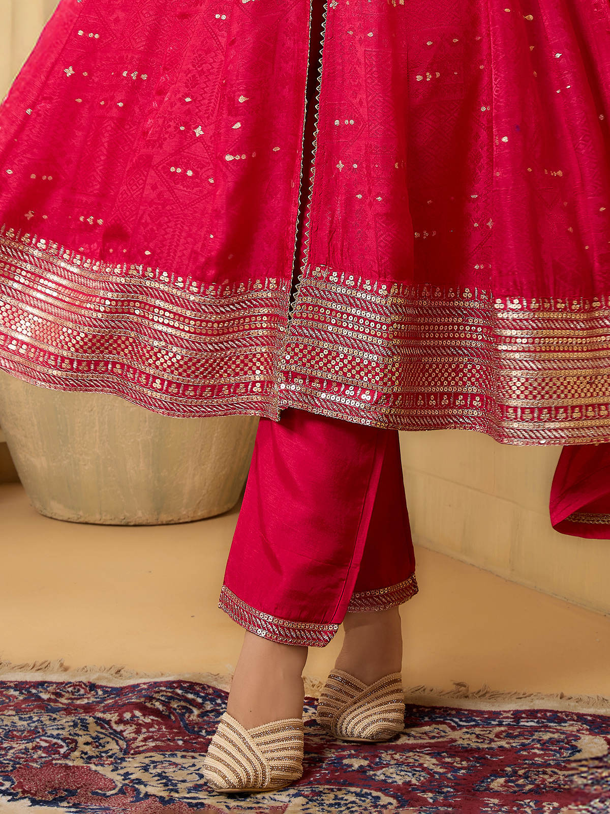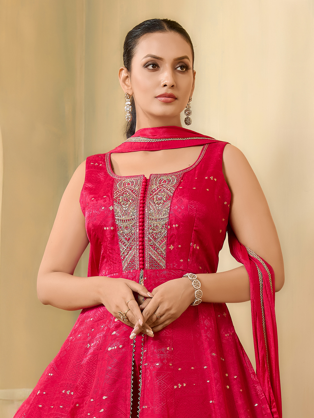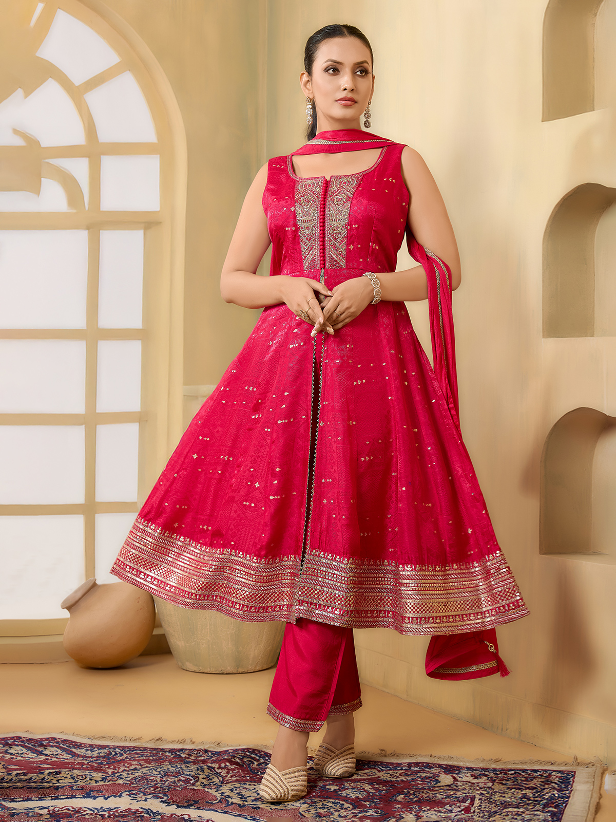Vibrant magenta silk salwar suit embellished with resham, sequins, zari, zardosi and stone work for striking festive appeal. Designed with a round neckline and sleeveless cut, it is paired with a coordinated pant, making it perfect for weddings, sangeet and grand celebrations.