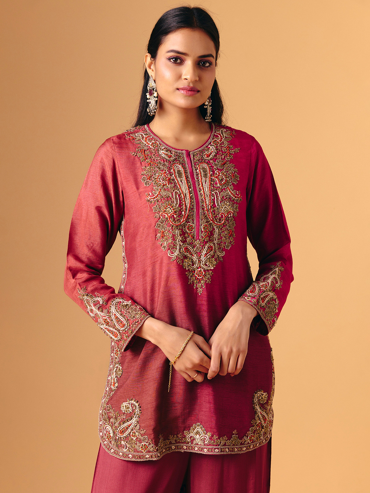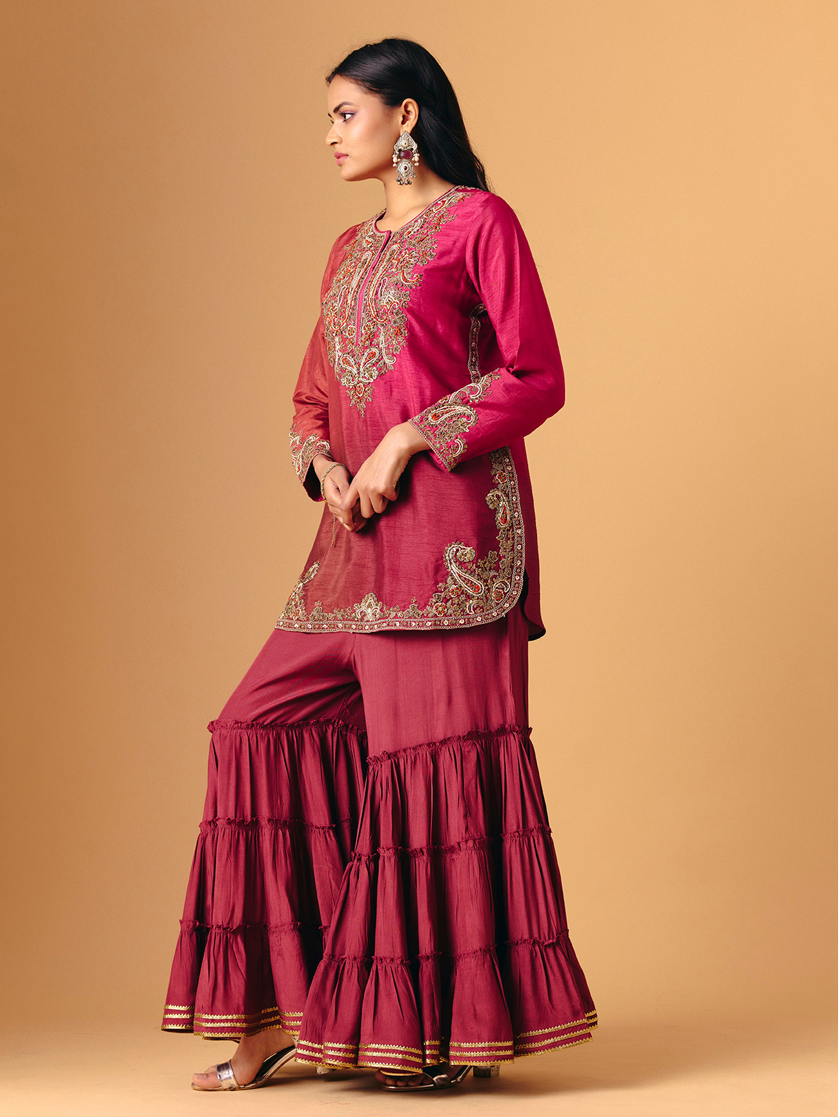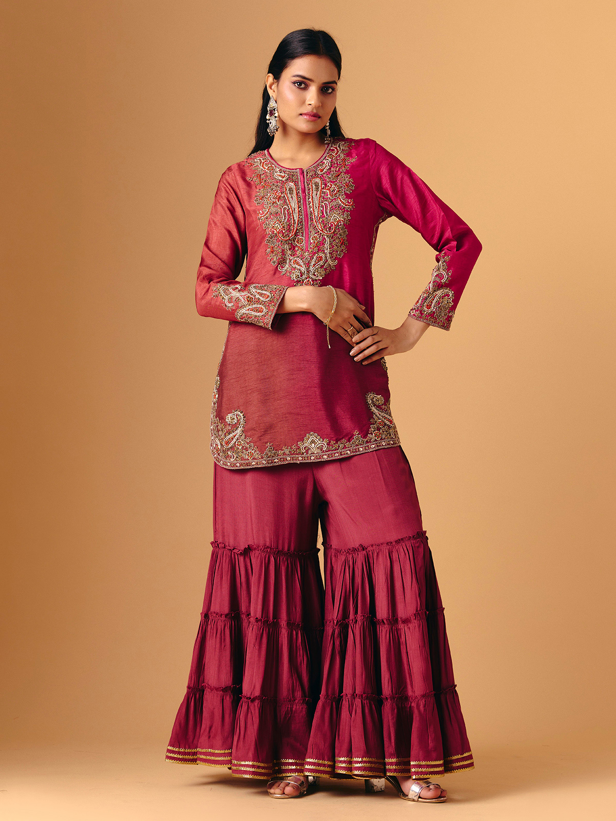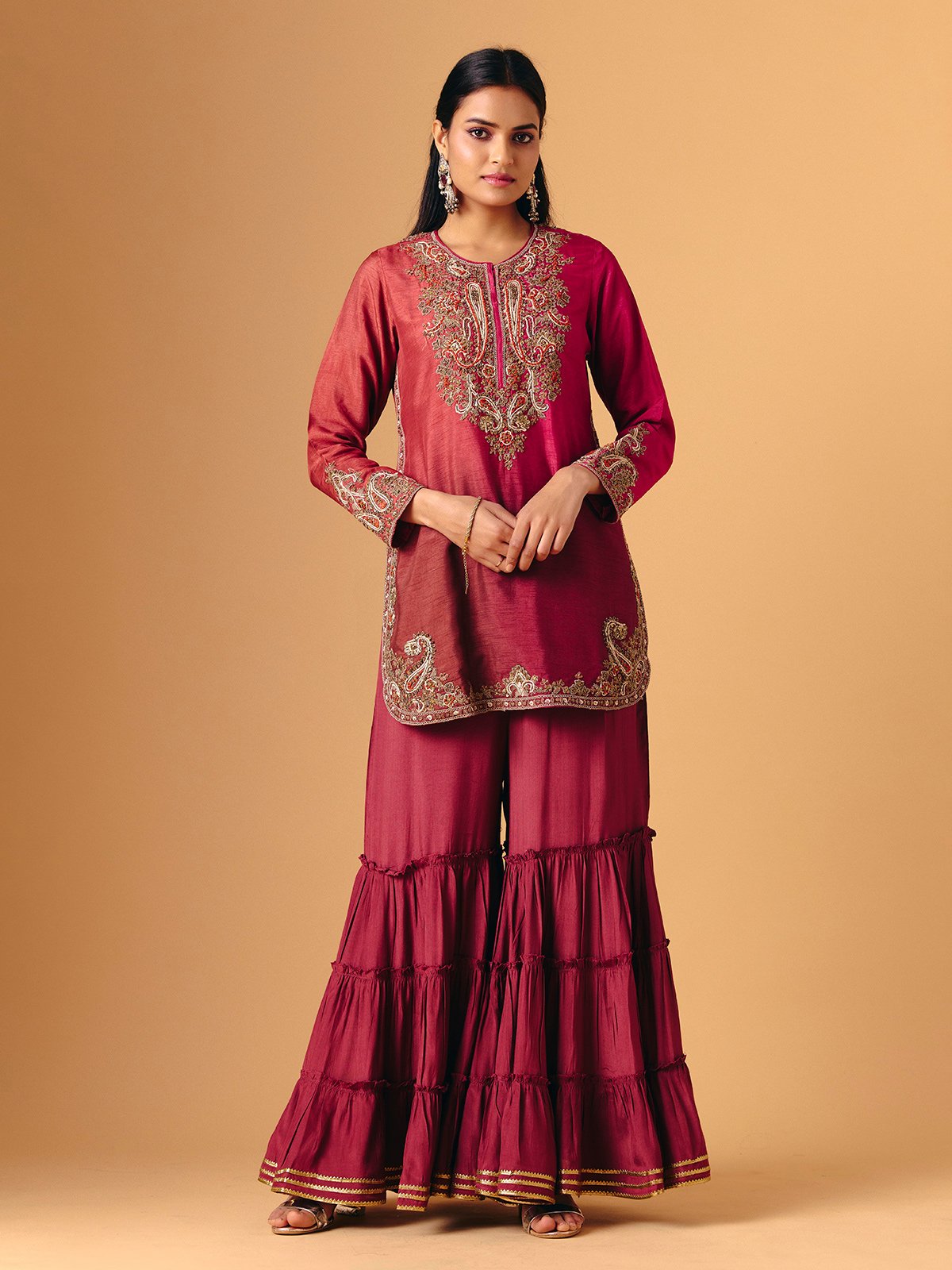Rich maroon cotton silk defines this striking sharara adorned with cutdana, beads, sequins, thread and embroidery work. The quarter-sleeved kurta pairs beautifully with the flared sharara, creating dramatic movement. Deep colour and detailed craftsmanship give this design a bold, traditional and festive presence.
