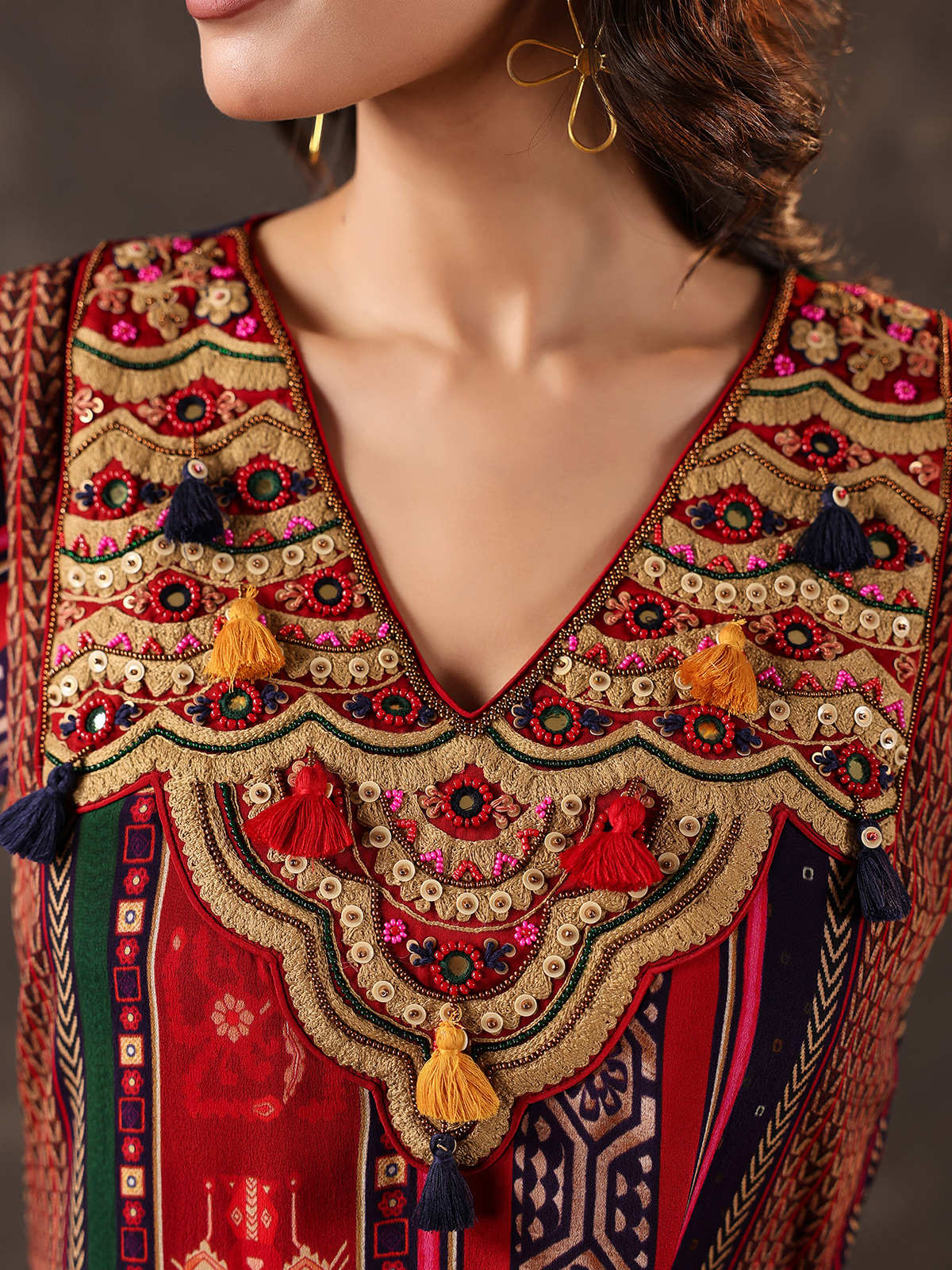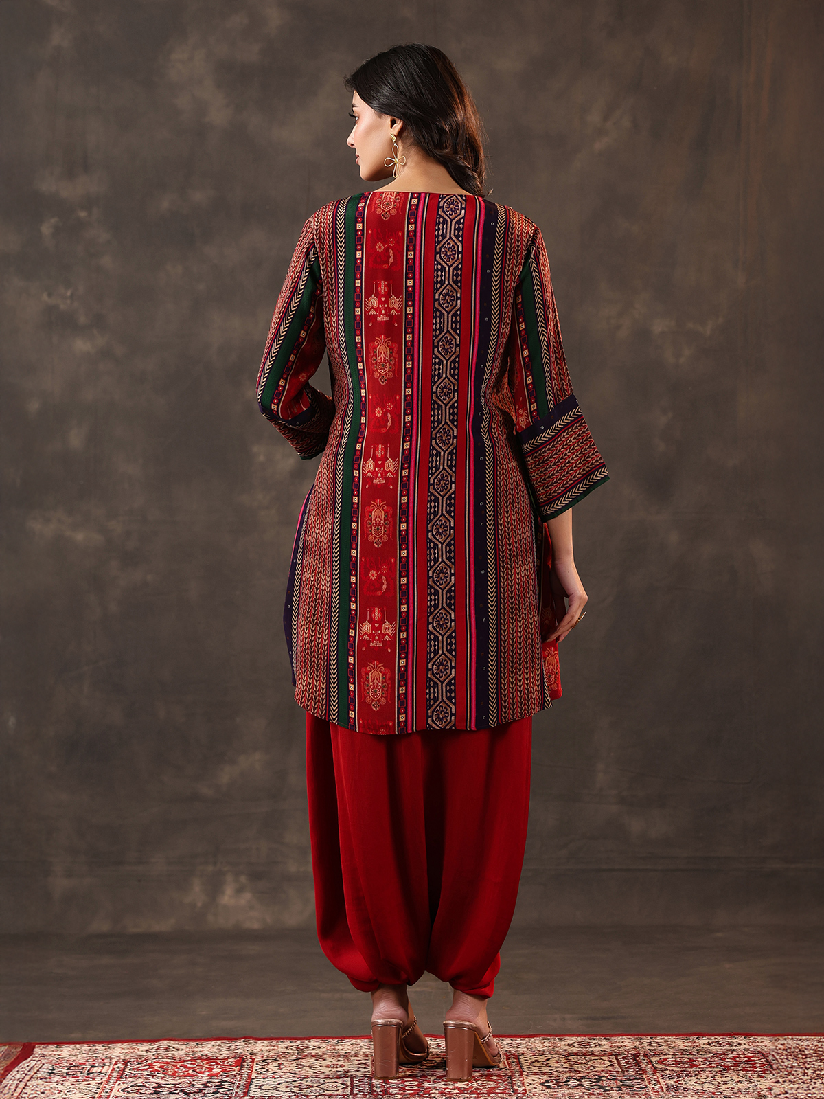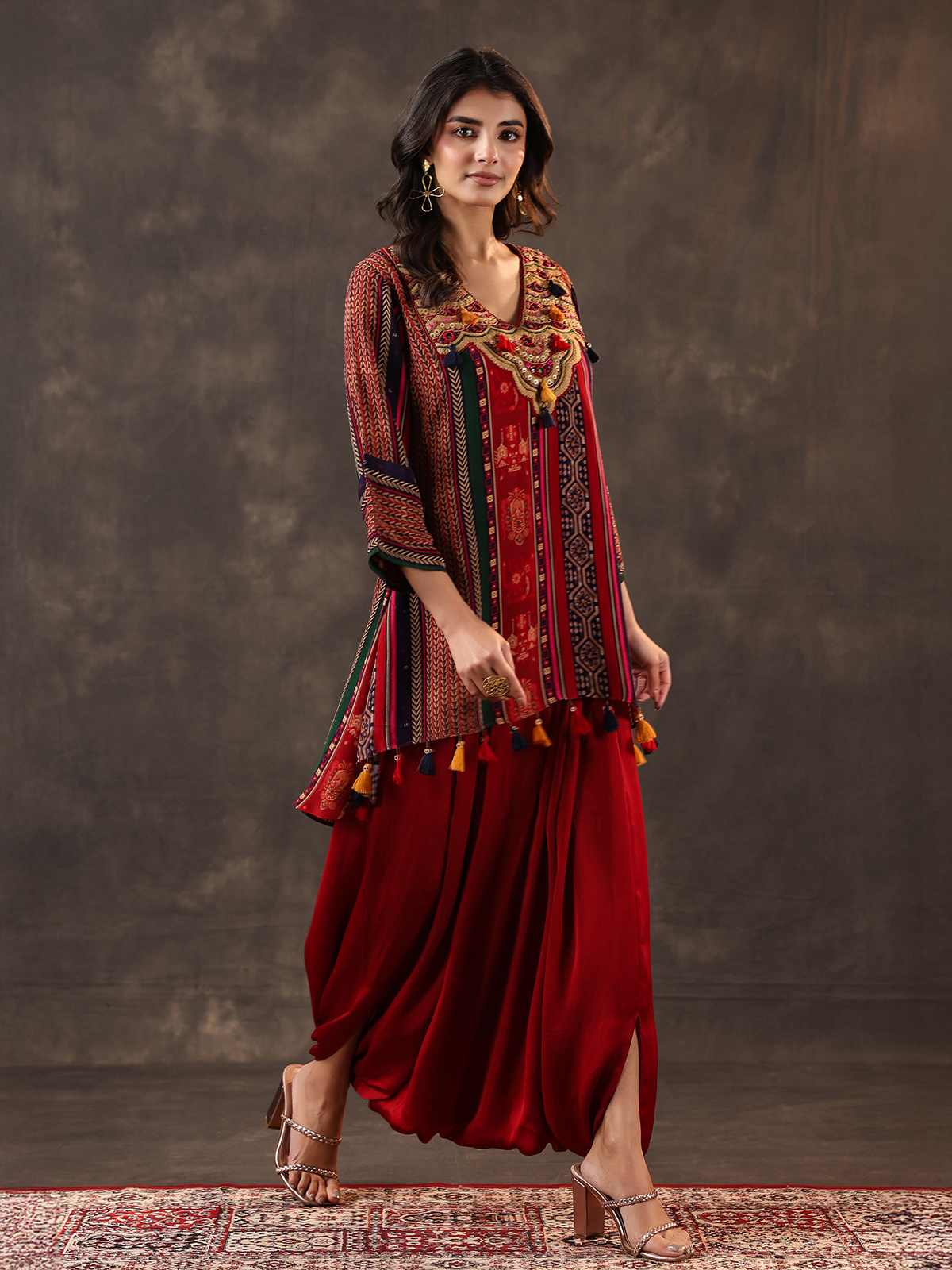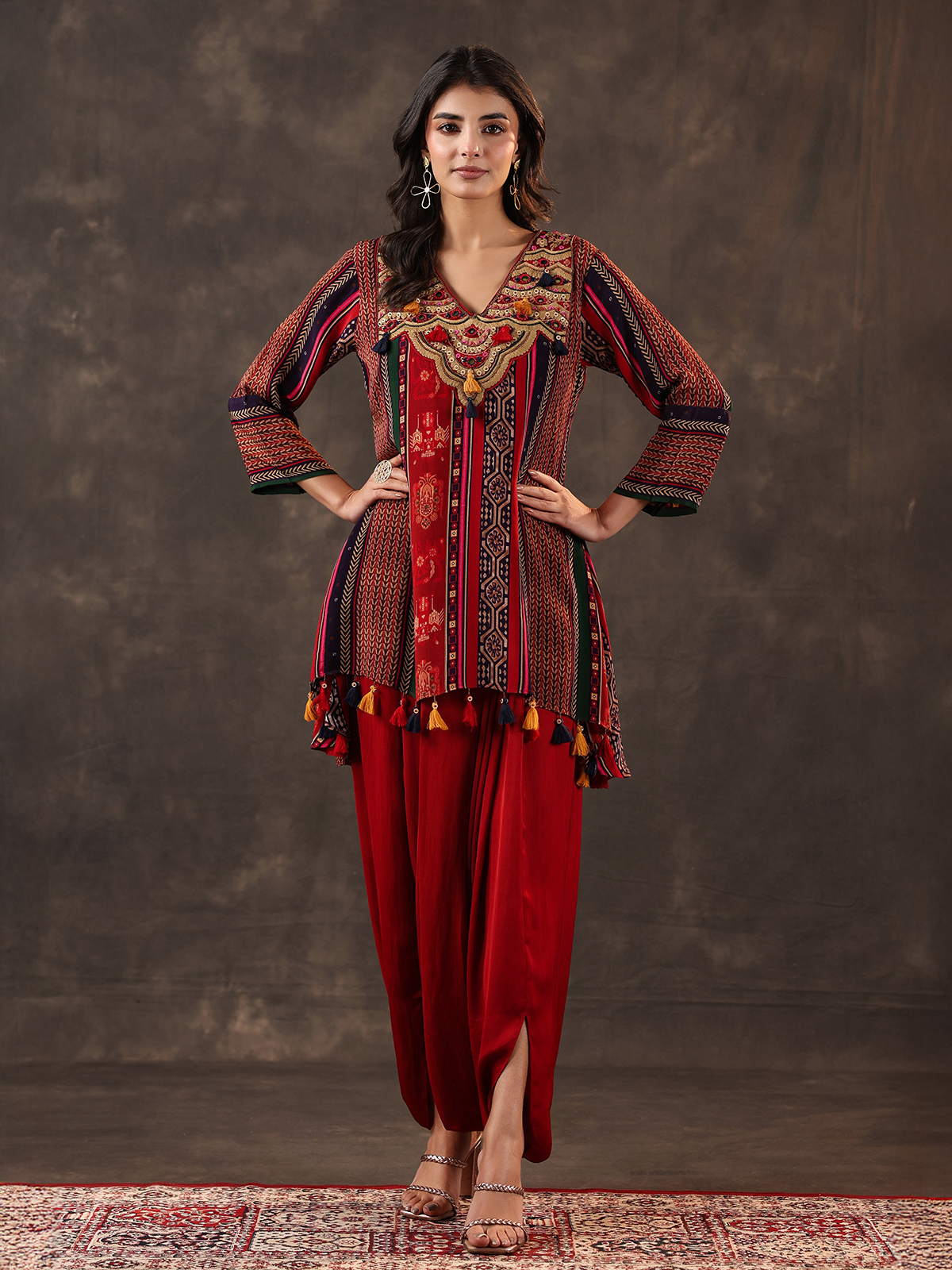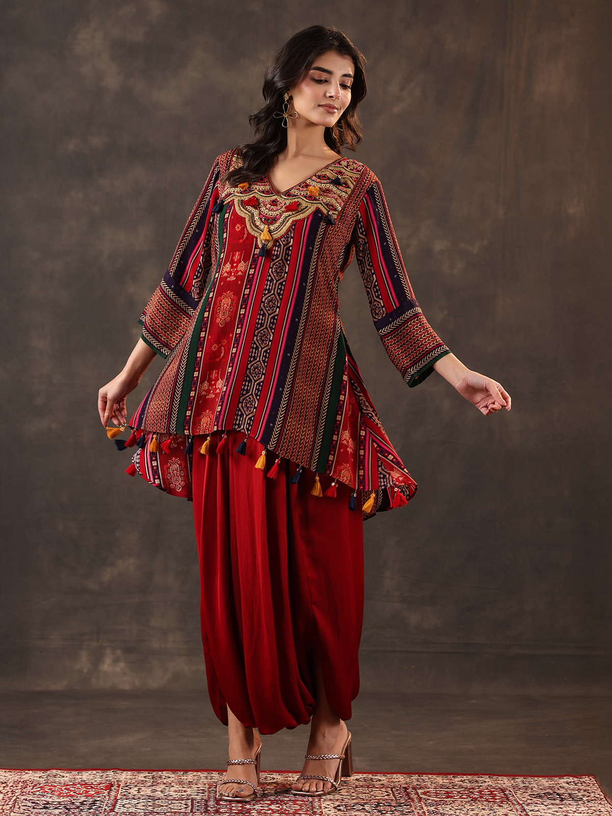 Deep maroon bring timeless elegance to this crepe silk dhoti suit crafted for festive charm. Detailed with beads, sequins, thread and mirror work over prints. It reflects rich artistry. The V neckline and quarter sleeves add refinement. While the dhoti style bottom completes the look.