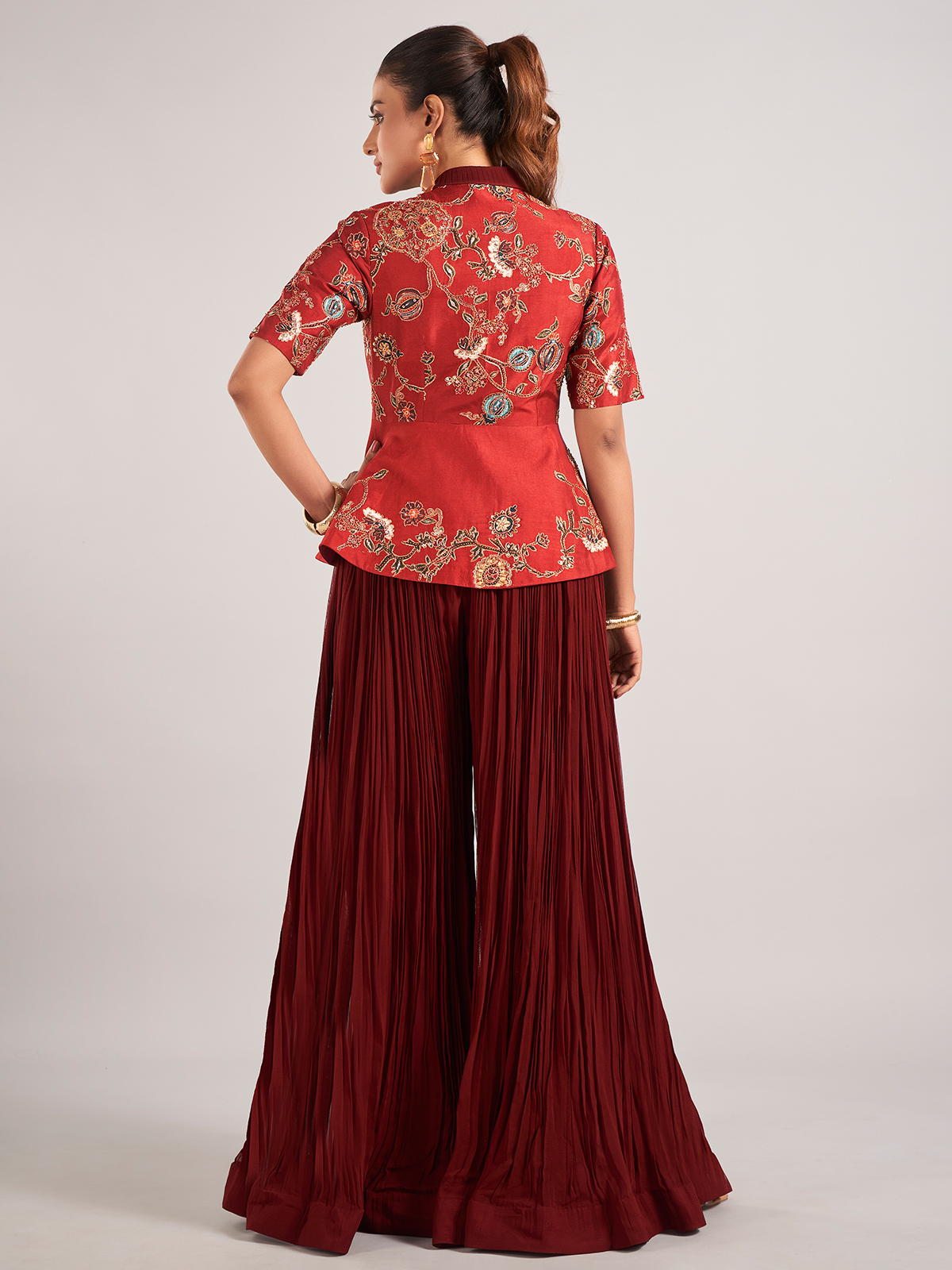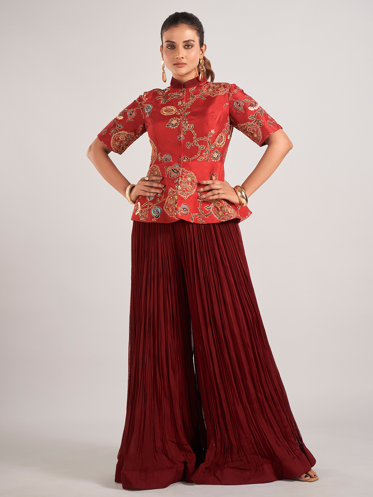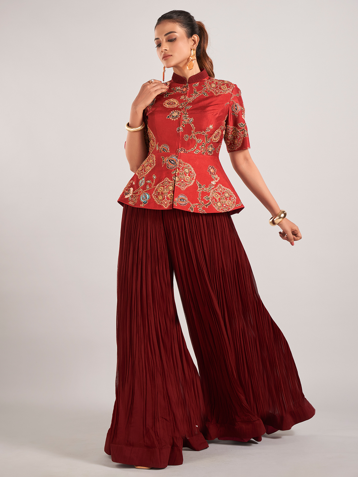 Elevate your style with this maroon georgette designer palazzo suit, crafted to keep your look effortlessly stylish and contemporary. The ensemble features exquisite cutdana, sequins, beads, zardosi, and resham work, adding rich texture and glamour to your wardrobe. Designed with a sophisticated bandhgala neck and half sleeves, this suit offers a perfect blend of modern elegance and traditional charm ideal for festive occasions, parties, or formal gatherings.