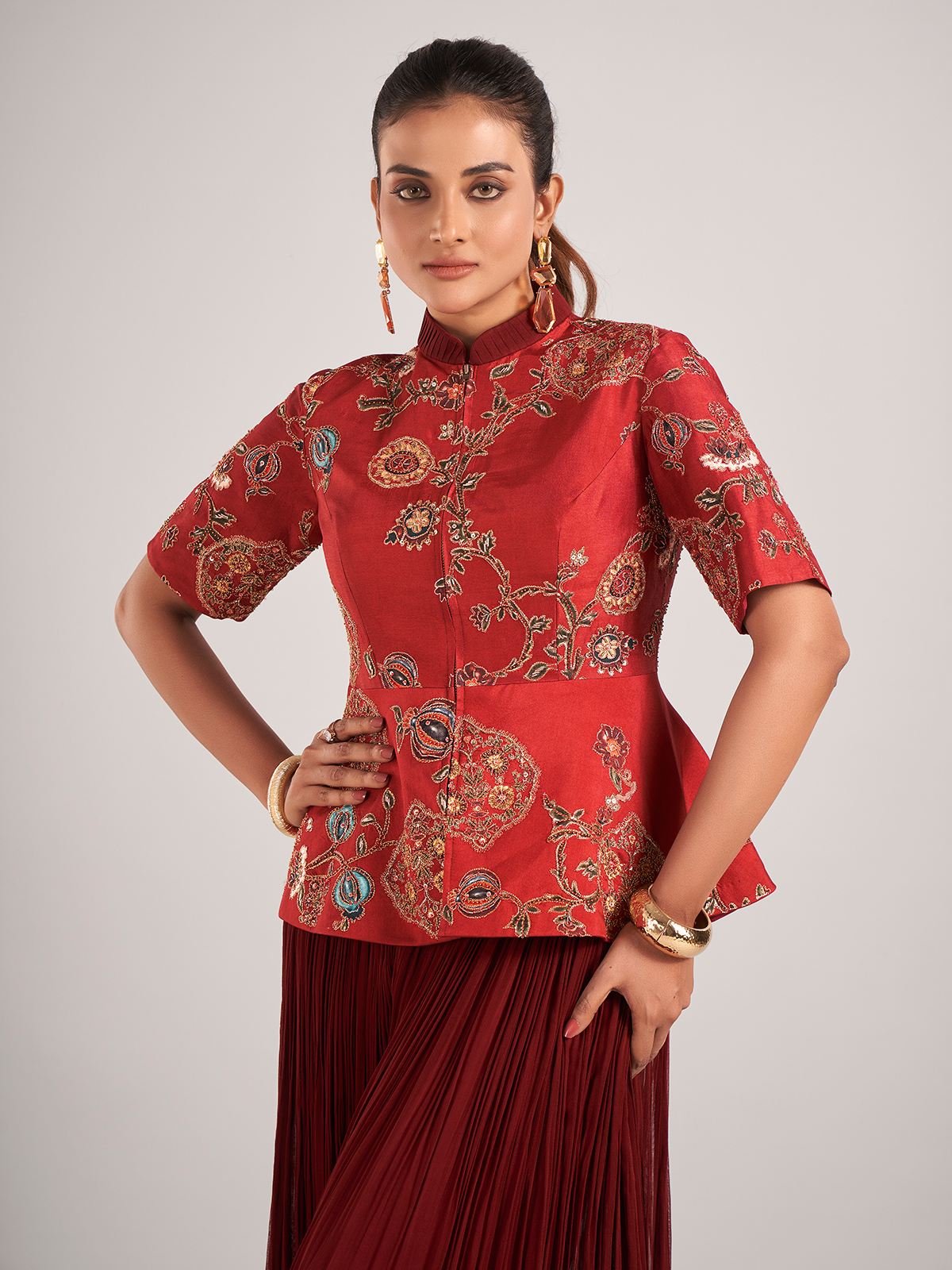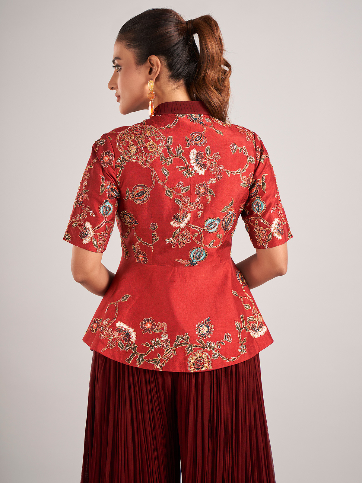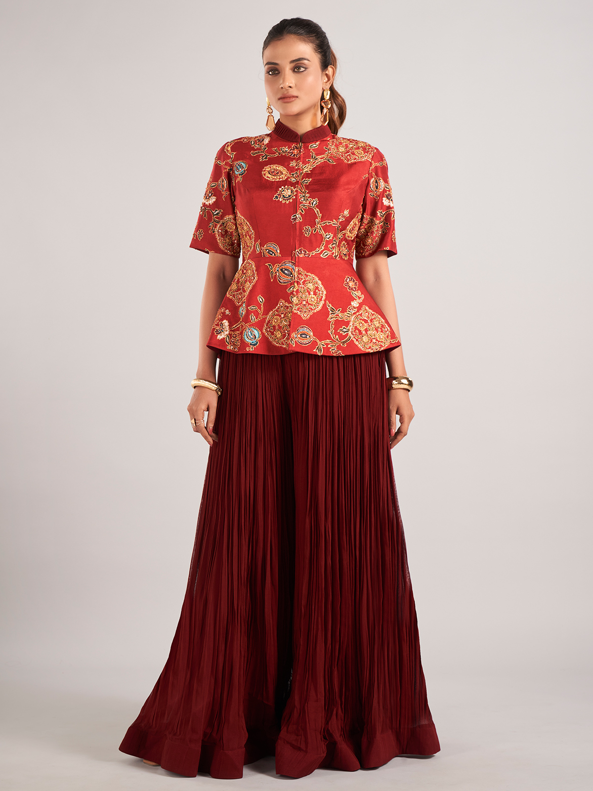Elevate your style with this maroon georgette designer palazzo suit, crafted to keep your look effortlessly stylish and contemporary. The ensemble features exquisite cutdana, sequins, beads, zardosi, and resham work, adding rich texture and glamour to your wardrobe. Designed with a sophisticated bandhgala neck and half sleeves, this suit offers a perfect blend of modern elegance and traditional charm ideal for festive occasions, parties, or formal gatherings.