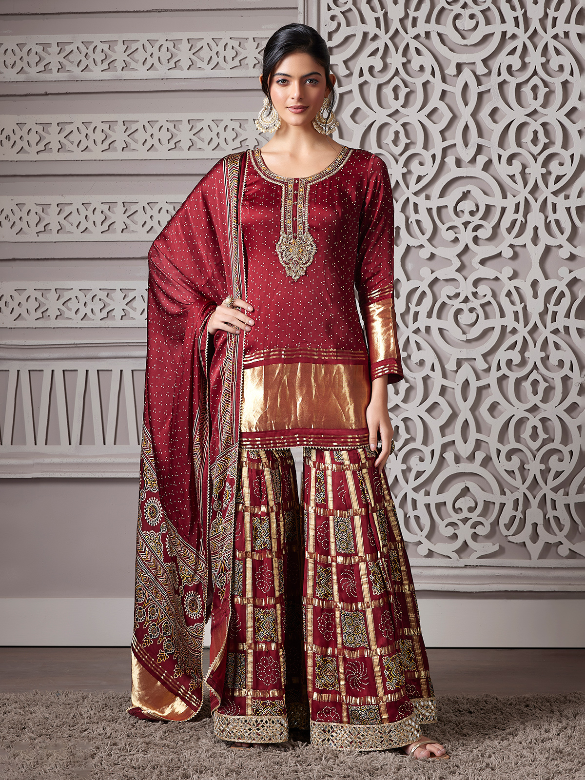 This maroon silk palazzo suit. Reflects Punjabi charm with printed detailing highlighted by mirror, cutdana, zardosi, beads and zari work. Styled with a round neckline and quarter sleeves, it is paired with a dupatta and palazzo, making it ideal for weddings, festive celebrations and receptions.