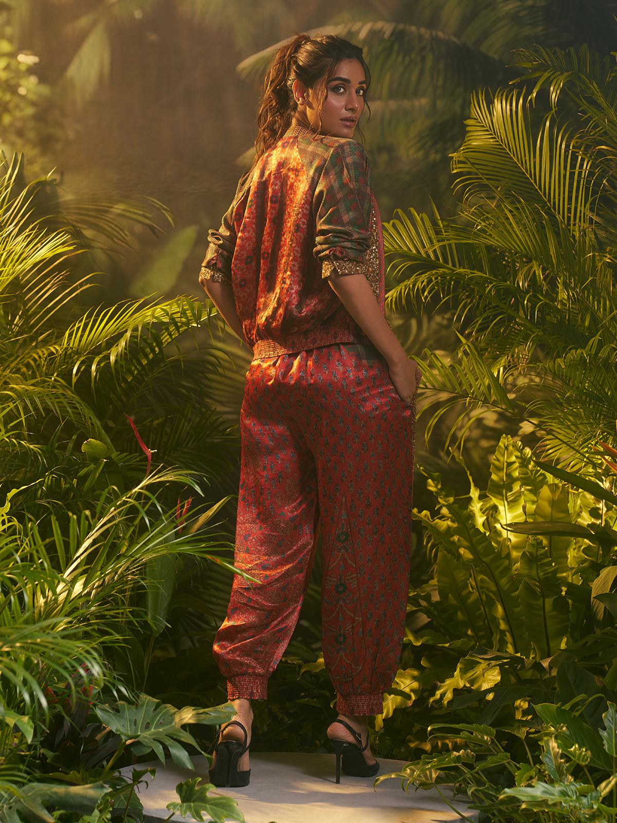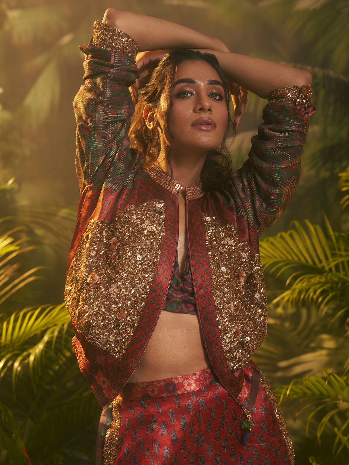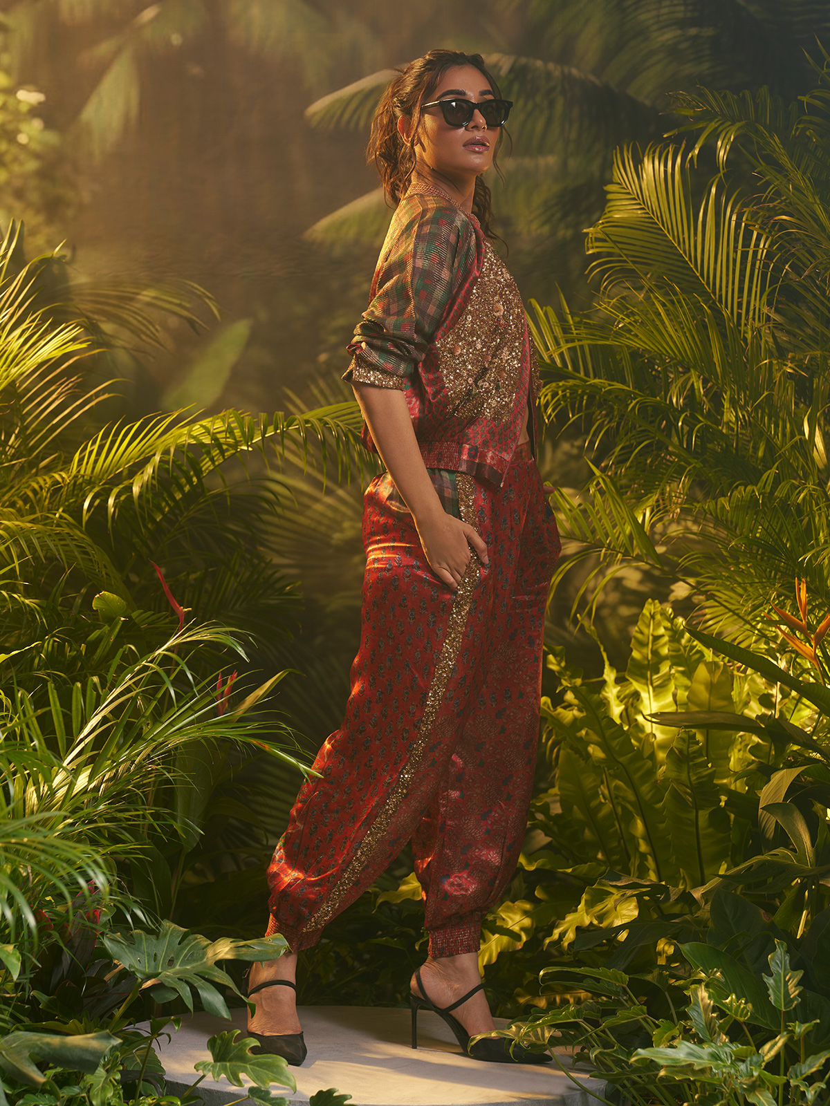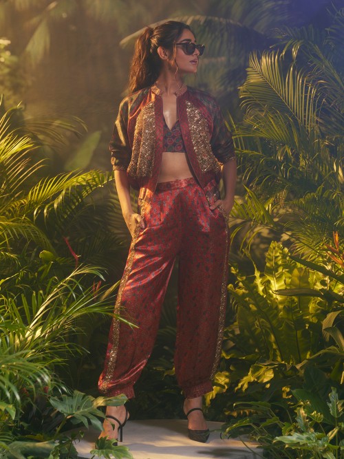 Opulent tones enrich this maroon silk jacket-style salwar suit, glowing with festive grandeur. Printed detailing sparkles with resham and sequins, creating graceful shimmer. Paired with pants, this ensemble balances tradition with sophistication, making it perfect for cultural celebrations and festive evenings.