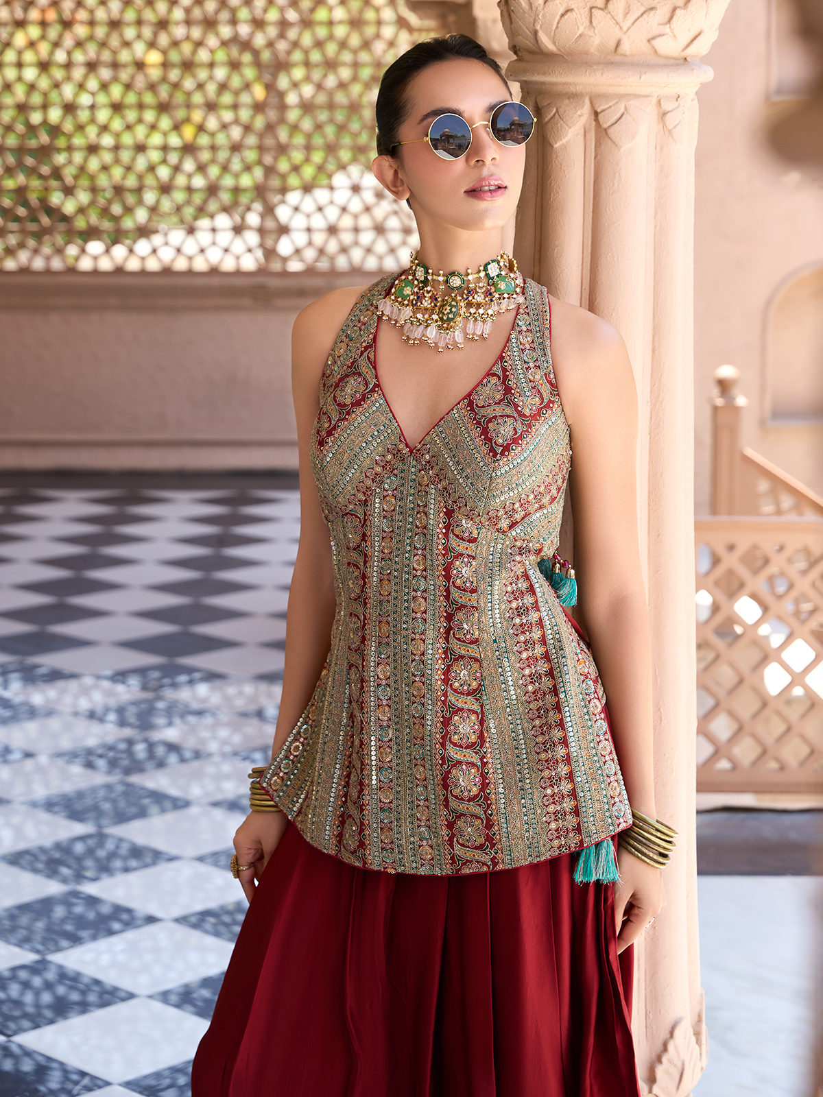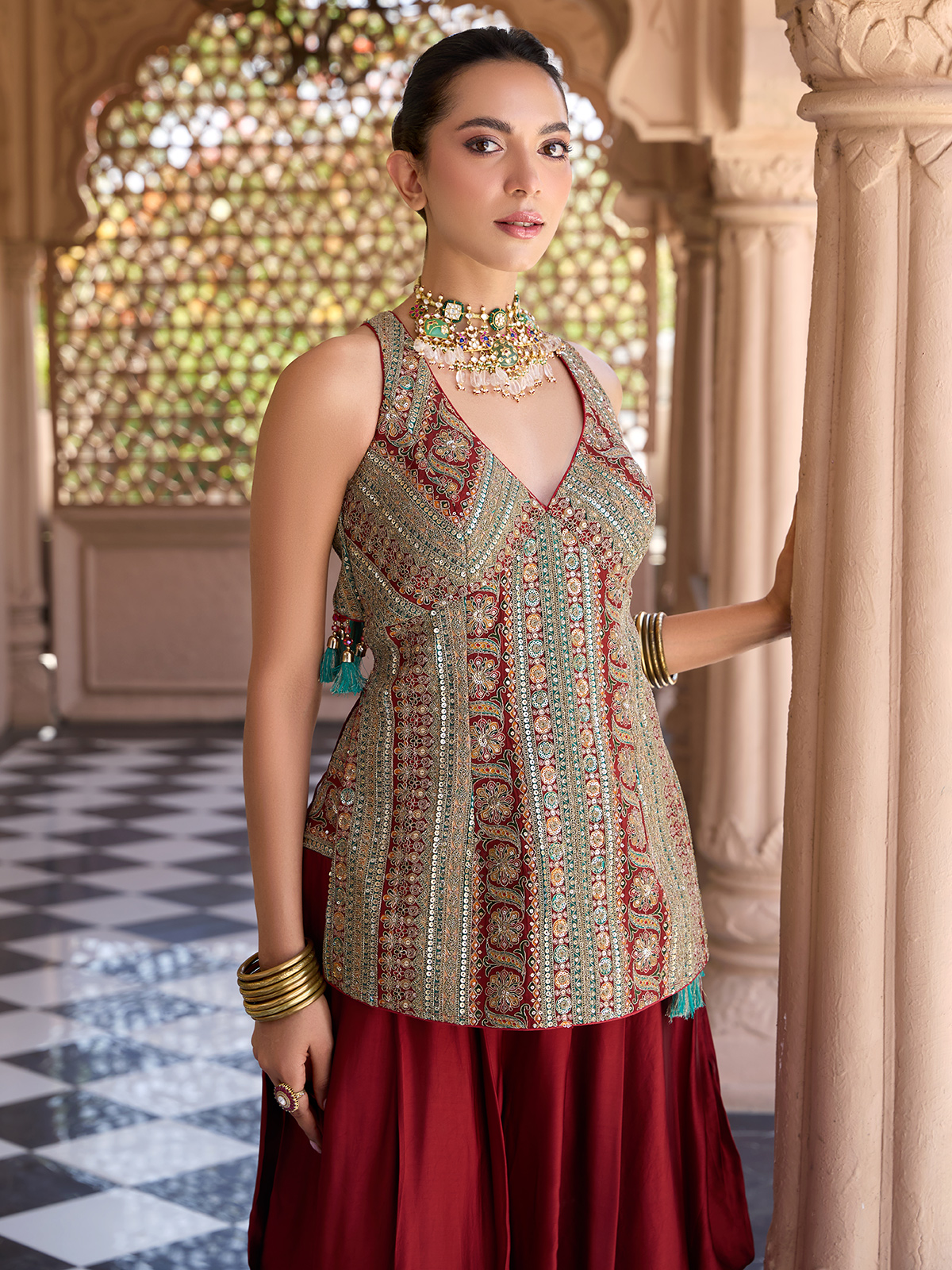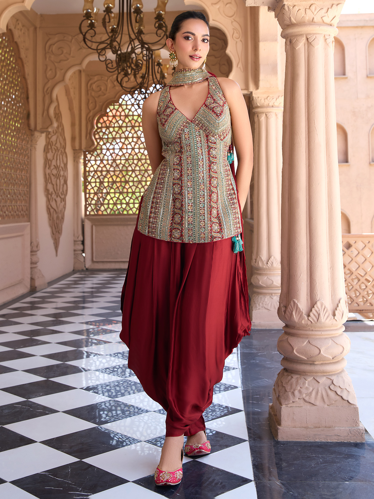 Showcase modern elegance in this maroon silk dhoti set adorned with resham and sequins work. Featuring a sleeveless V-neck kurta, it comes with a stylish dhoti and choker-style dupatta. A chic pick for weddings, sangeet nights, and festive occasions.