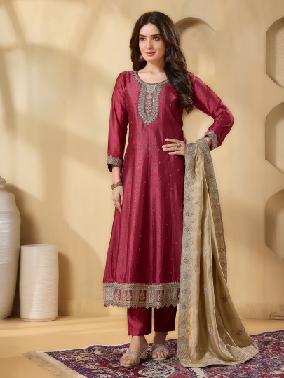 Elegant maroon silk salwar suit. Designed in a pakistani silhouette and embellished with embroidery and sequins work. Featuring a round neckline and quarter sleeves, it comes paired with a contrast dupatta and pant for weddings and festive celebrations.