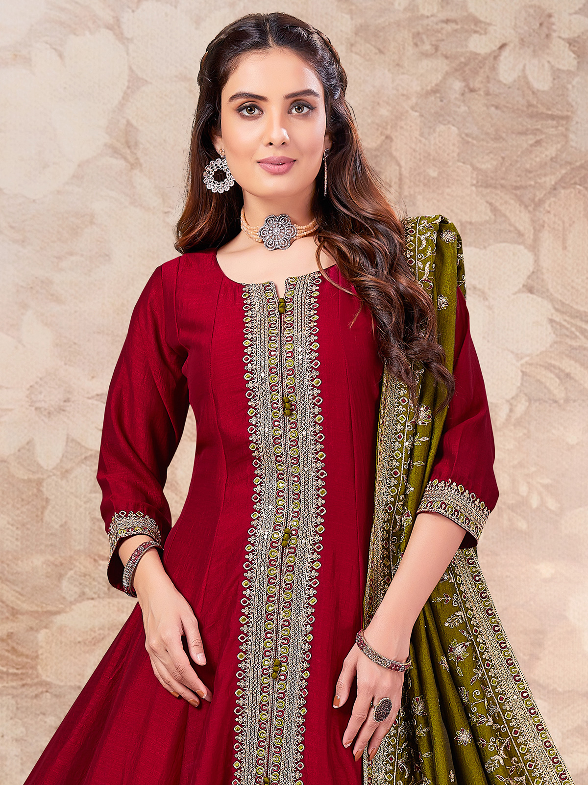 This maroon silk salwar suit is beautifully adorned with resham and sequins embroidery. Featuring quarter sleeves with a round neckline, it comes with dupatta and pant. Perfect for weddings and festive celebrations, this elegant outfit captures a regal appeal while maintaining traditional charm.