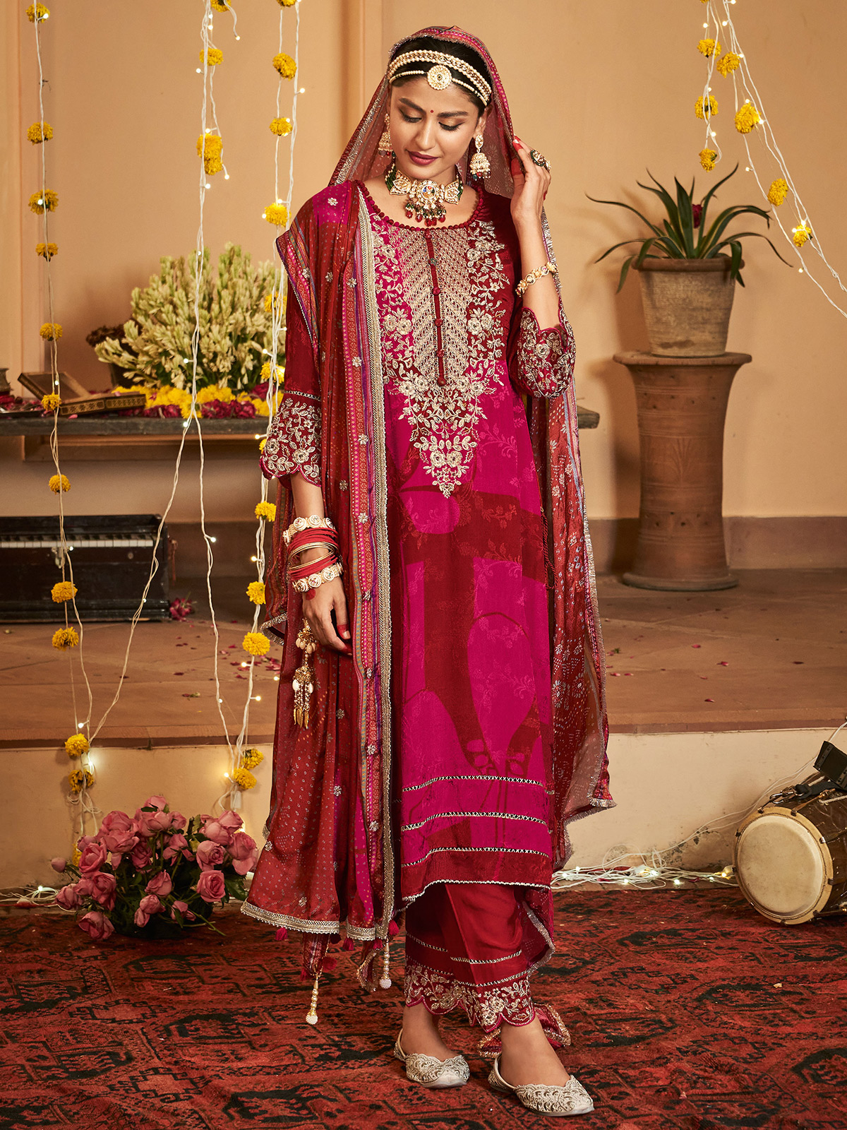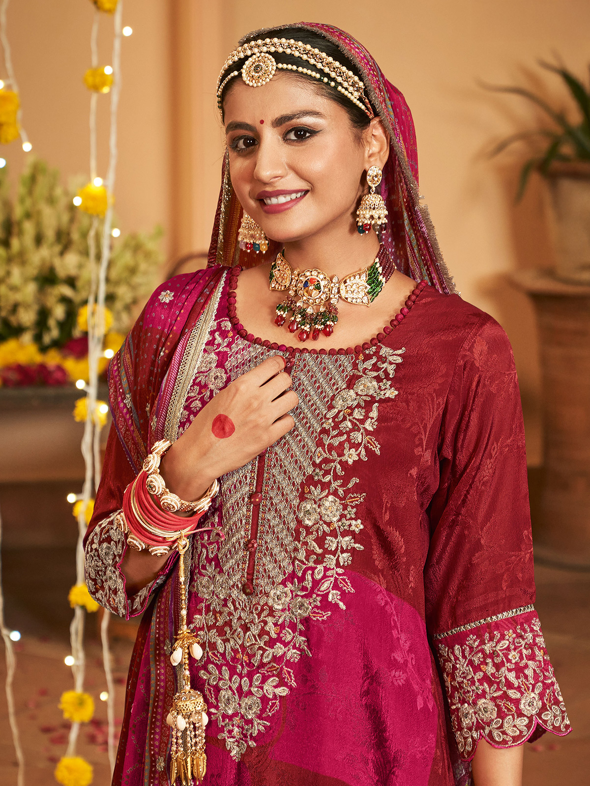 Celebrate tradition in this rich maroon silk salwar suit adorned with delicate resham work. A round neck and quarter sleeves enhance the ethnic charm, balanced by coordinating pant and dupatta.