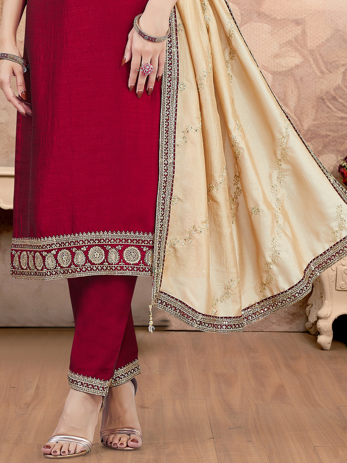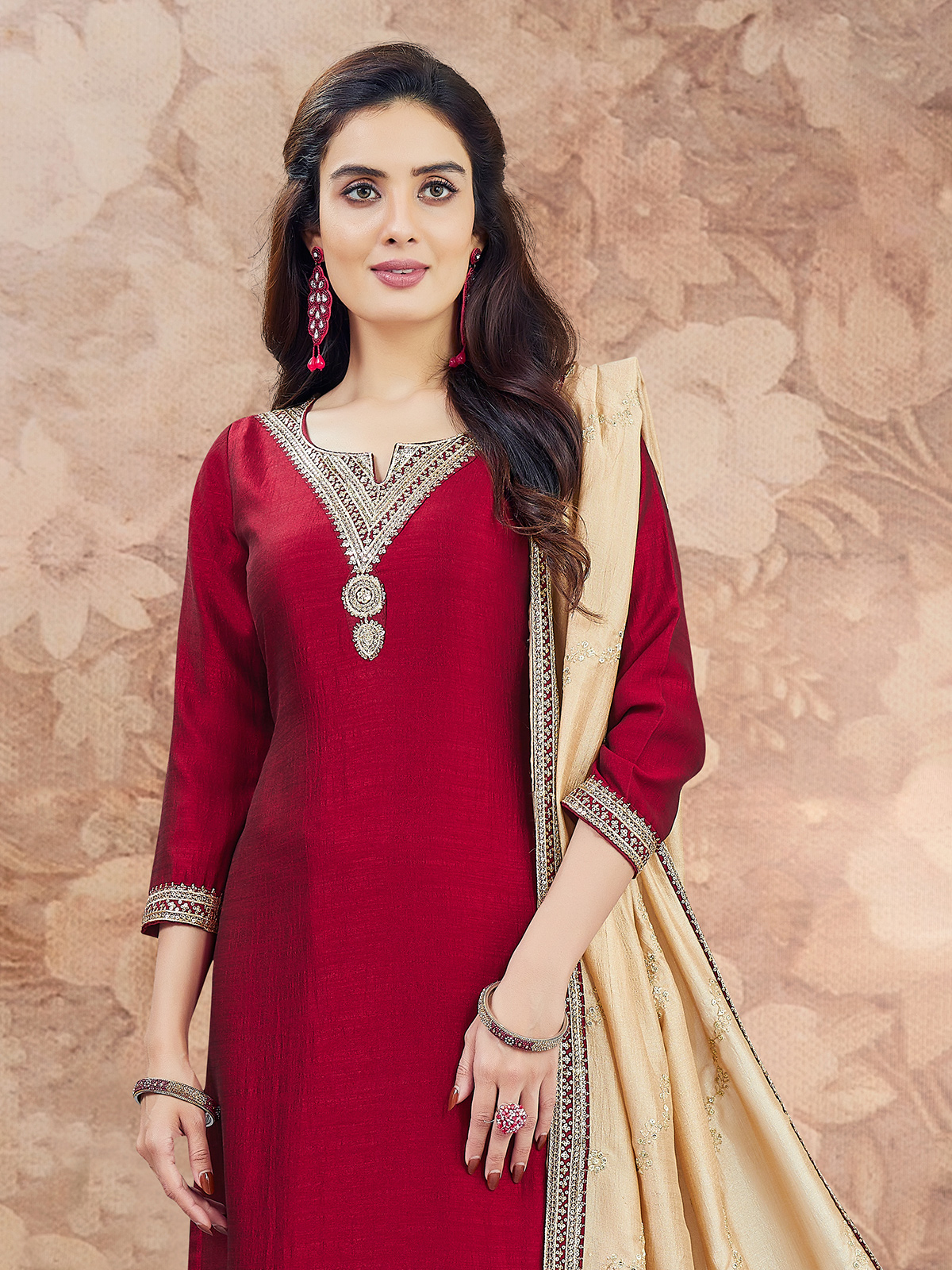 Revel in traditional grandeur with this maroon silk straight-cut salwar suit, dazzling with sequins embroidery. The graceful quarter sleeves elevate its charm, while sleek pants and a beige dupatta frame a look of radiant sophistication for special gatherings.