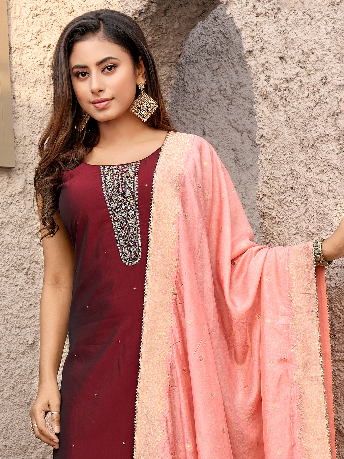 Presenting this effortlessly alluring straight-cut maroon silk salwar suit, which is a must-have for any wardrobe. It features a seductive round neck and sleeveless design and is embellished with zardosi, aabla, sequins, resham, and thread work. Includes a dupatta.