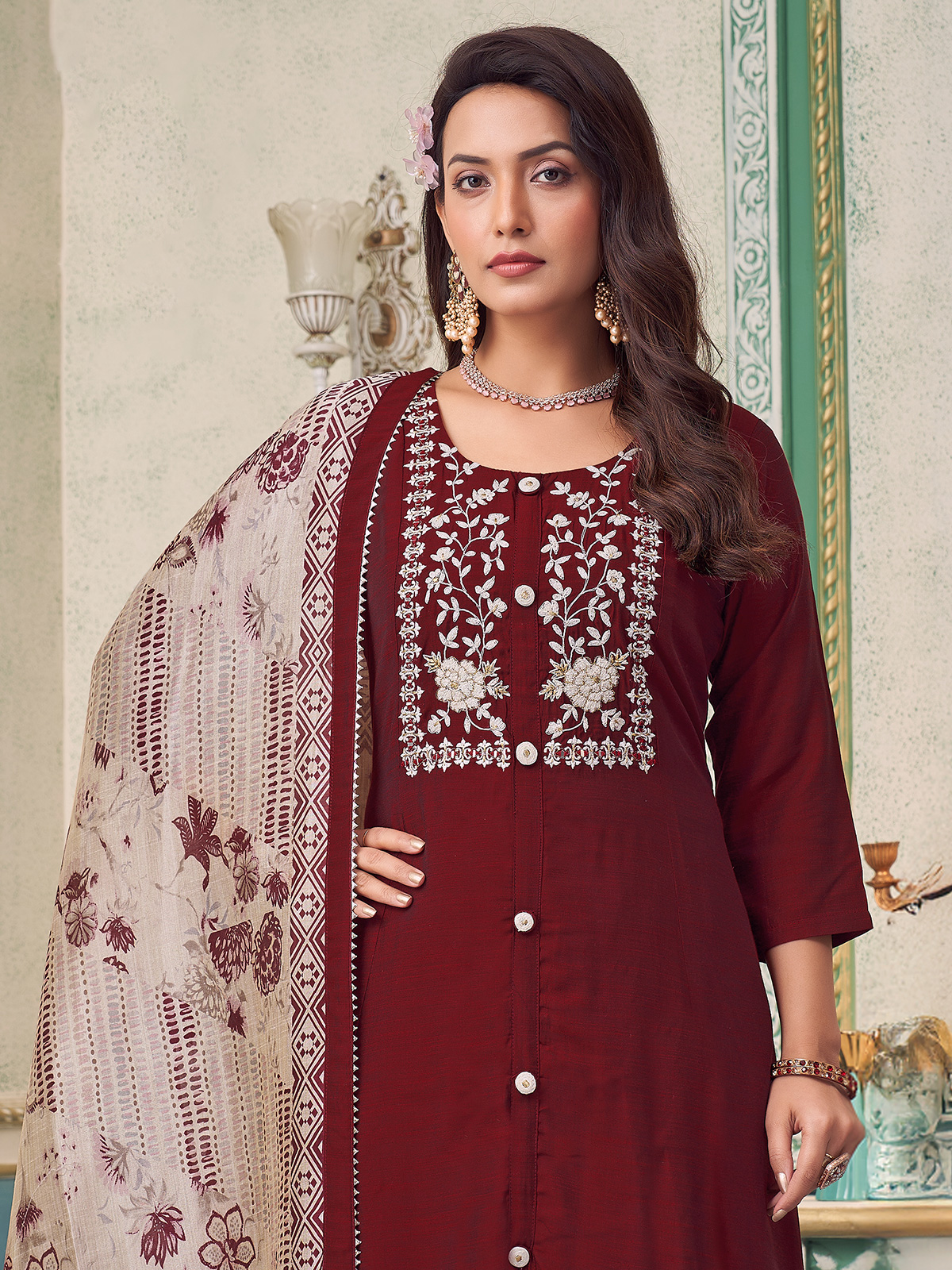 Traditional with modern grace, this maroon silk suit features resham embroidery. Quarter sleeves, round neckline, pants, and a dupatta complete this elegant festive outfit.