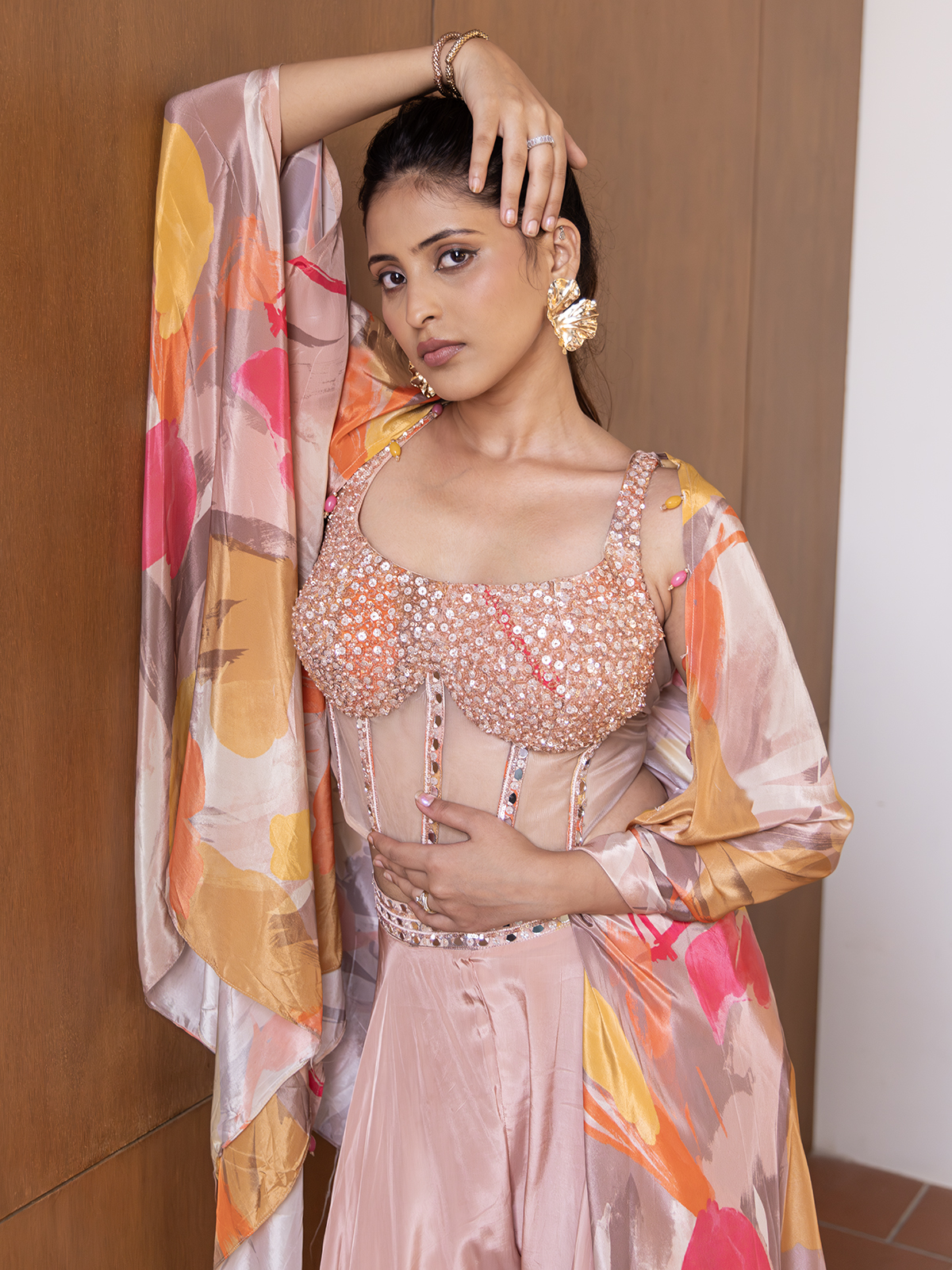 This mauve pink printed silk palazzo suit glows with soft sophistication, accented by mirror, beads and sequins that sparkle like dawn-lit reflections. Paired with a graceful long shrug that adds a chic layered silhouette, it becomes a beautiful pick for festive evenings and refined wedding celebrations.
