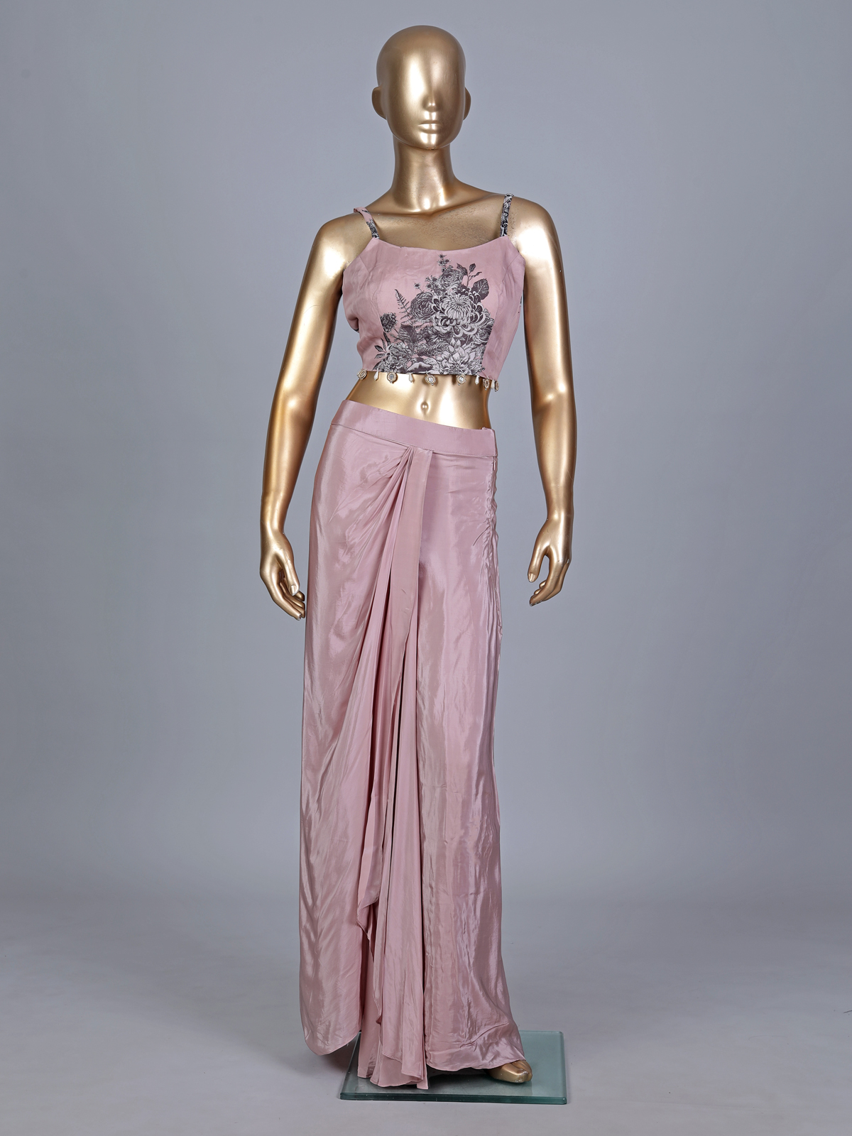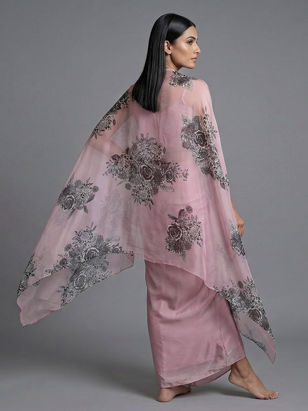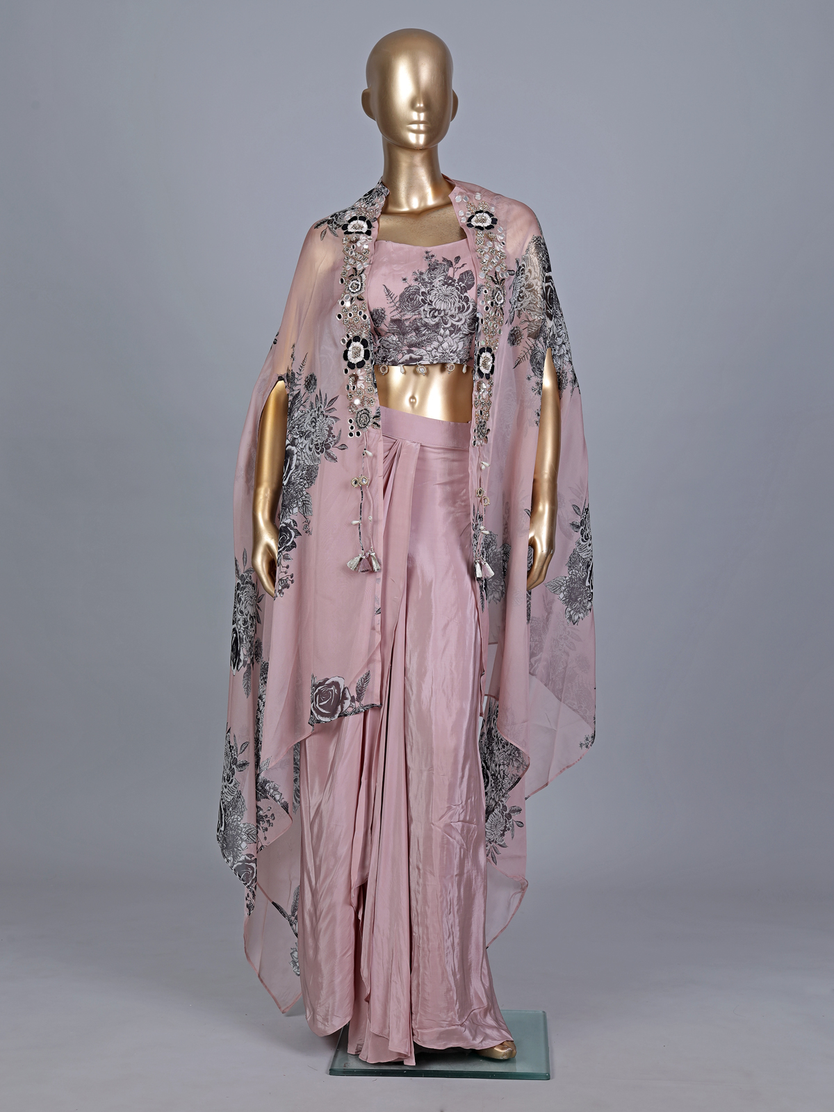 Turn heads in this mauve purple silk Indo-western ensemble styled with a graceful long shrug. Detailed with mirror, cutdana, zardosi and bead embellishments, it offers a glamorous festive appeal, perfect for receptions, parties and contemporary ethnic styling.