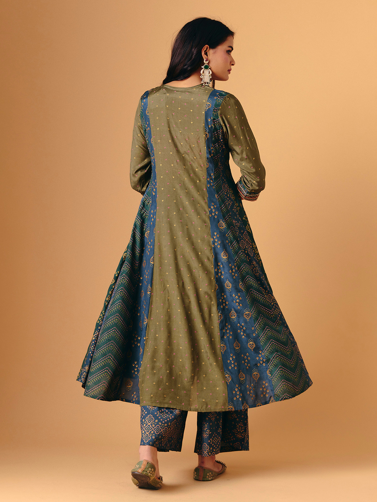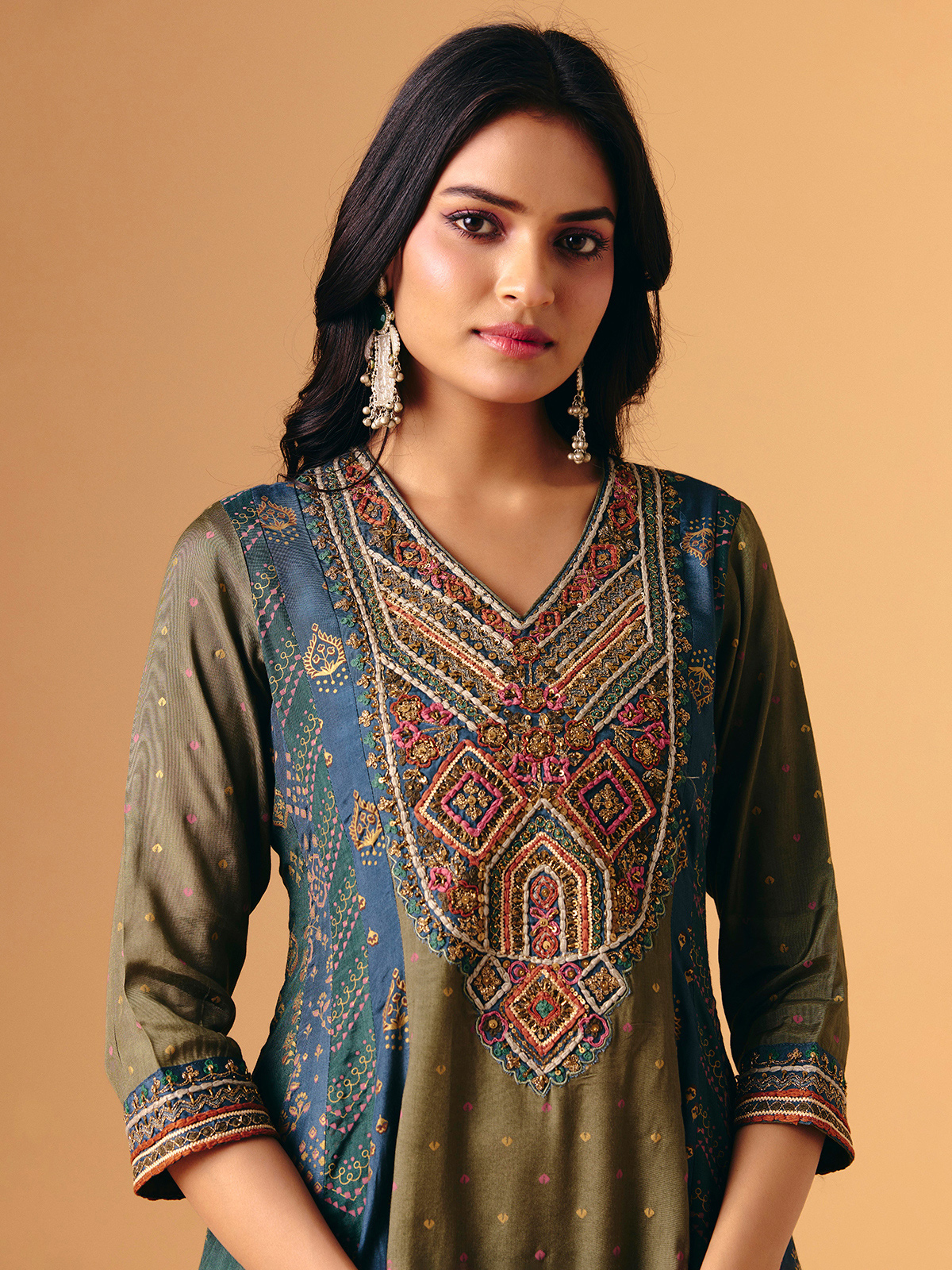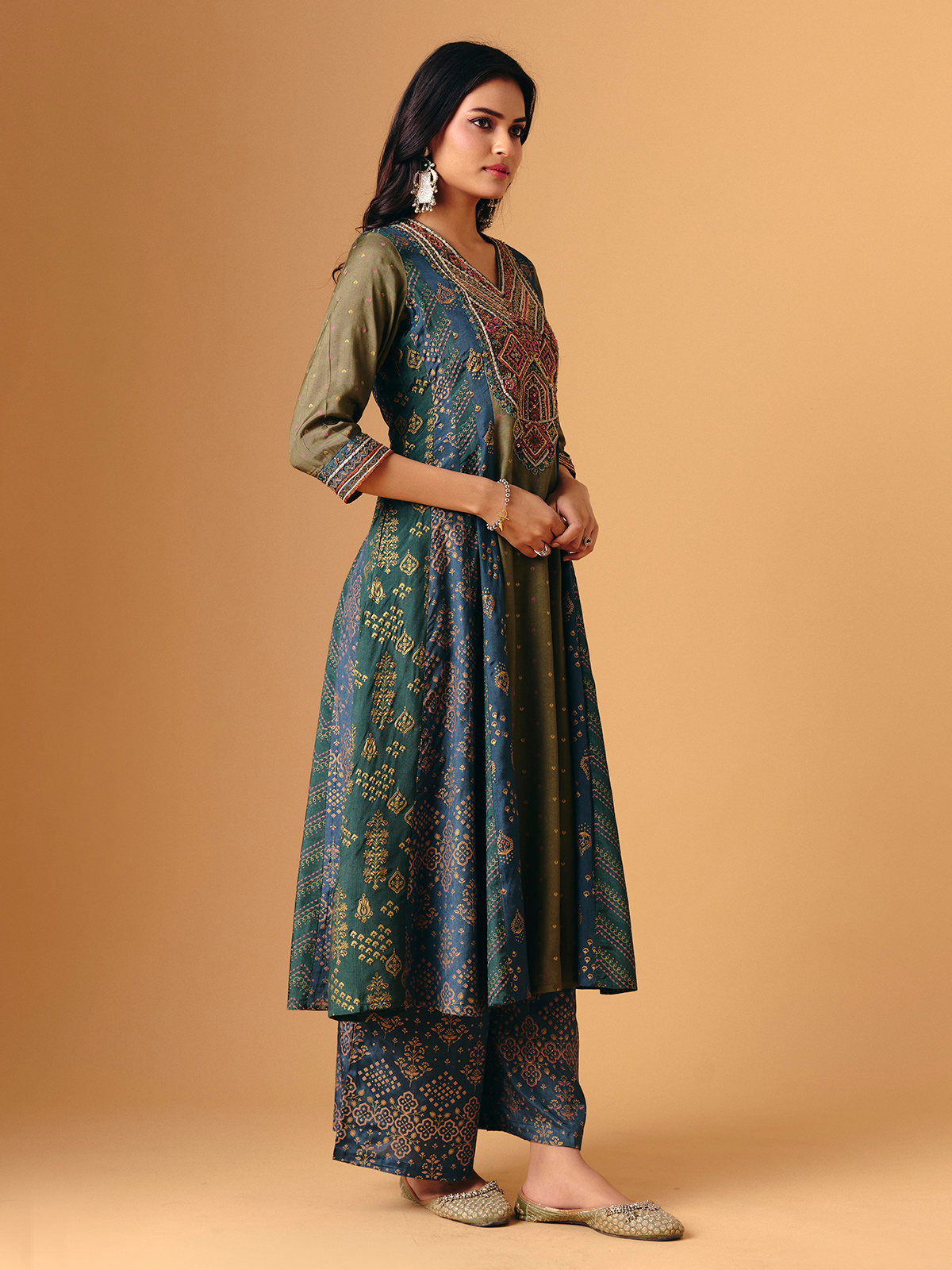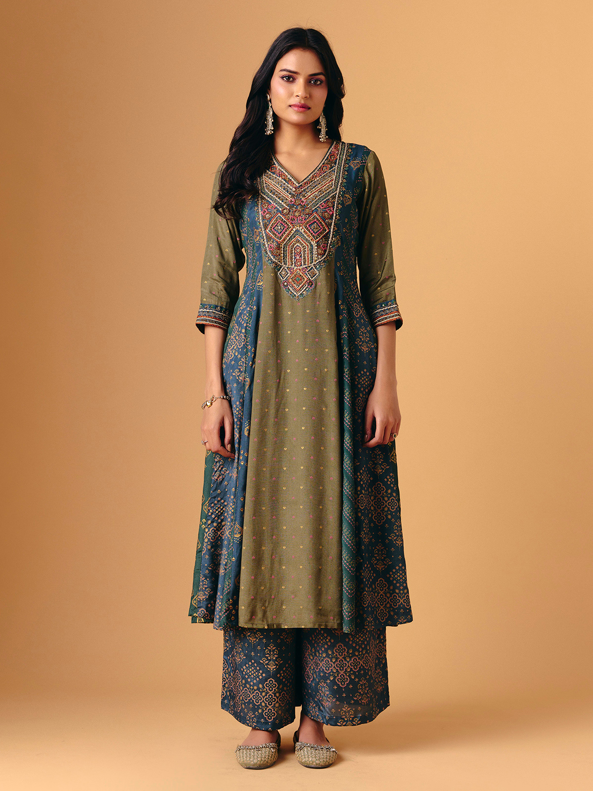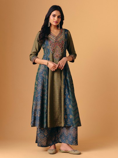 Printed mehendi green cotton silk forms this palazzo suit, enhanced with thread, sequins, cutdana, and resham work. V-neckline and quarter sleeves create delicate balance, while flowing palazzo bottoms lend graceful movement. Completed with a matching dupatta, it radiates festive artistry, lightweight elegance, and handcrafted charm, perfect for sangeet, festive, and eid occasions.