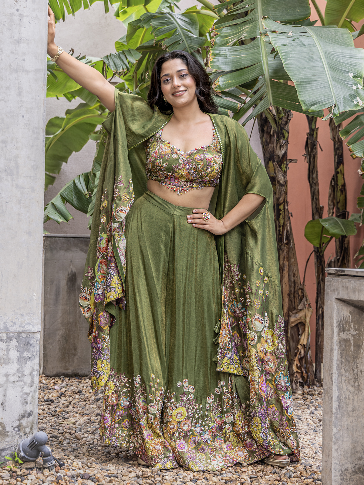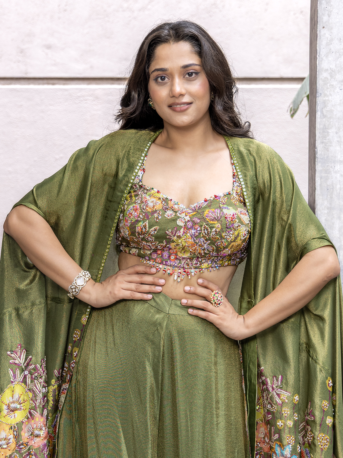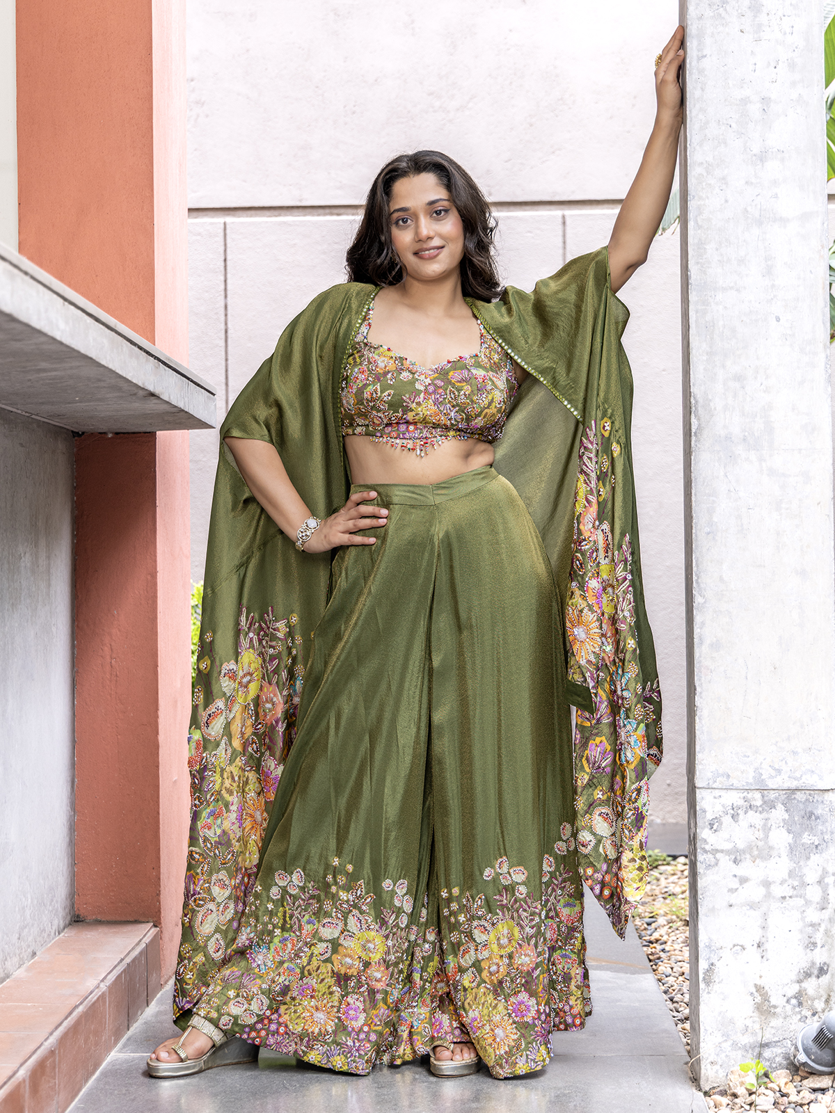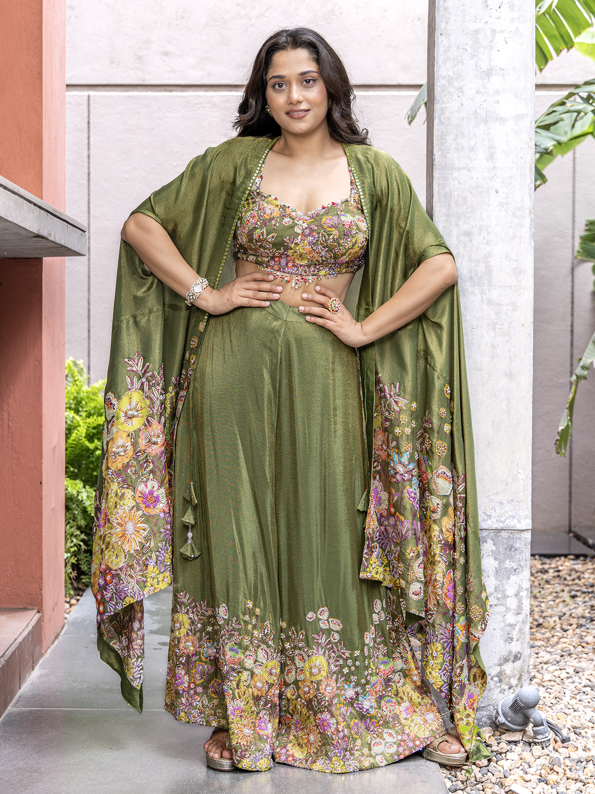Crafted to reflect traditional richness, the mehendi green palazzo suit dazzles with detailed zardosi, sequins, beads and cutdana work. A long decorated palazzo complete the look flolessly, paired with a beautifully printed maroon dupatta for added visual appeal.