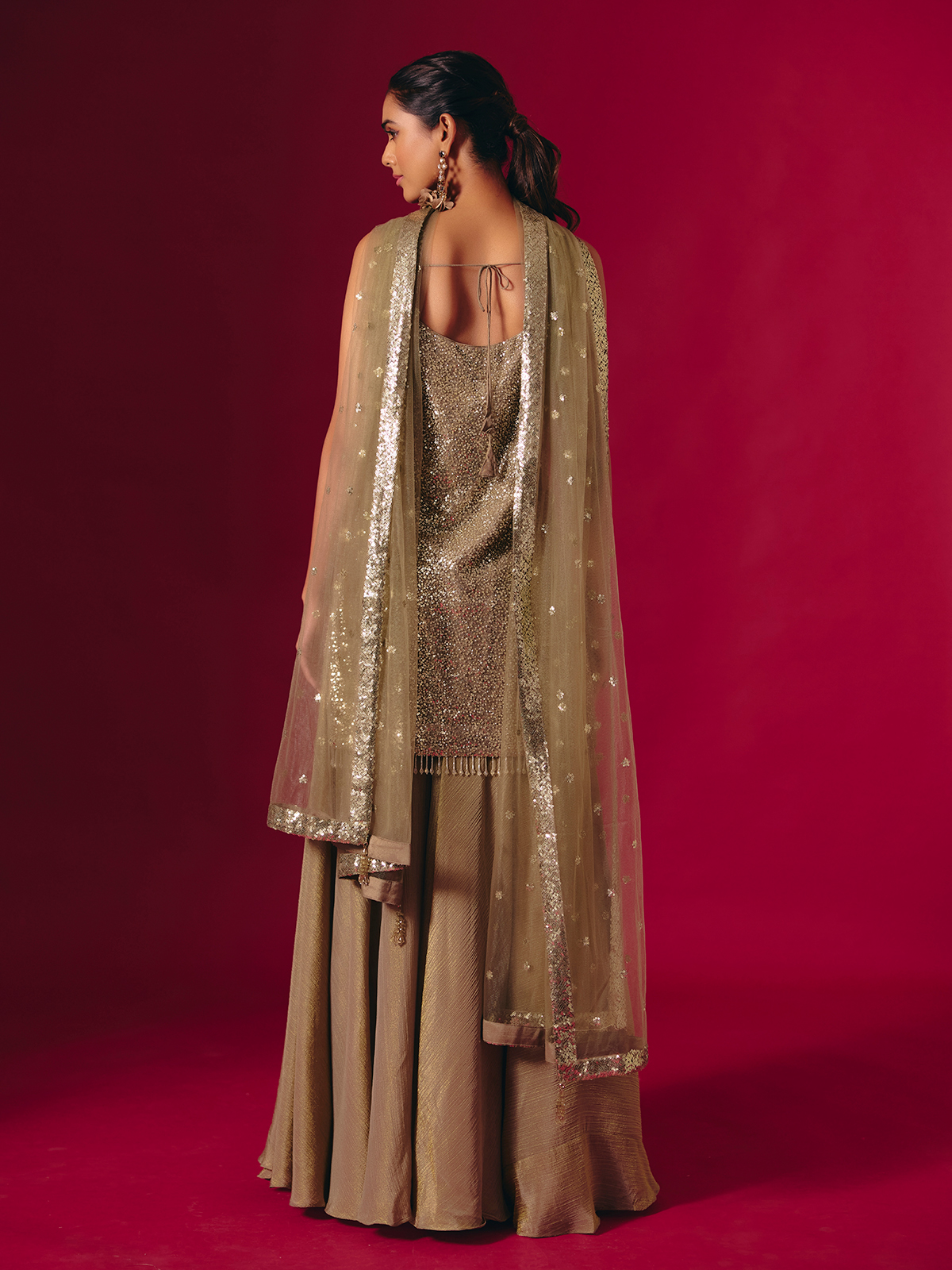 Revel in mehendi magic with this green georgette palazzo suit shimmering with sequins and cutdana highlights. Styled with a sleeveless round-neck blouse and matching dupatta, it’s the ideal ensemble for mehendi, festive and wedding gatherings.