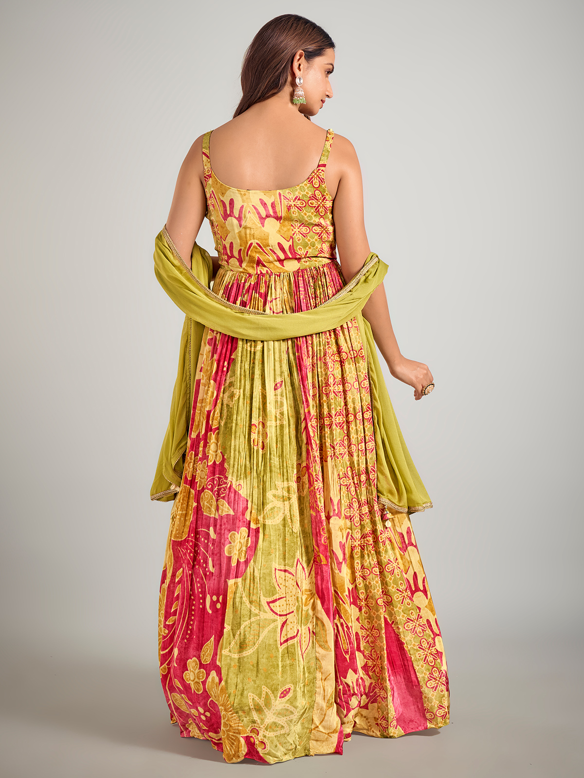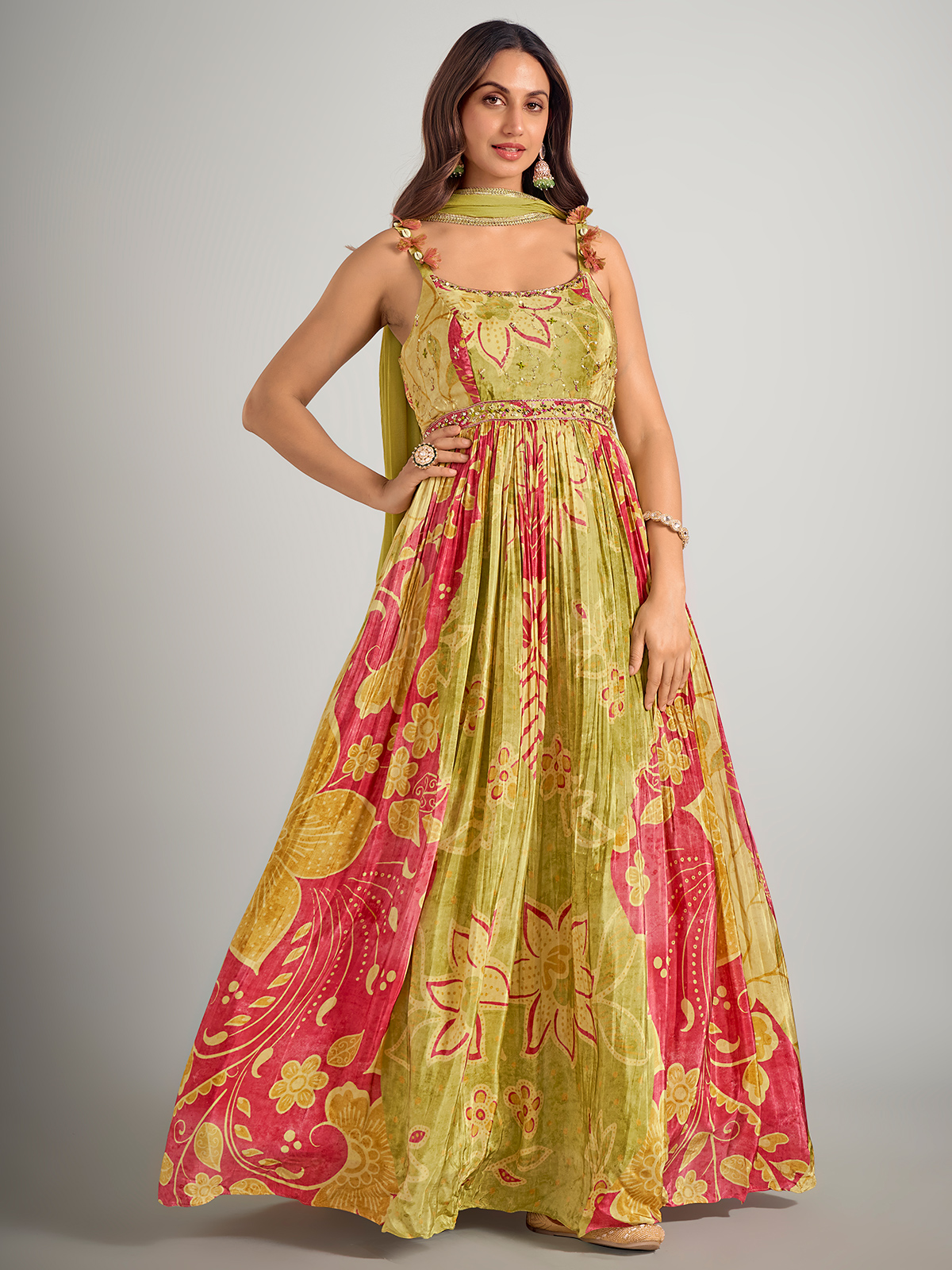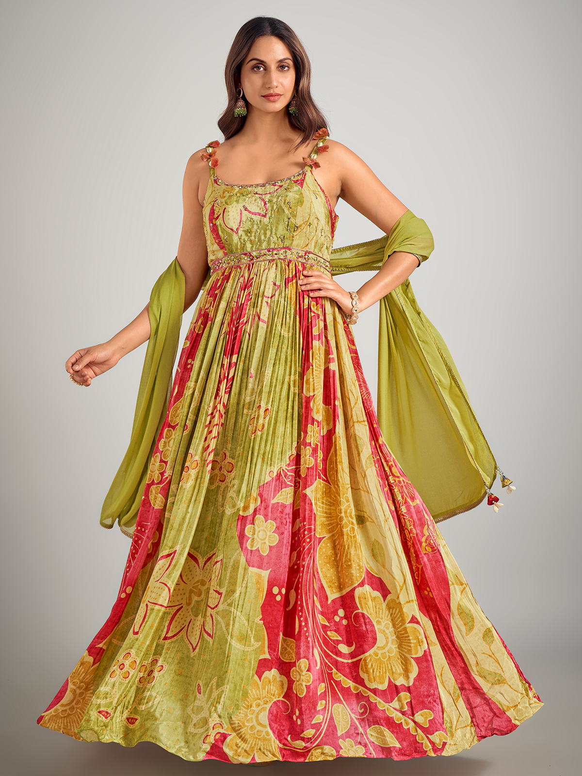 During wedding season, this designer suit with an Android silk print is a must-have. It is sophisticated and embellished with thread, beads, zardosi, and sequins. Includes a dupatta.