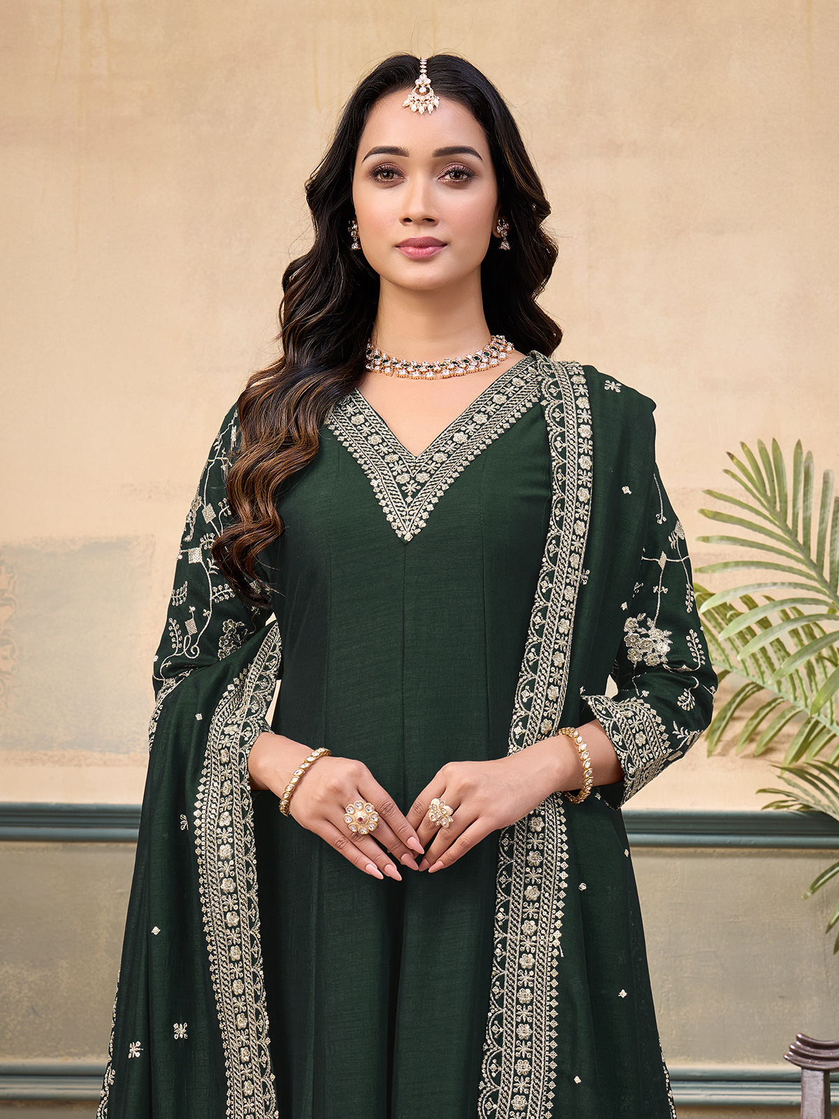 Earthy mehendi green tones highlight the beauty of this silk anarkali salwar suit designed for wedding and festive celebrations. Featuring a V neckline with quarter sleeves. The kurti is enhanced with resham and sequin detailing that adds traditional charm. Paired with pants and a dupatta. The ensemble creates a rich and elegant festive silhouette.