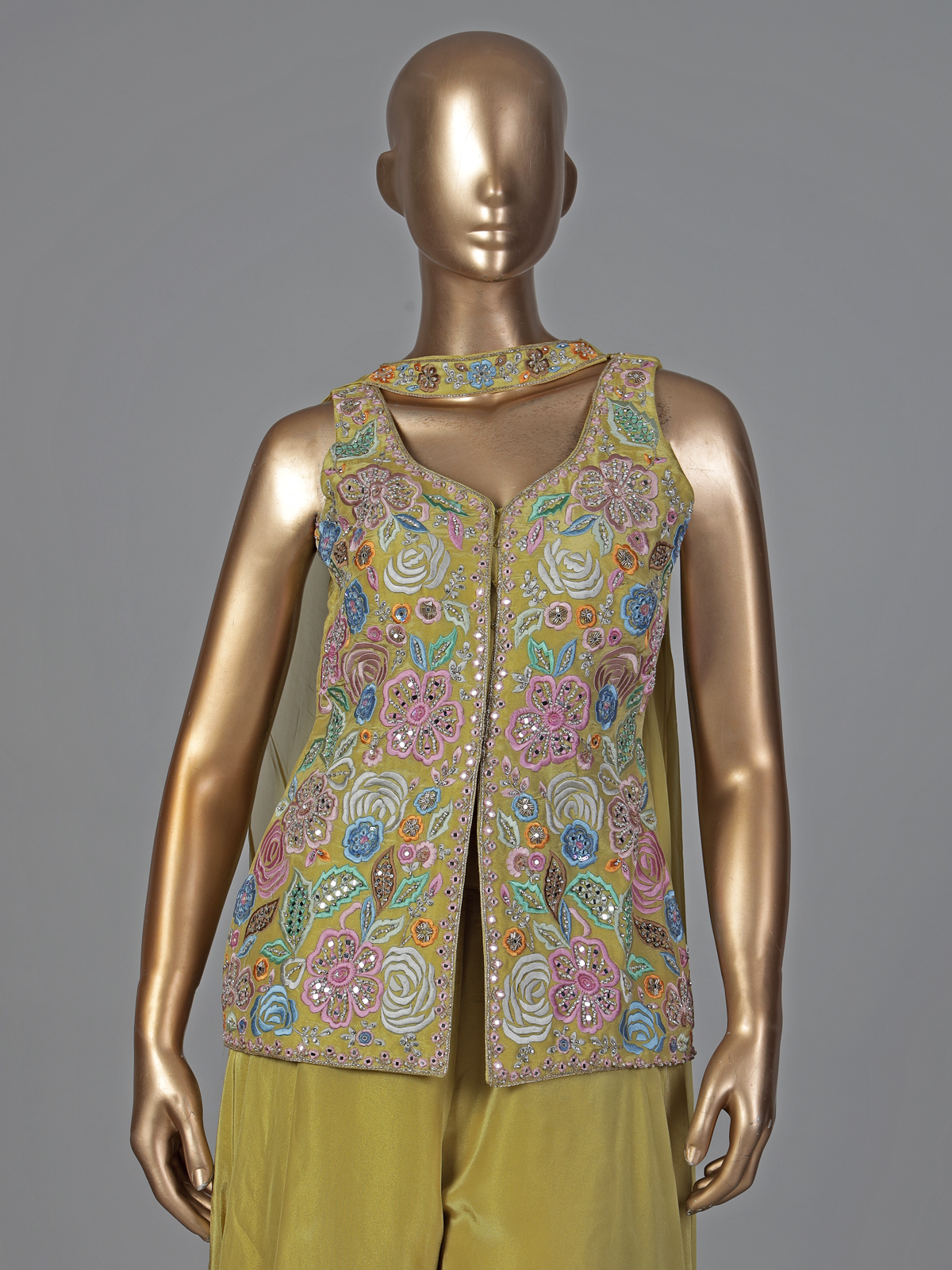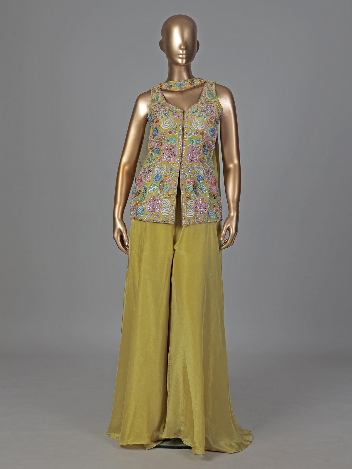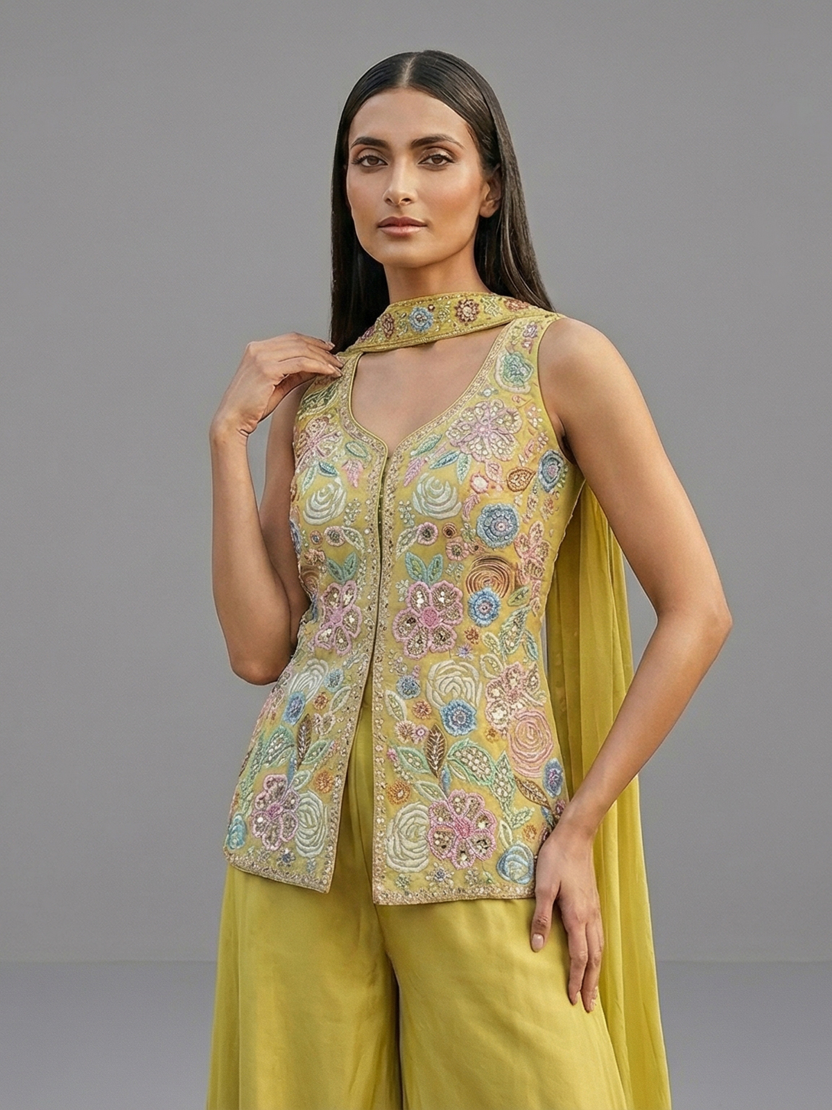 Vibrant mehendi green silk palazzo suit. Sowcases embroidery, cutdana, beads, pearls and diamond accents. The sweetheart neckline and sleeveless design add modern elegance, perfect for weddings and festive gatherings.