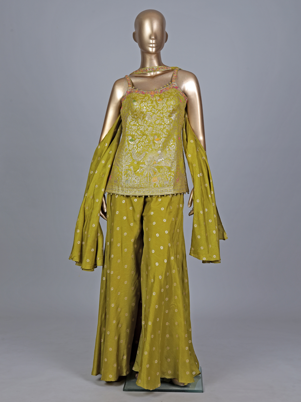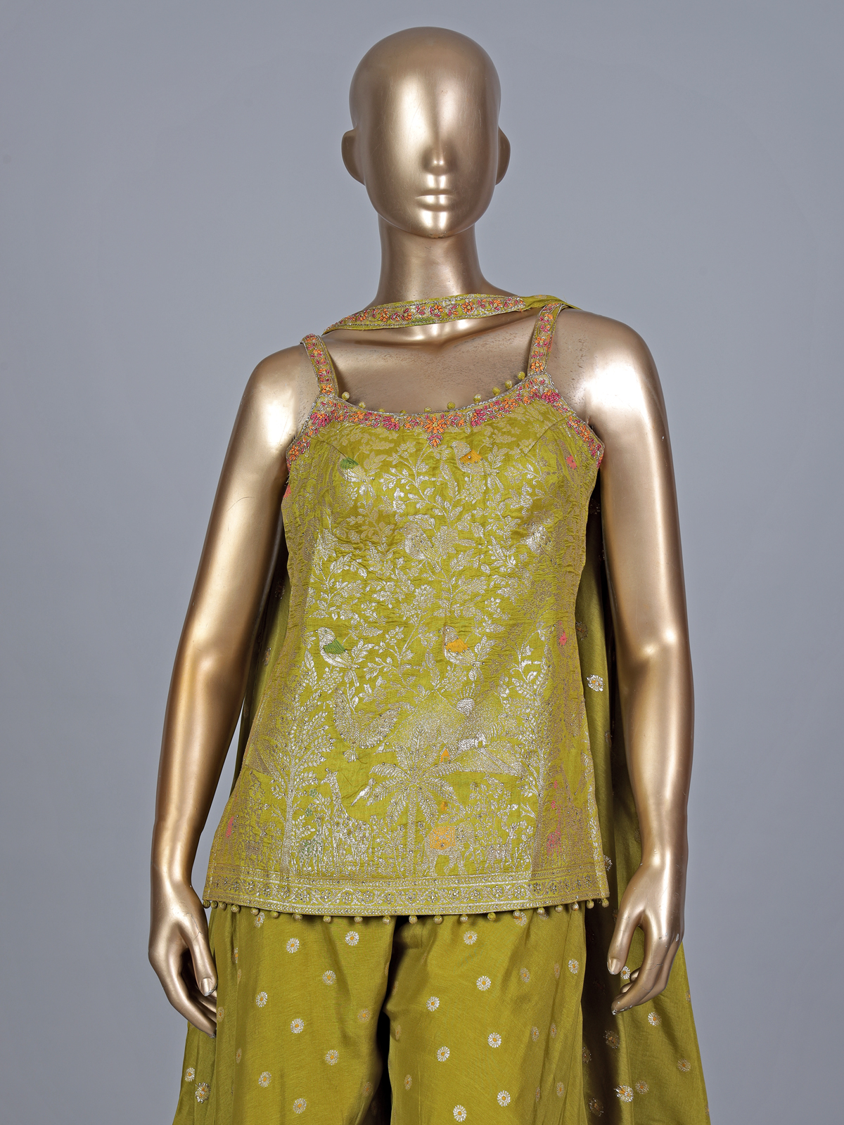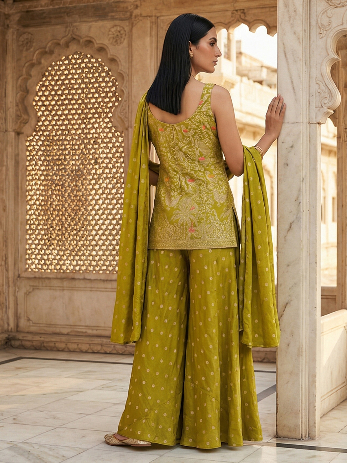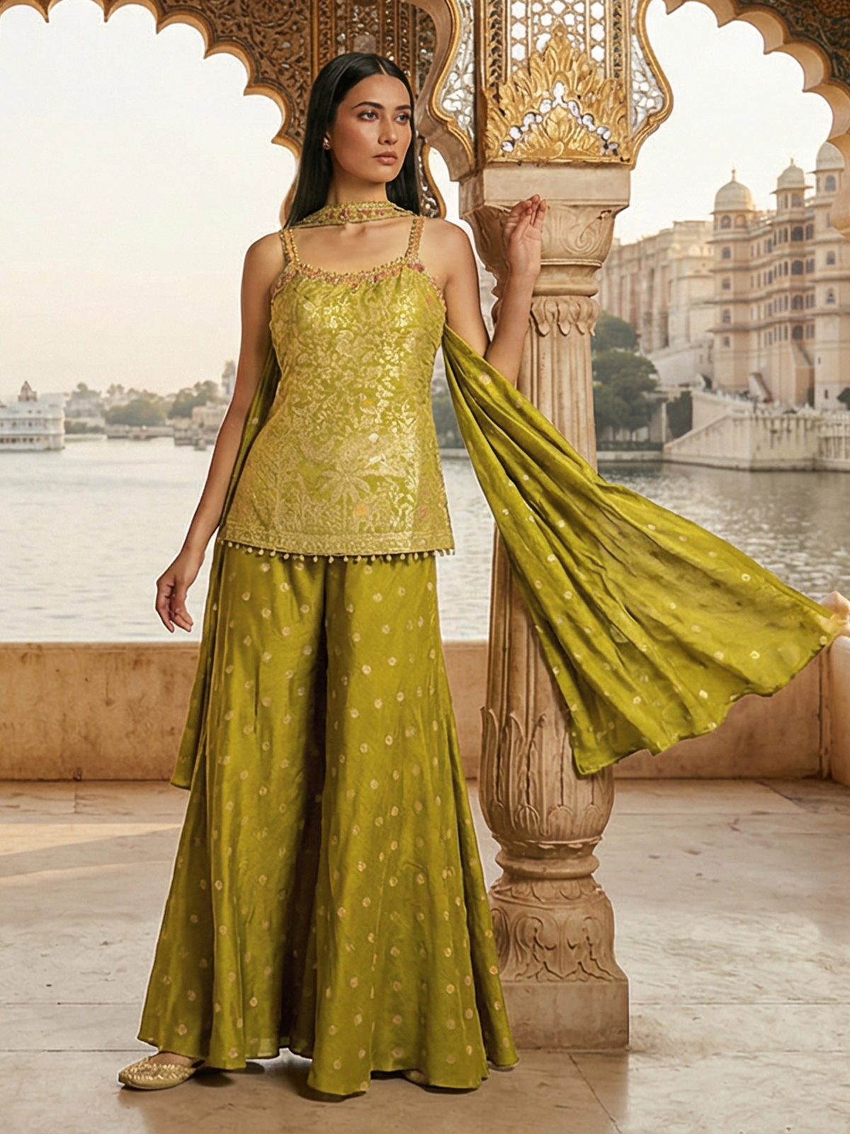 Glow with vibrant charm in this mehendi green silk palazzo suit, detailed with cutdana, zardosi, thread, stone and zari embellishments. The sleeveless silhouette with a round neckline adds modern appeal, while the dupatta completes this elegant ensemble, ideal for mehendi, sangeet and festive occasions.