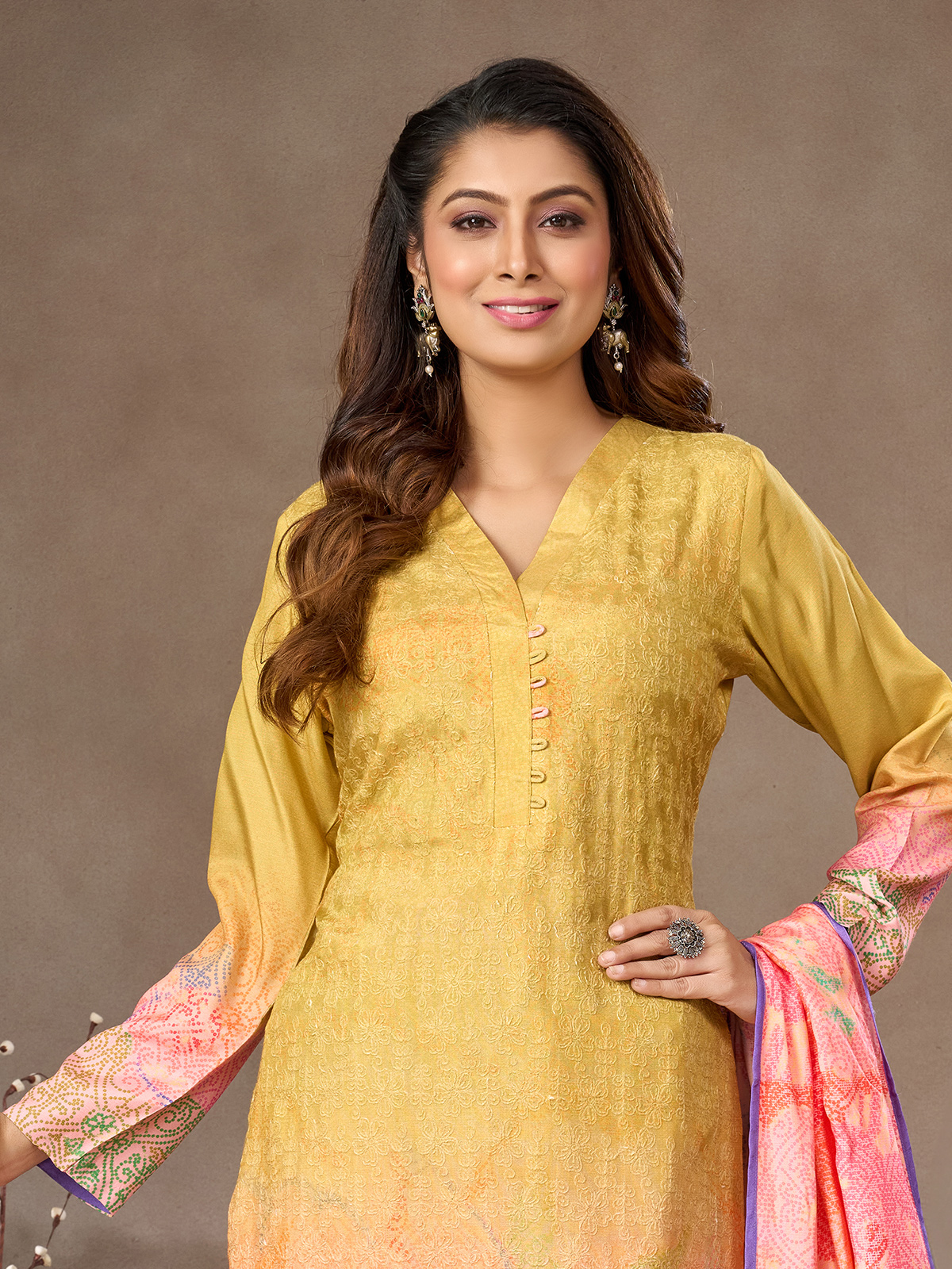 Mehendi yellow cotton silk suit featuring thread weaving and a V neckline. Designed with full sleeves and a dupatta, this set brings earthy elegance to festive or mehendi occasions.