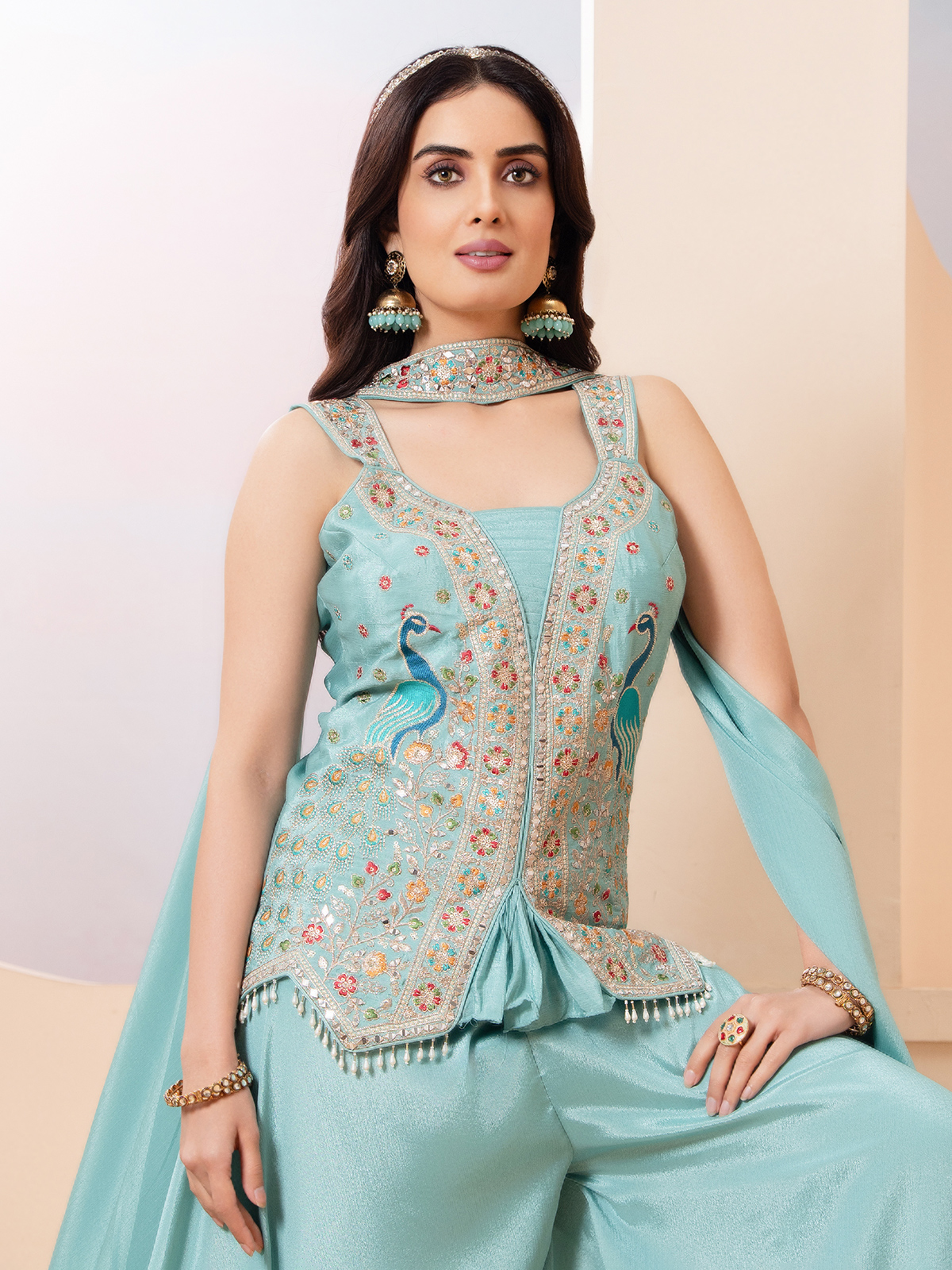 Crafted in soft mint blue silk designer palazzo suit is enriched with embroidery, sequins, pearls, beads and aabla work. Styled with a round neckline and sleeveless silhouette, it is paired with a dupatta and palazzo, perfect for weddings, festive celebrations and elegant sangeet evenings.