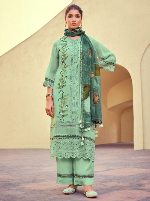 Create a trendy ethnic look with this mint blue organza palazzo suit. Adorned with resham embroidery and cutwork, it features a V neckline and quarter sleeves. Finished with a coordinating pant and bold printed dupatta.