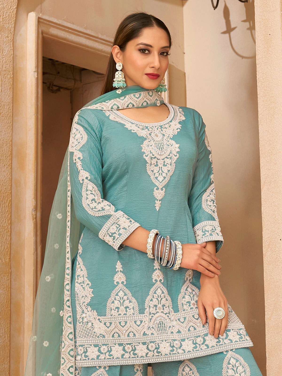 This mint blue chiffon silk Pakistani palazzo set shimmers with cutdana, embroidery, zardosi, and sequins work. Styled with a round neckline and quarter sleeves, and paired with a soft net dupatta, it exudes modern elegance, perfect for weddings and Diwali festivities.