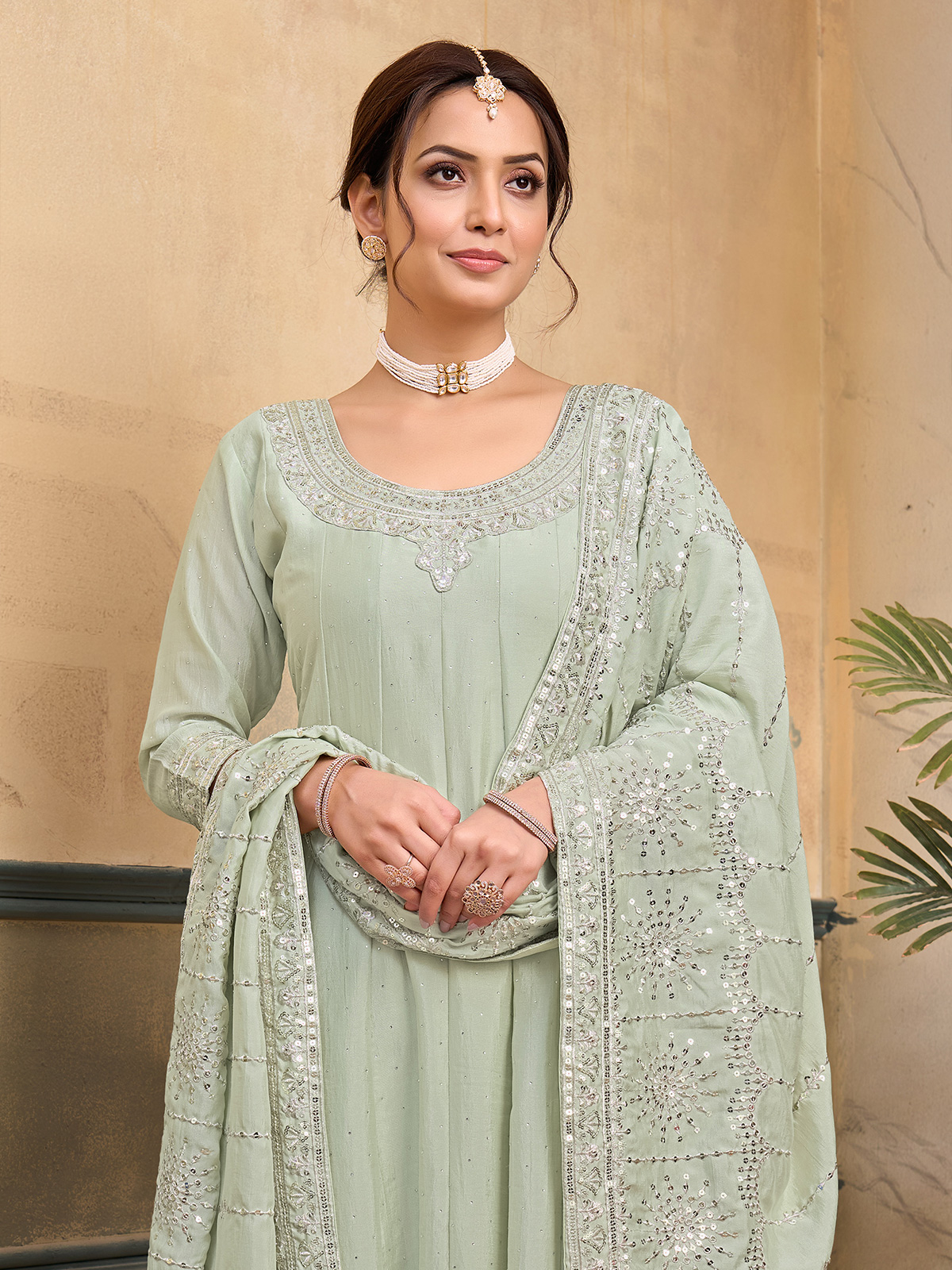 Mint Green Chiffon Silk Anarkali Festive Embroidered Suit