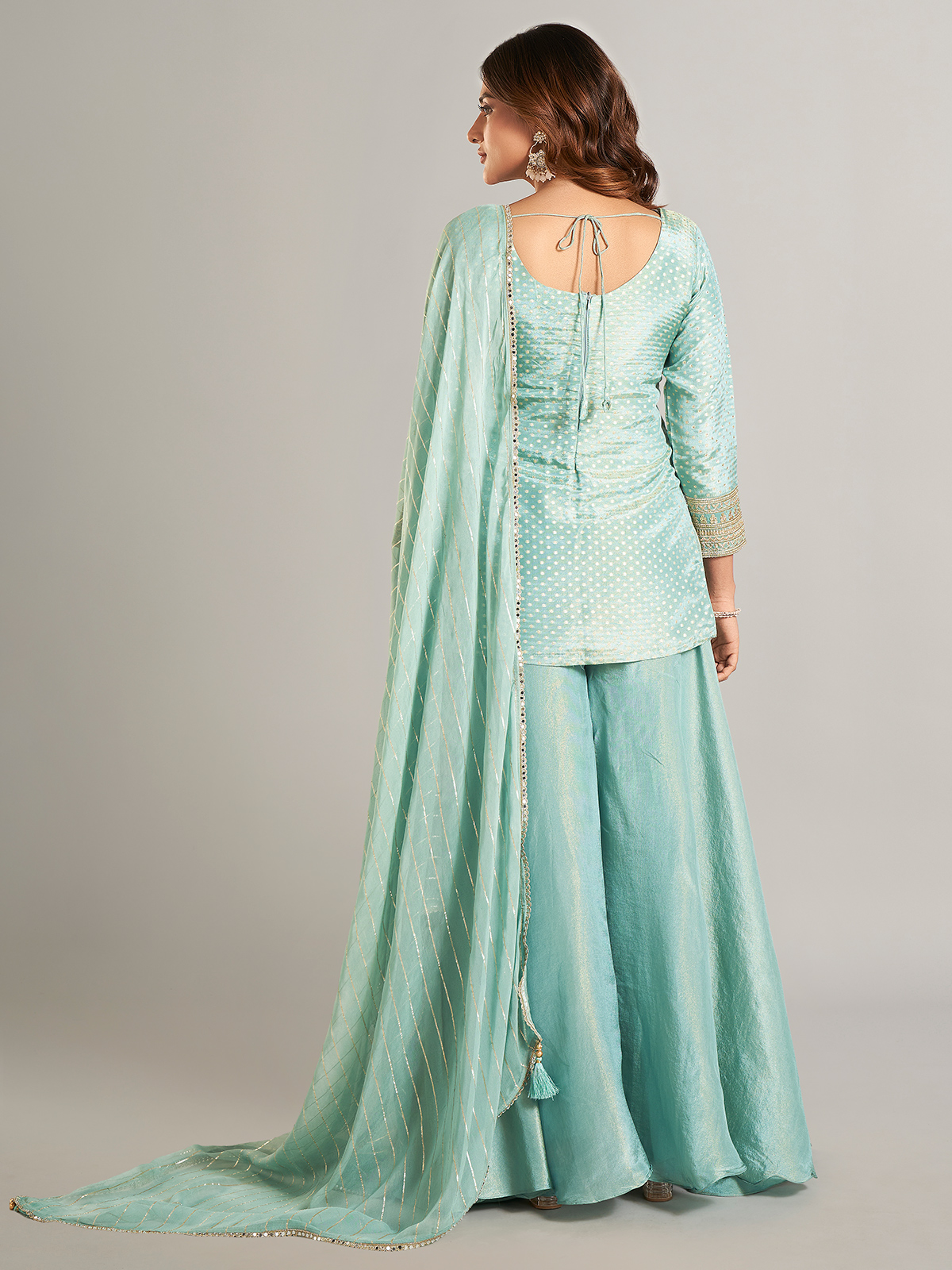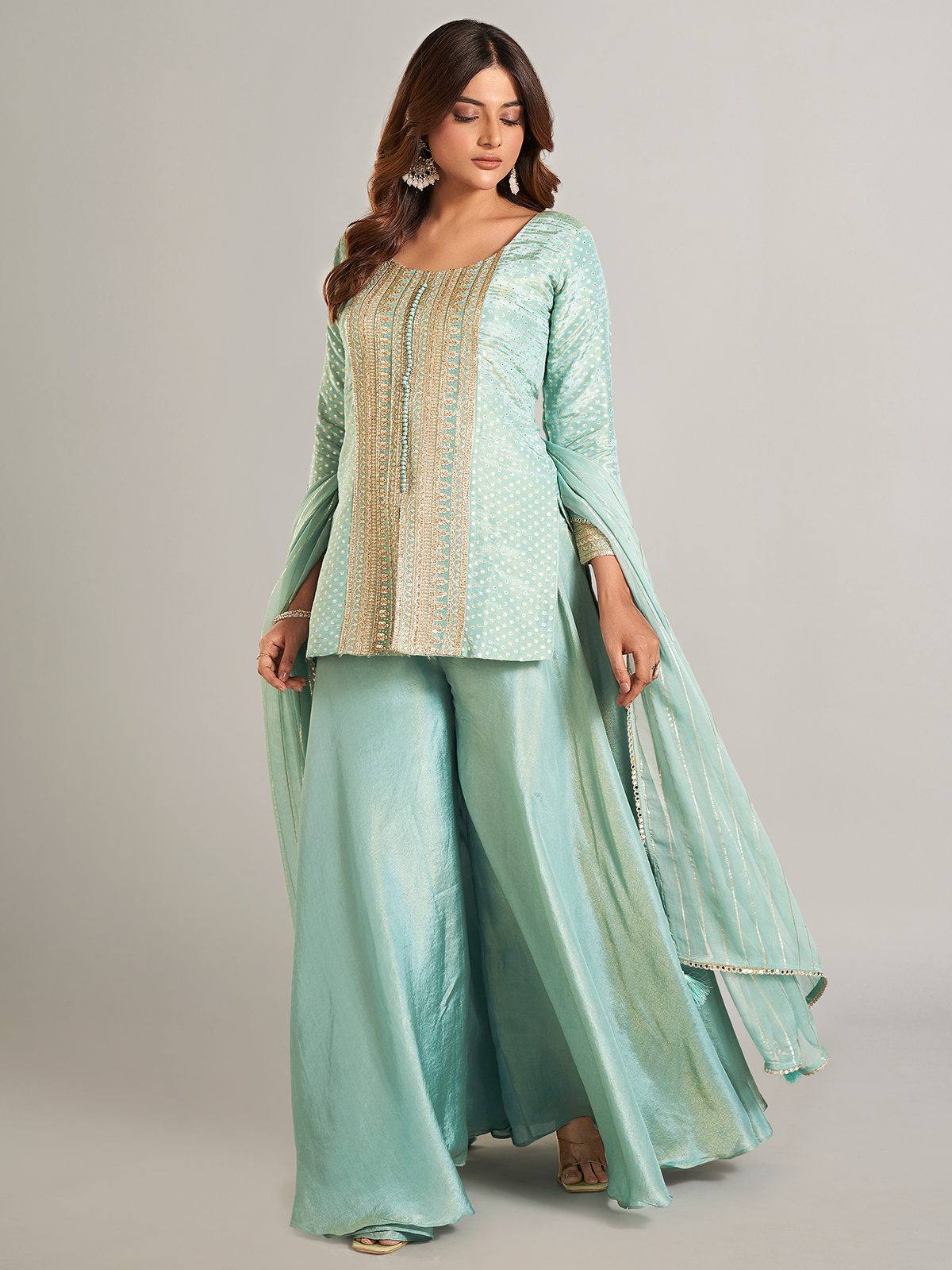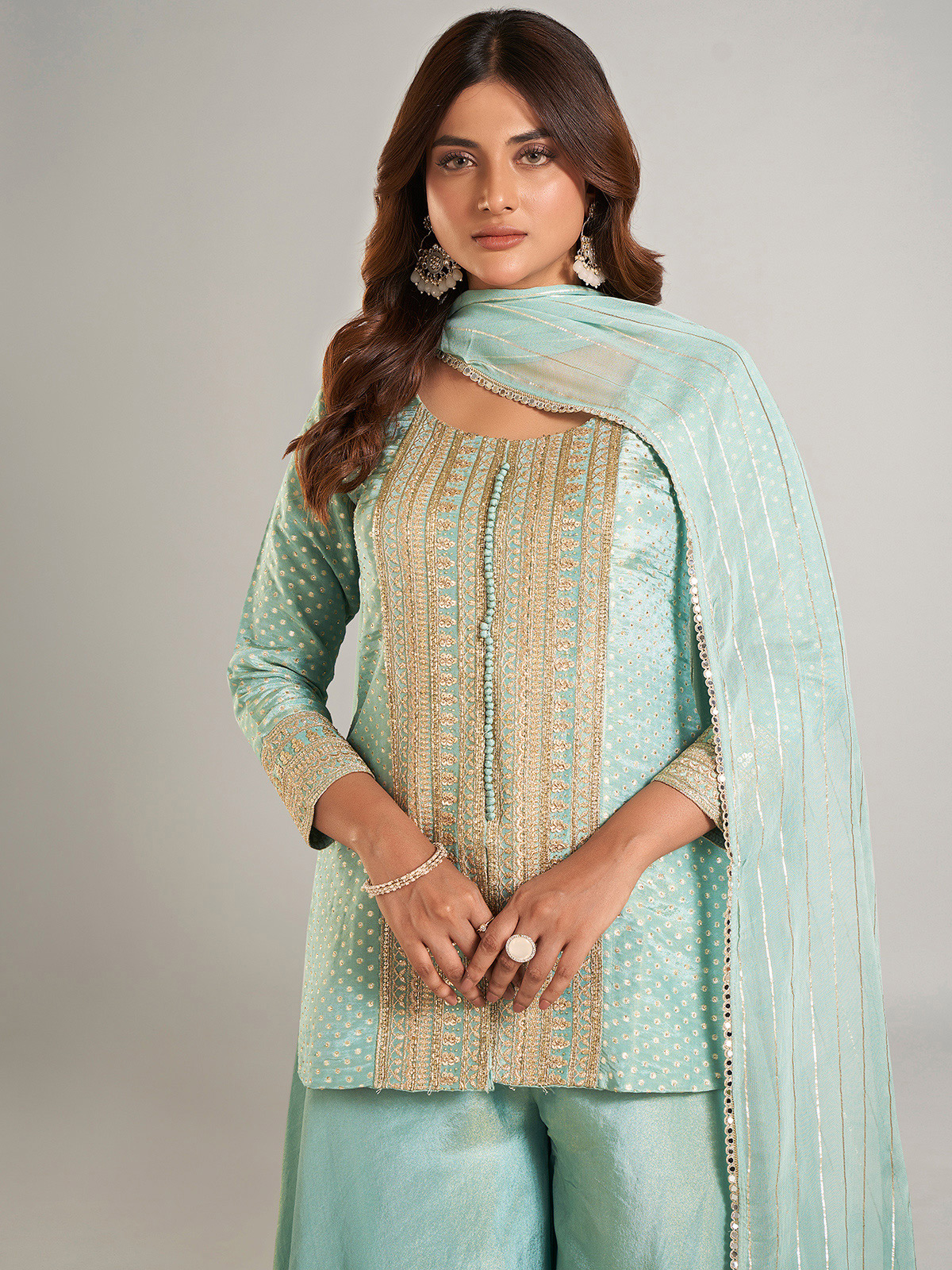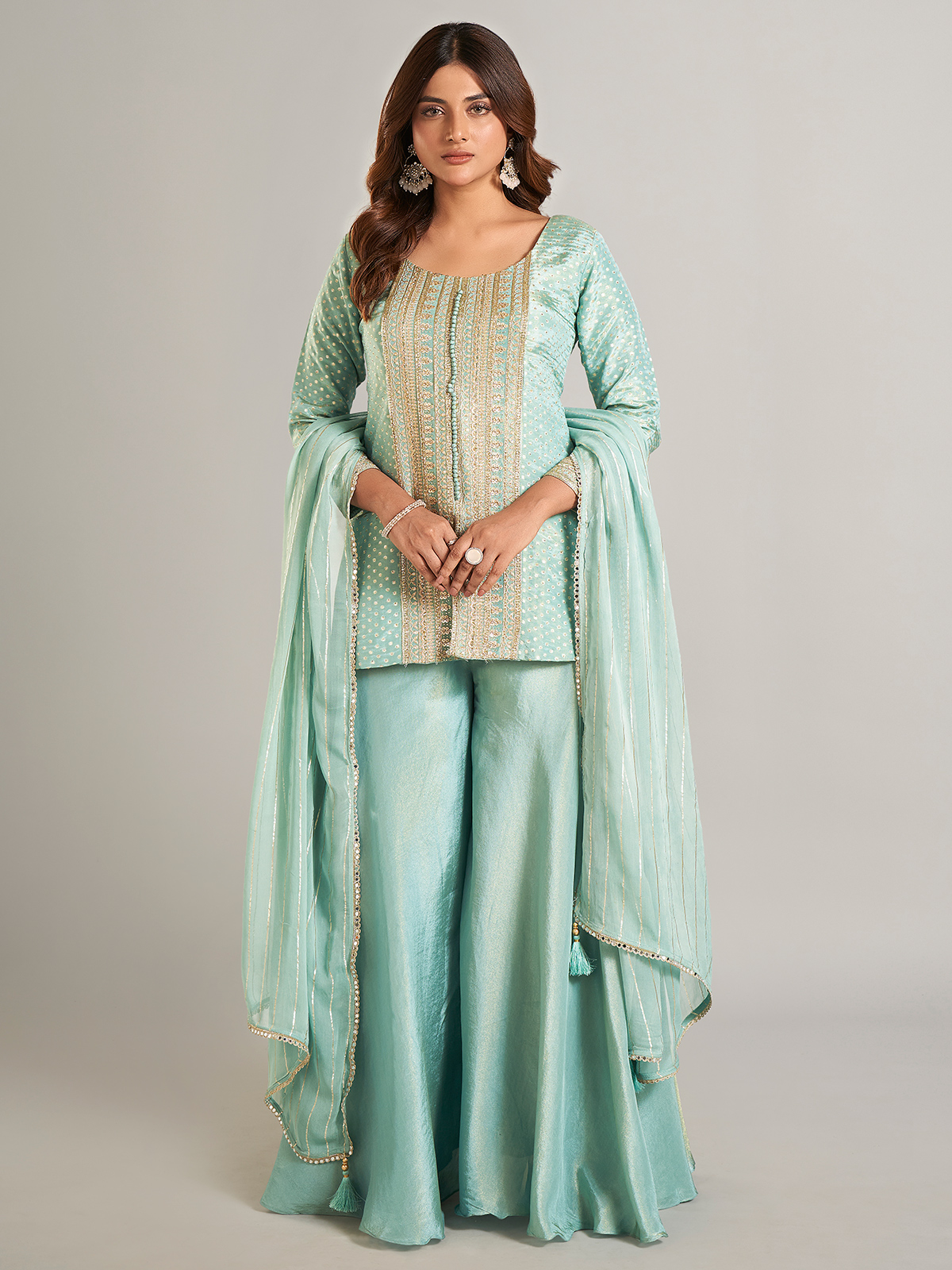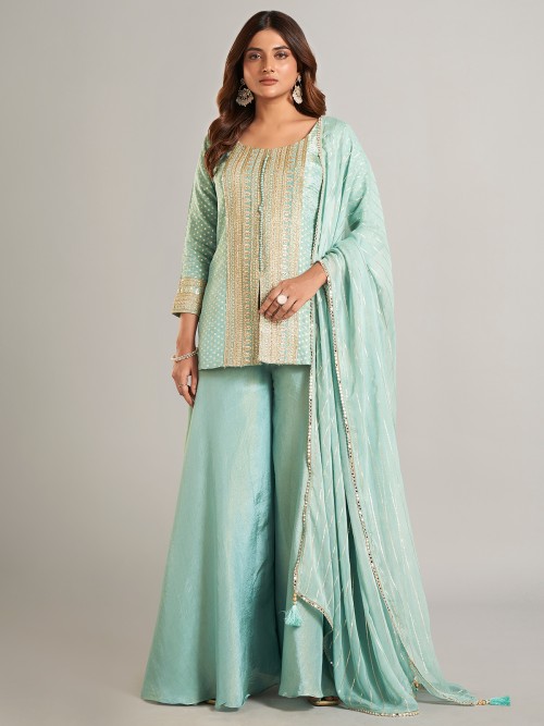 A striking mint green silk palazzo salwar suit, adorned with delicate resham, sequins, cutdana, mirror, zardosi and zari work. Its classic round neck and quarter sleeves design adds to its allure. Comes paired with a dupatta.