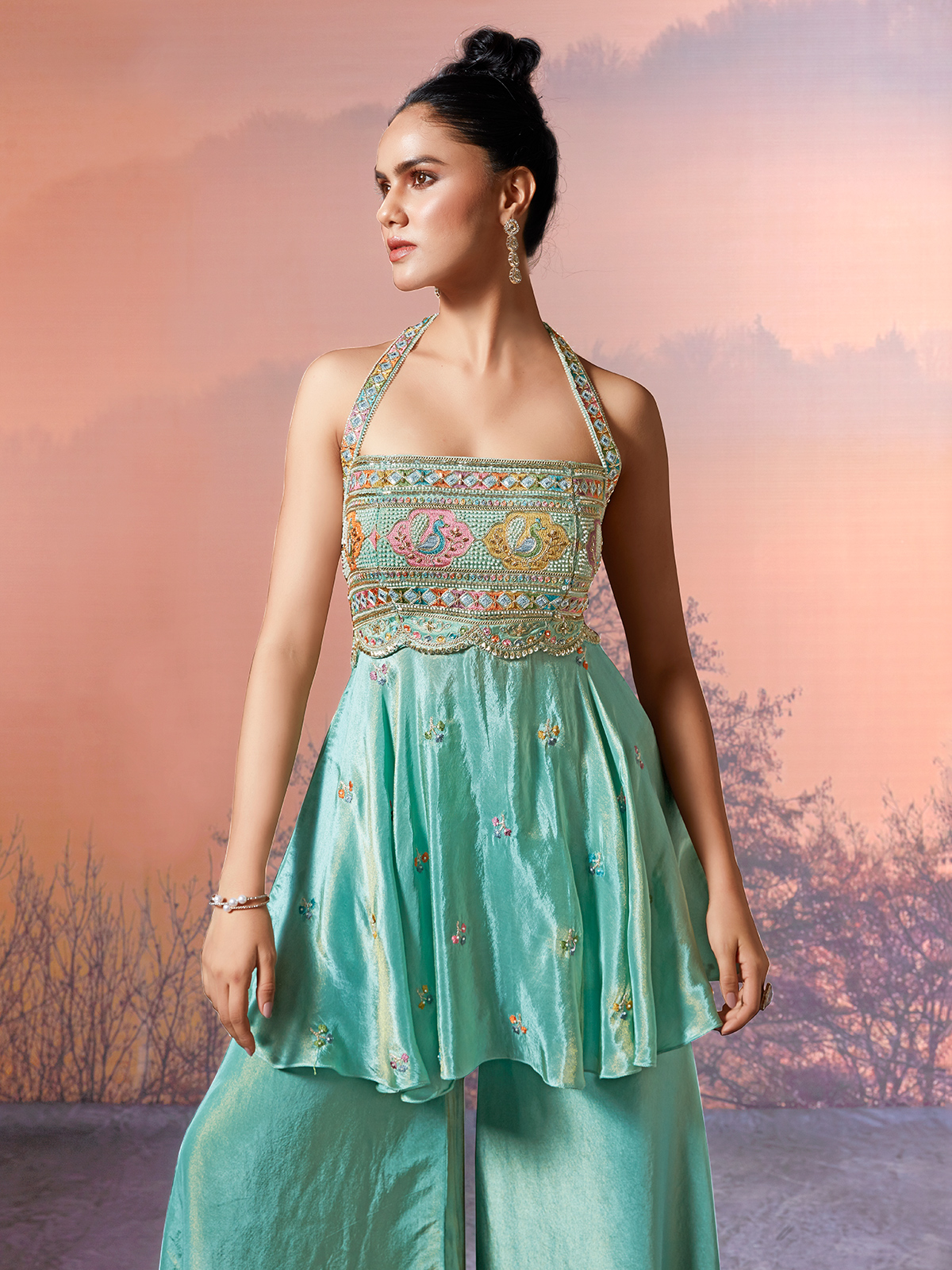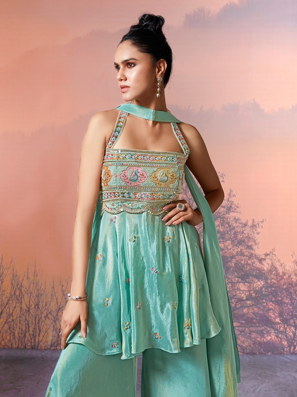 This mint green tissue silk palazzo suit. Features embroidery, sequins, cutdana and bead embellishments. Styled with a chic square neckline and sleeveless blouse, it is paired with a flowing palazzo for graceful movement. A refreshing ensemble for weddings, festive occasions and reception gatherings.
