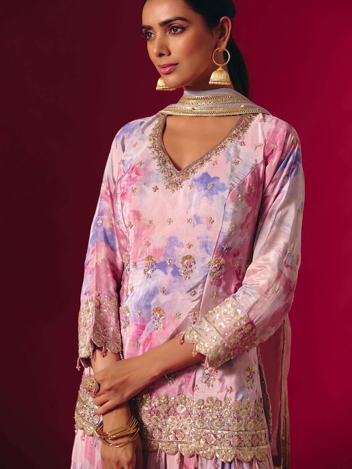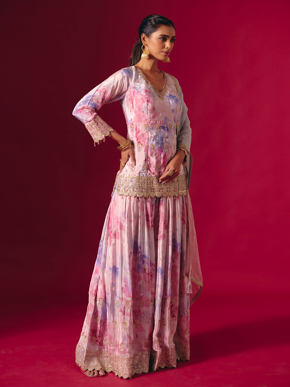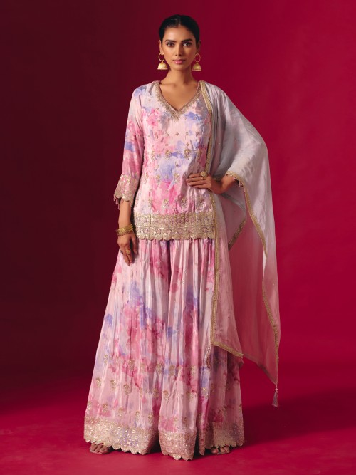 Celebrate vibrant artistry in this multi-color satin silk printed palazzo suit detailed with resham, sequins, cutdana, beads, zardosi and stone. The V-neckline and quarter sleeves add refined sophistication, ideal for festive and sangeet soirées.