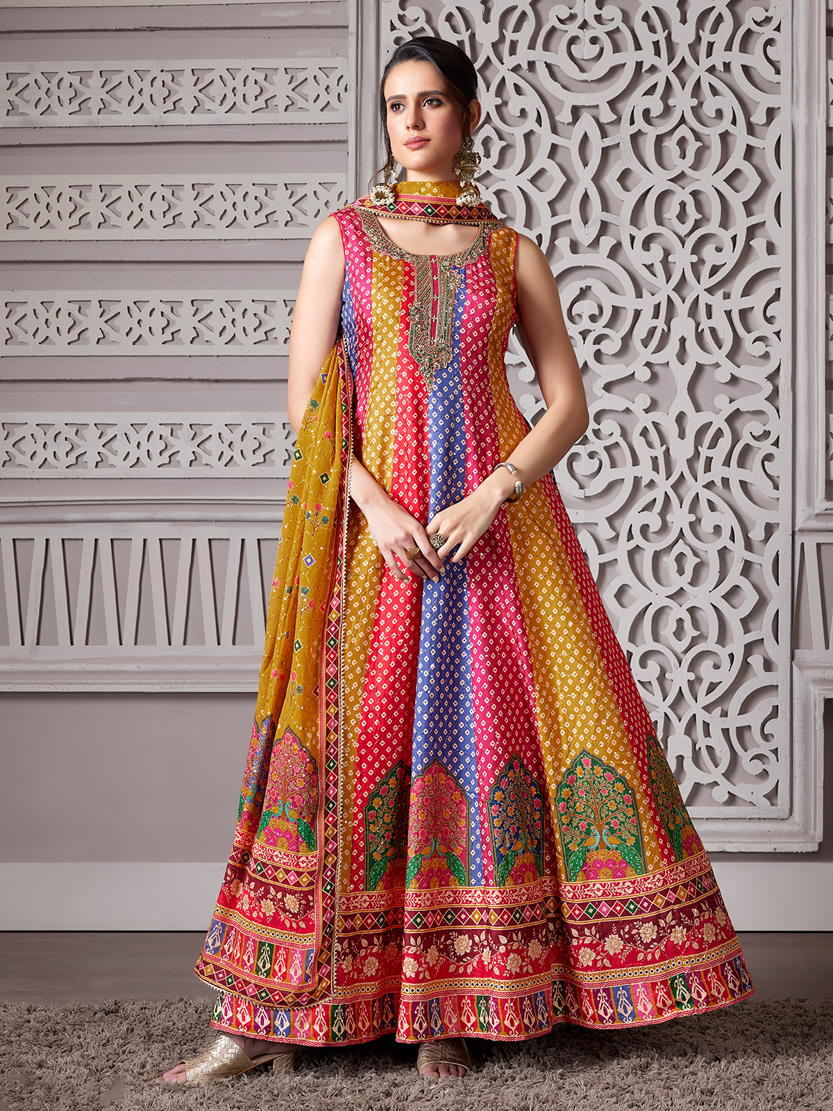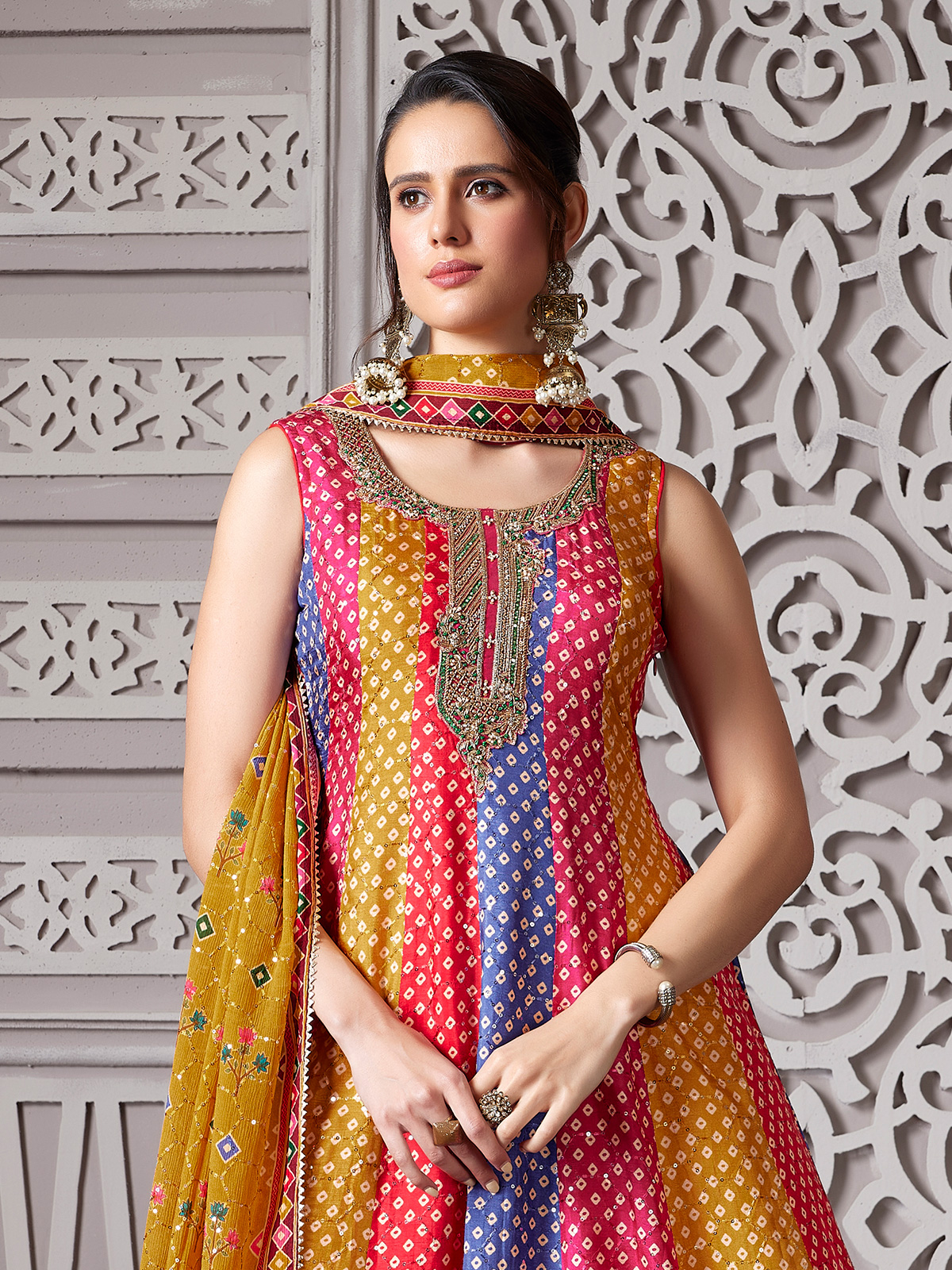 Designed in multicolor silk bandhej printed anarkali suit. Features rich zardosi, thread, cutdana, bead, sequin and diamond embellishments. Styled with a round neckline and sleeveless silhouette, it creates a vibrant ethnic look perfect for weddings and festive occasions.