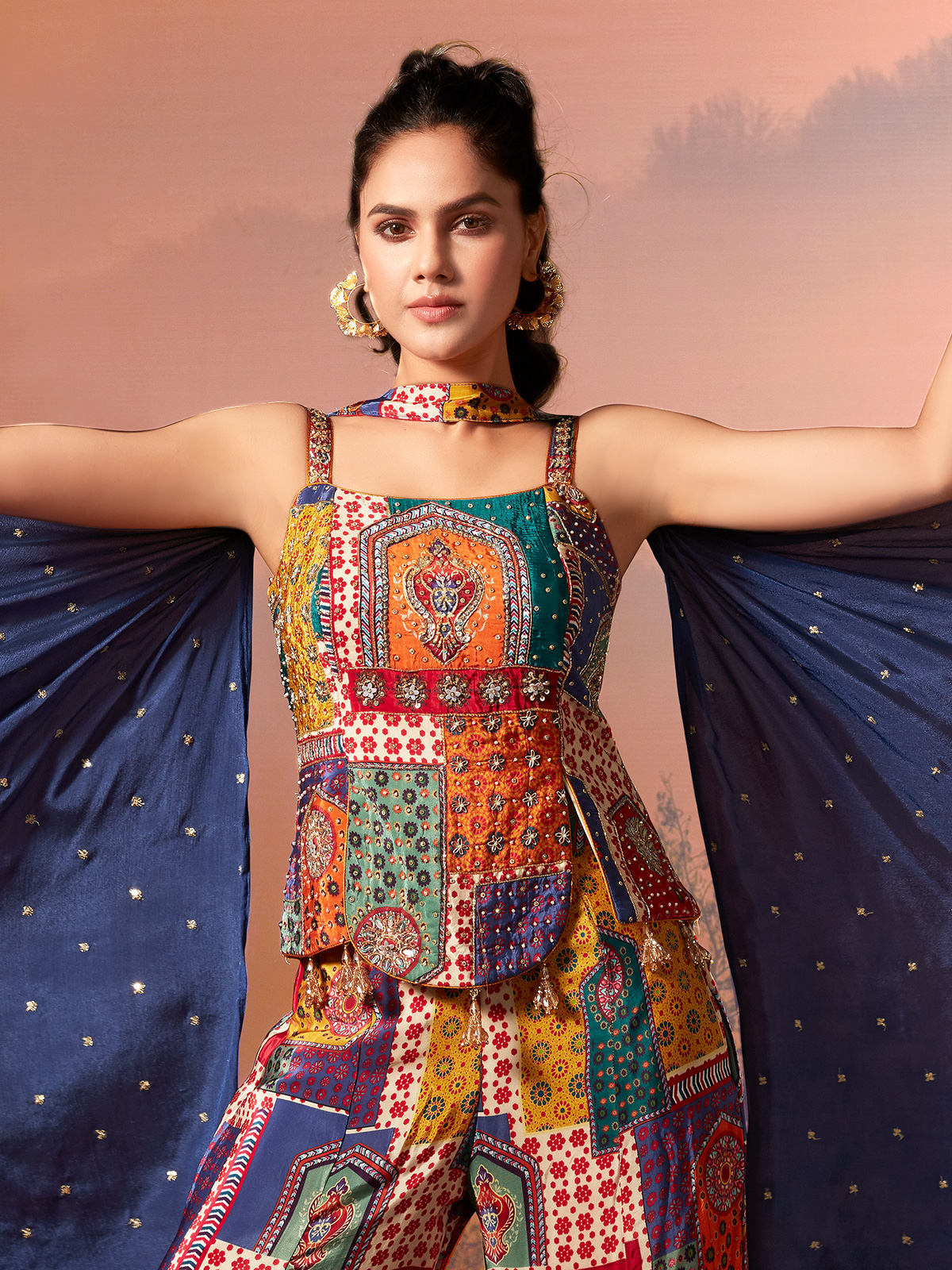 This multicolor crepe silk palazzo suit is beautifully adorned with cutdana, zardosi, sequins, pearls and stone embellishments. Designed in a modern square neckline with a sleeveless silhouette, it is paired with a dupatta and flowing palazzo. A vibrant ensemble perfect for weddings, festive celebrations and reception gatherings.