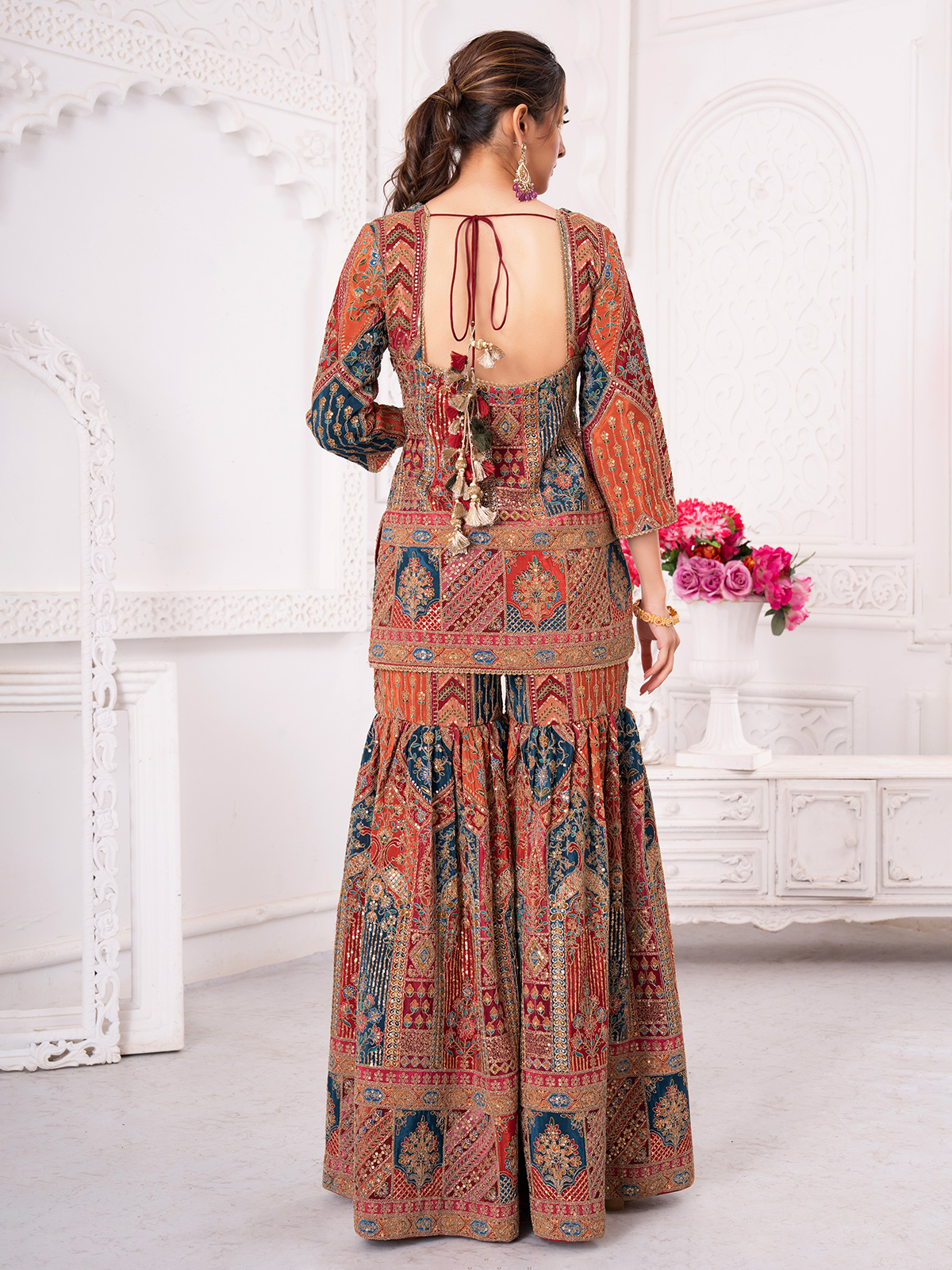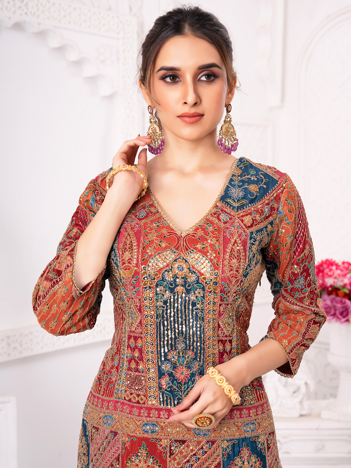 Multicolor Pakistani Silk Sharara Suit With Heavy Zardosi Embroidery