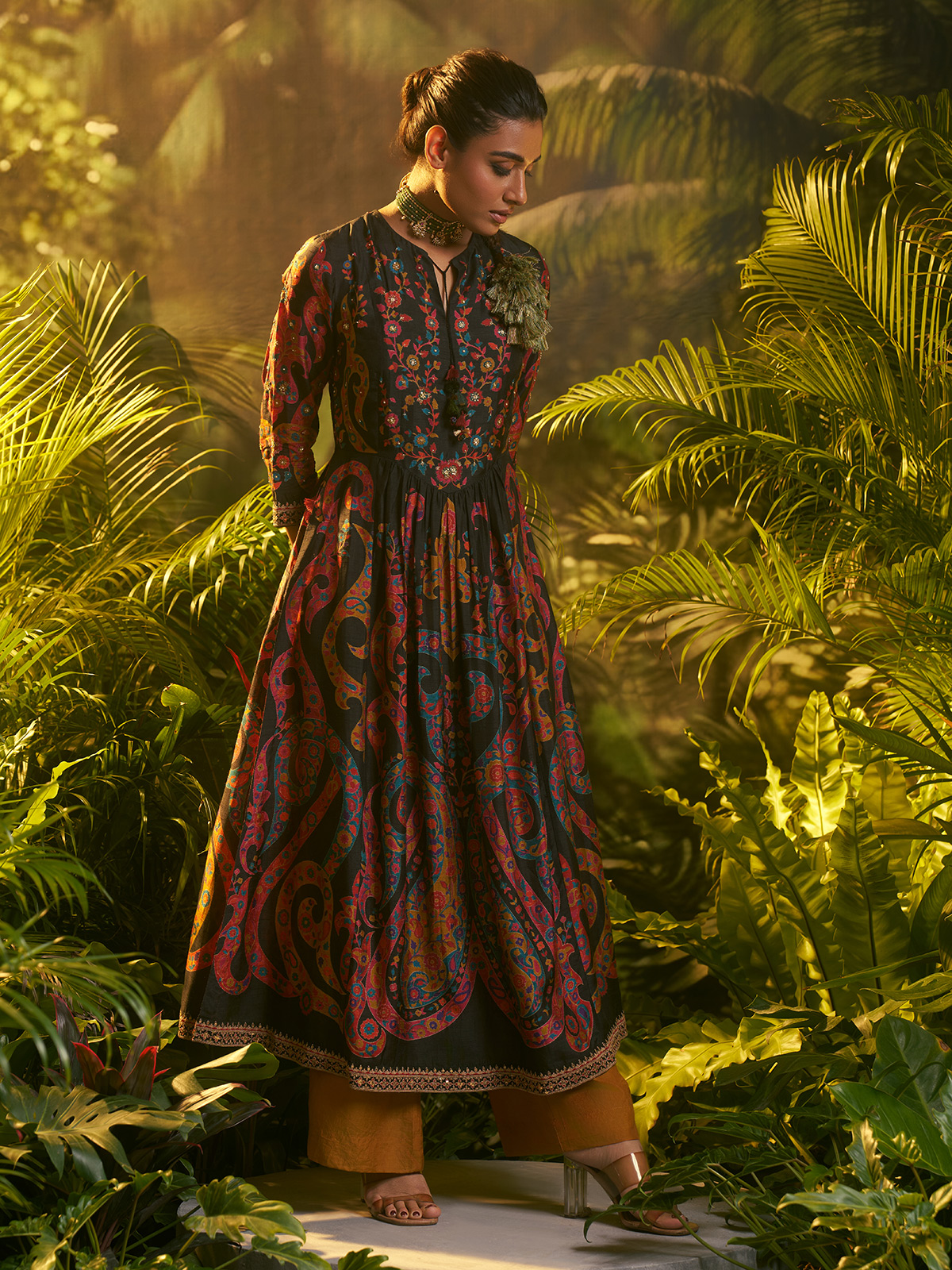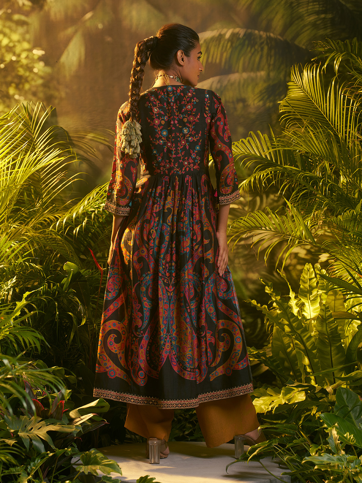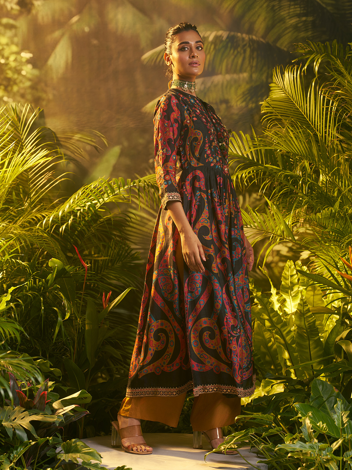 Enigmatic charm surrounds this multicolor cotton silk palazzo suit, exuding refined sophistication. Resham, sequins, and beads shimmer across its printed base, lending it a captivating aura. Styled with a keyhole neckline and quarter sleeves, it pairs beautifully with palazzo pants, making it a glamorous choice for festivals and parties alike.