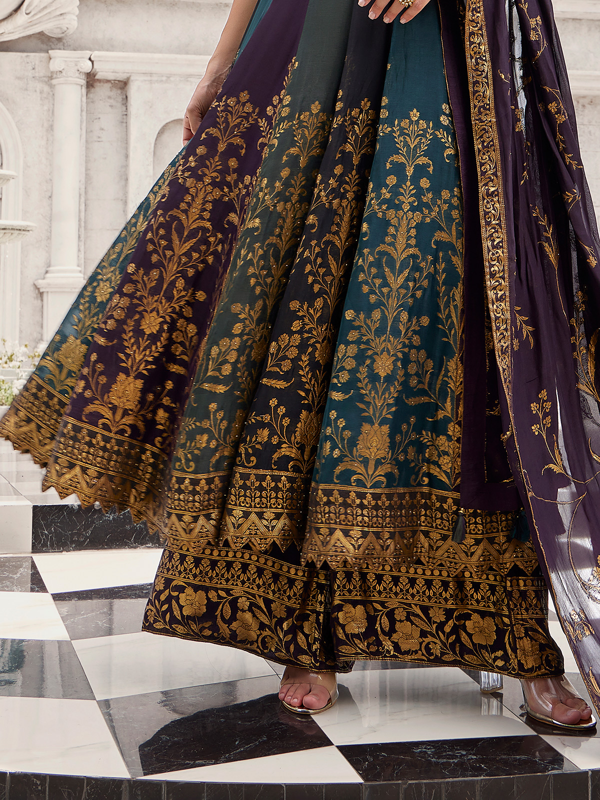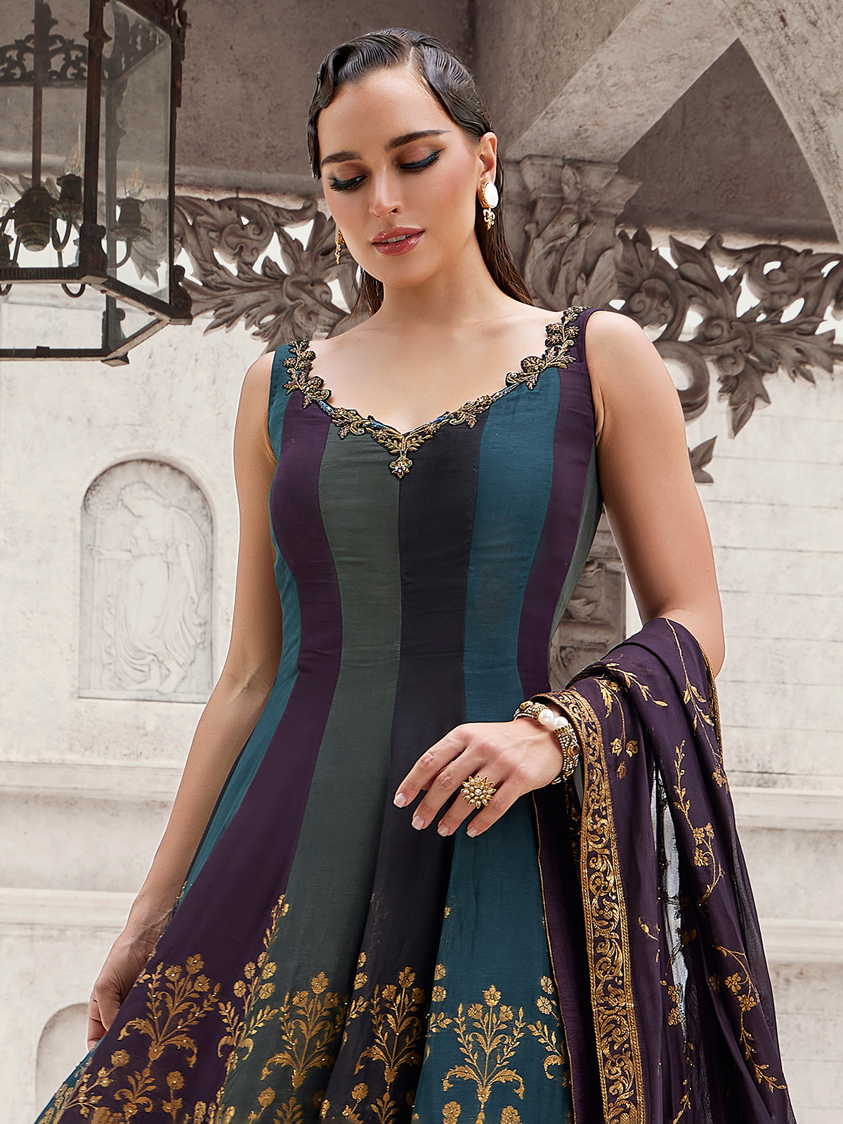 A vibrant multicolor silk anarkali brought to life with cutdana, zardosi, sequins, stone and zari artistry. The sleeveless sweetheart neckline offers structure, paired with a dupatta and palazzo ideal for weddings, receptions and festive occasions.