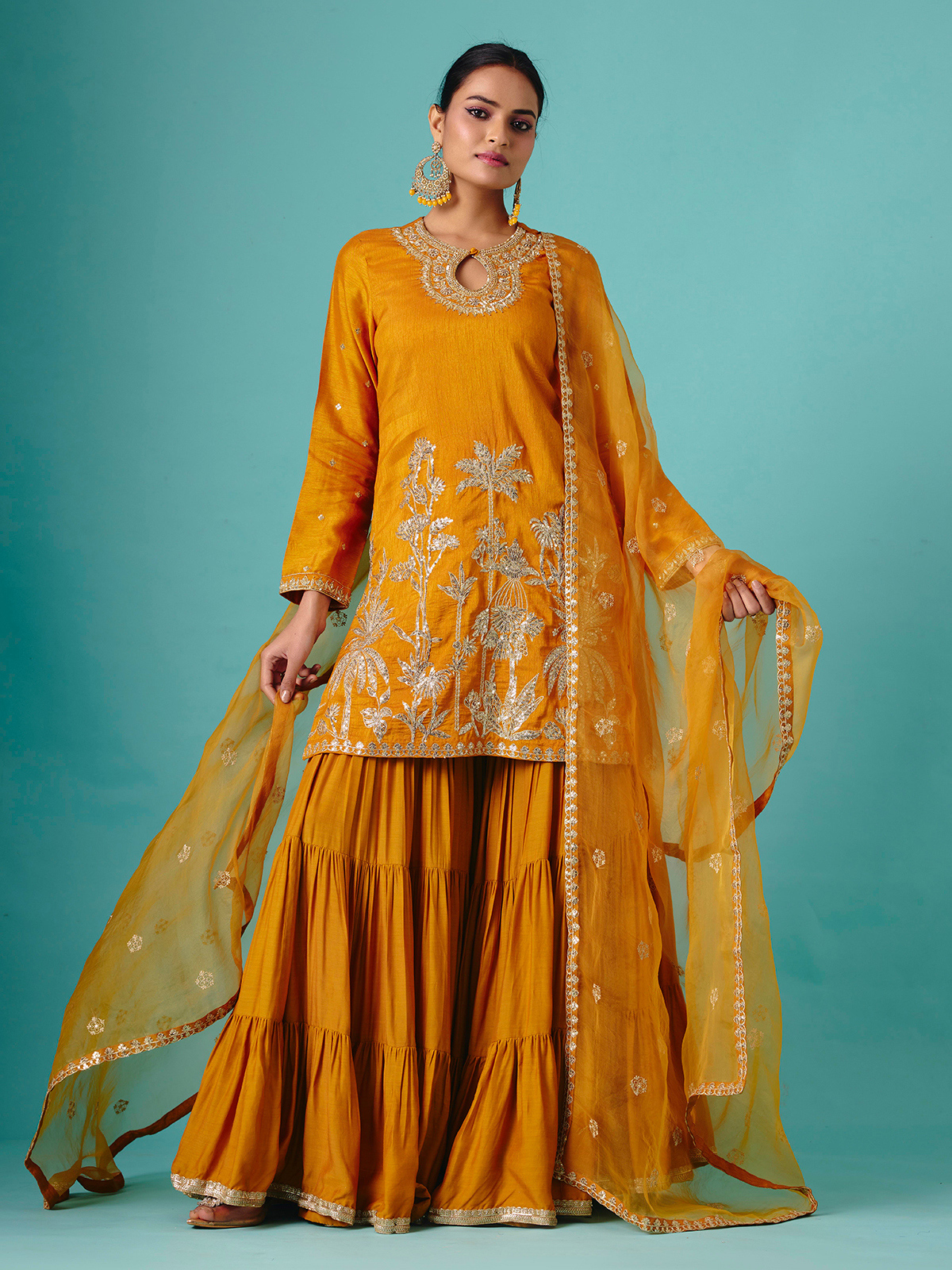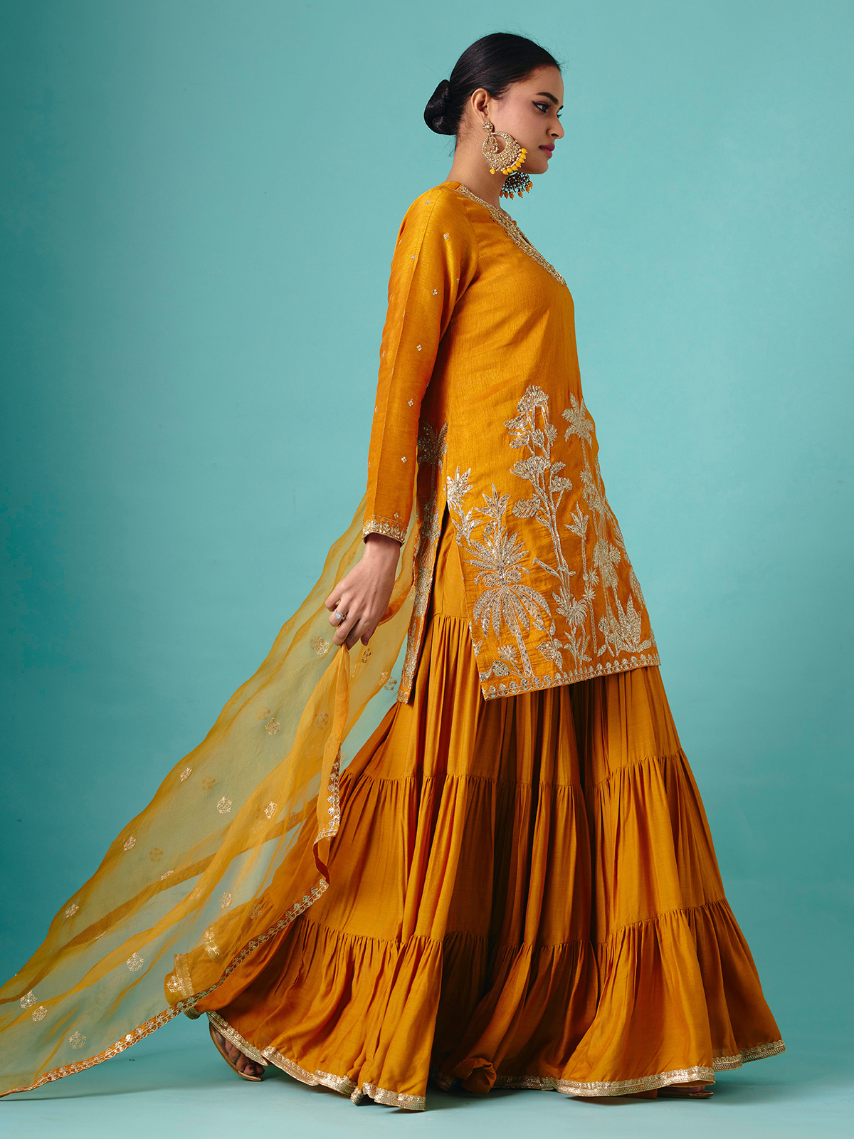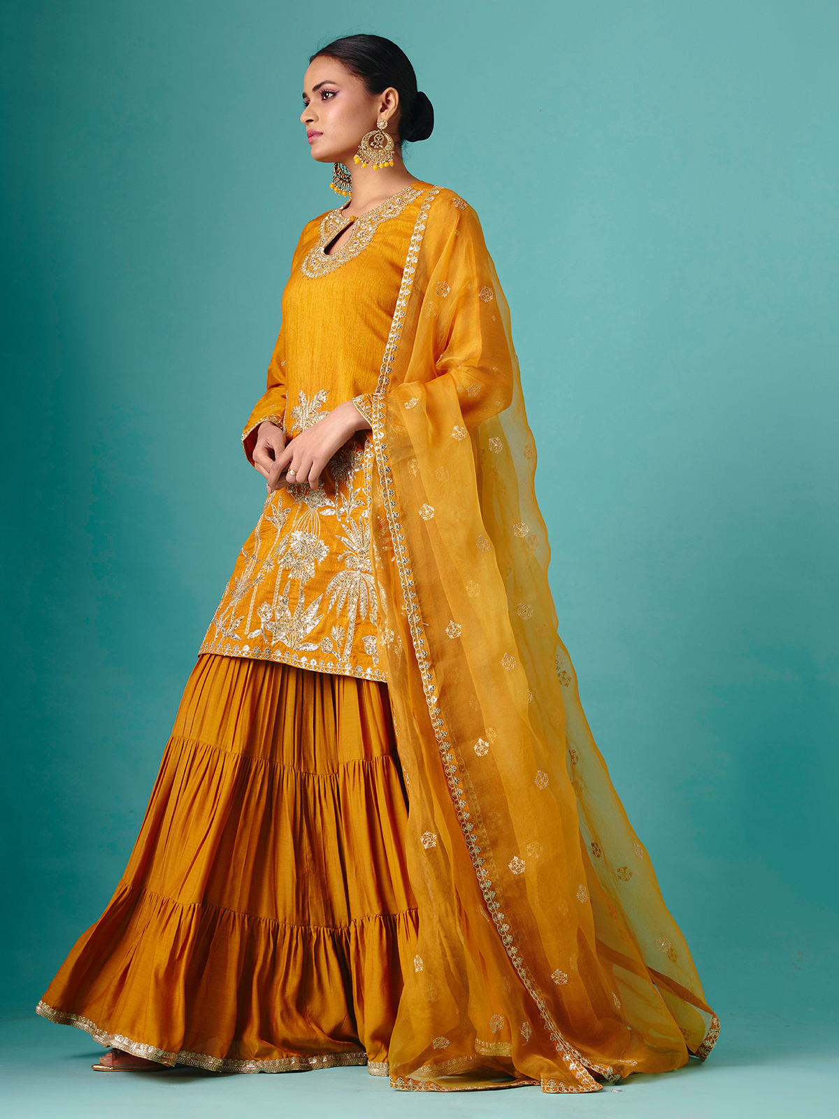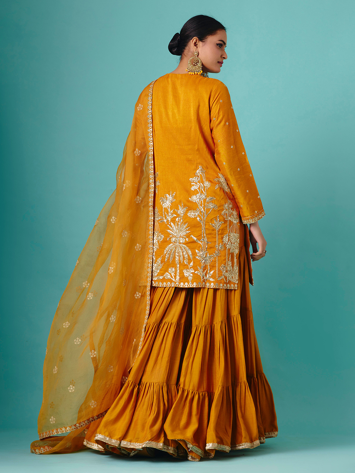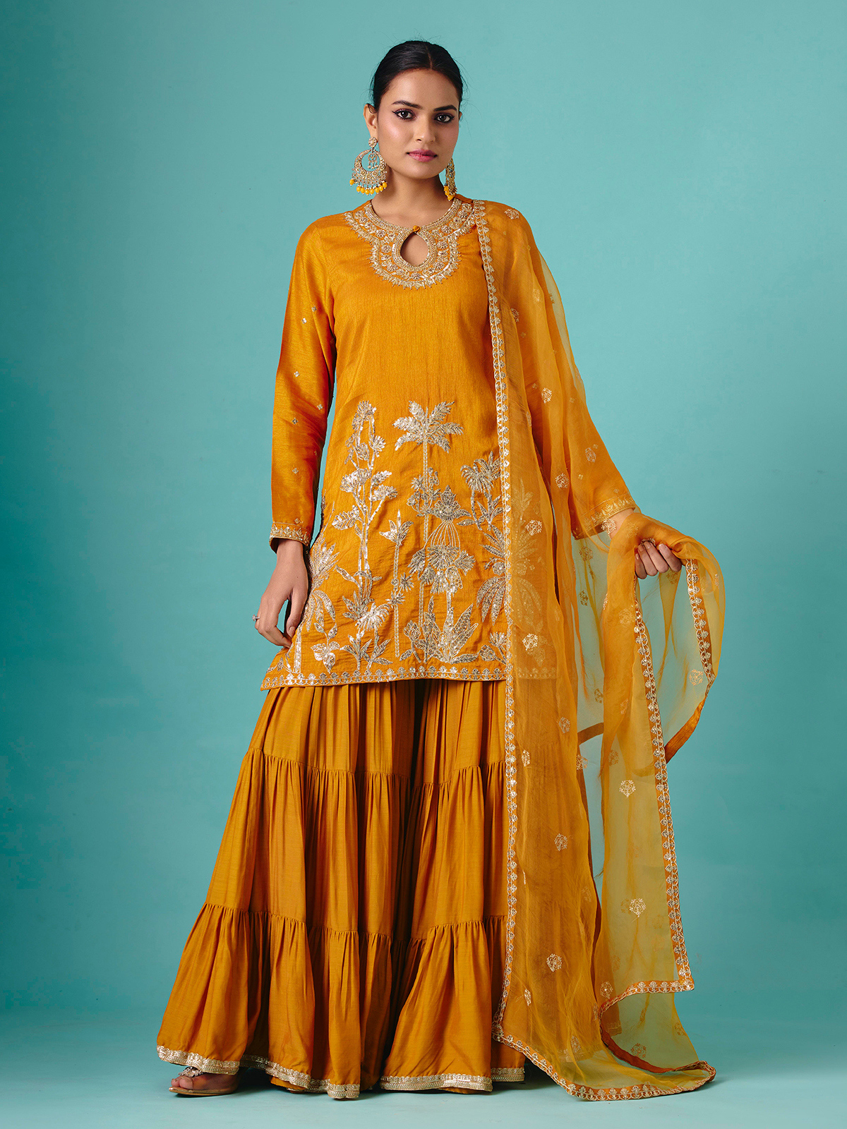 Mustard Yellow Chinon Silk Net Flowy Sharara Suit