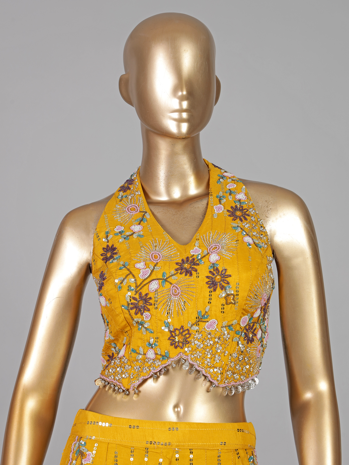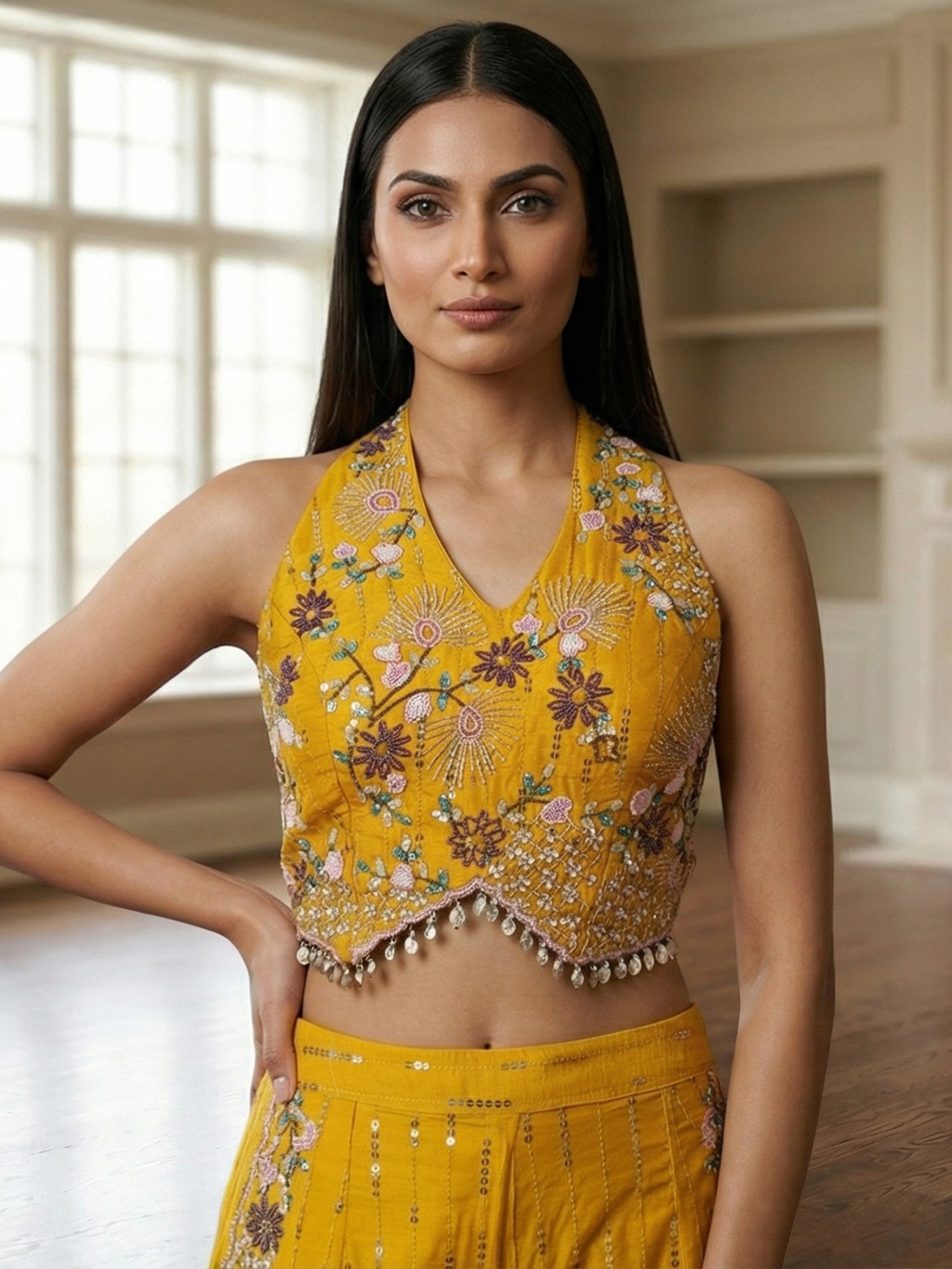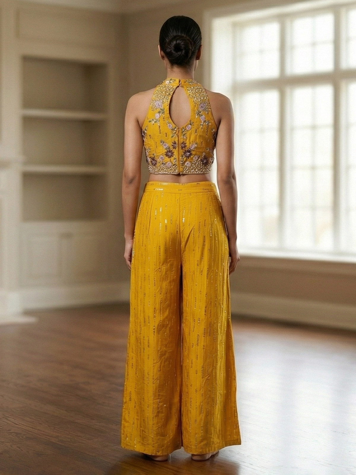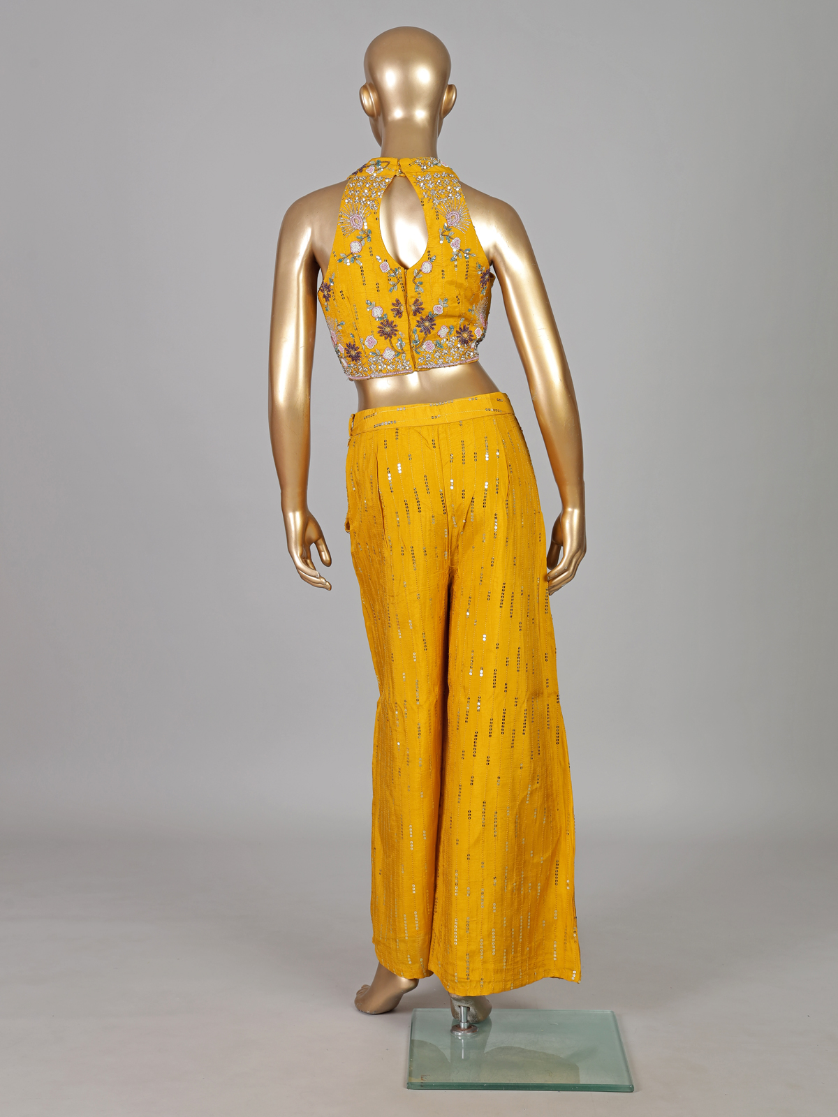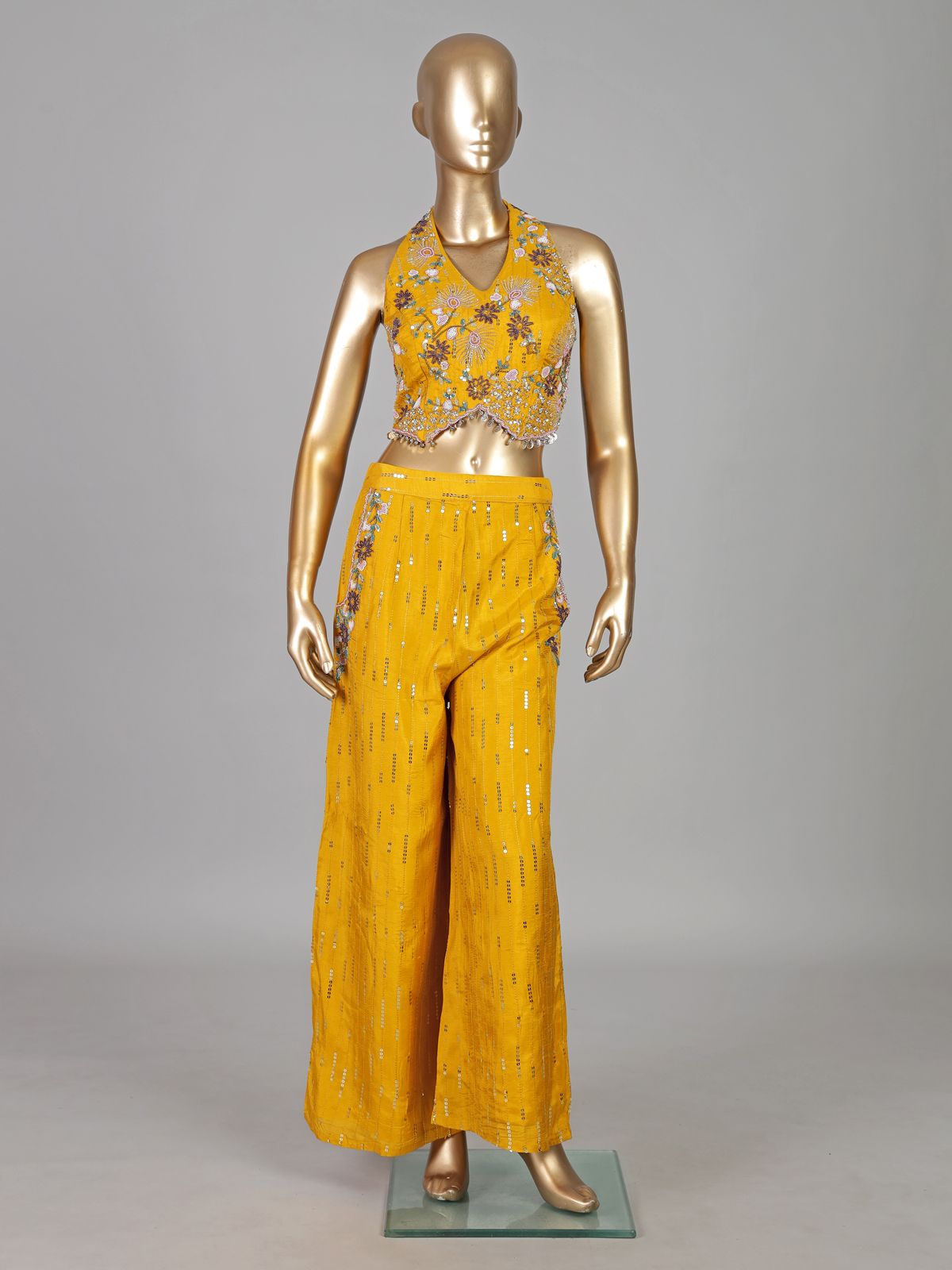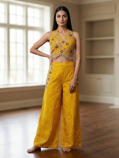 Bright mustard yellow bring joyful vibrance to this cotton silk palazzo suit designed for festive celebrations. Detailed with sequins, coins, cutdana, beads and thread work. It sparkles gracefully. The halter neck and sleeveless silhouette enhance its contemporary appeal. Ideal for haldi, weddings and sangeet. This outfit offers radiant charm.