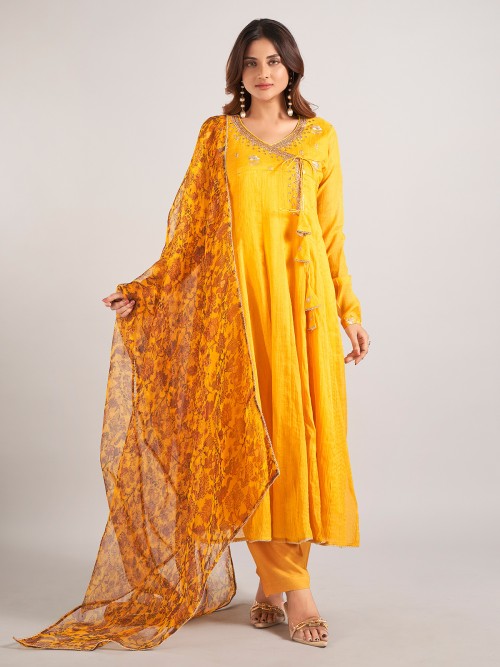 Embrace timeless elegance with this mustard yellow cotton silk salwar suit, thoughtfully designed for refined, everyday glamor. The soft cotton silk fabric is enriched with intricate embroidery, resham, sequins, and gota work, offering just the right balance of subtlety and shine. Featuring a flattering V-neckline and full sleeves, this suit exudes sophistication and grace. Ideal for festive gatherings, cultural events, or semi-formal occasions, it’s a versatile piece that effortlessly enhances your ethnic wardrobe.