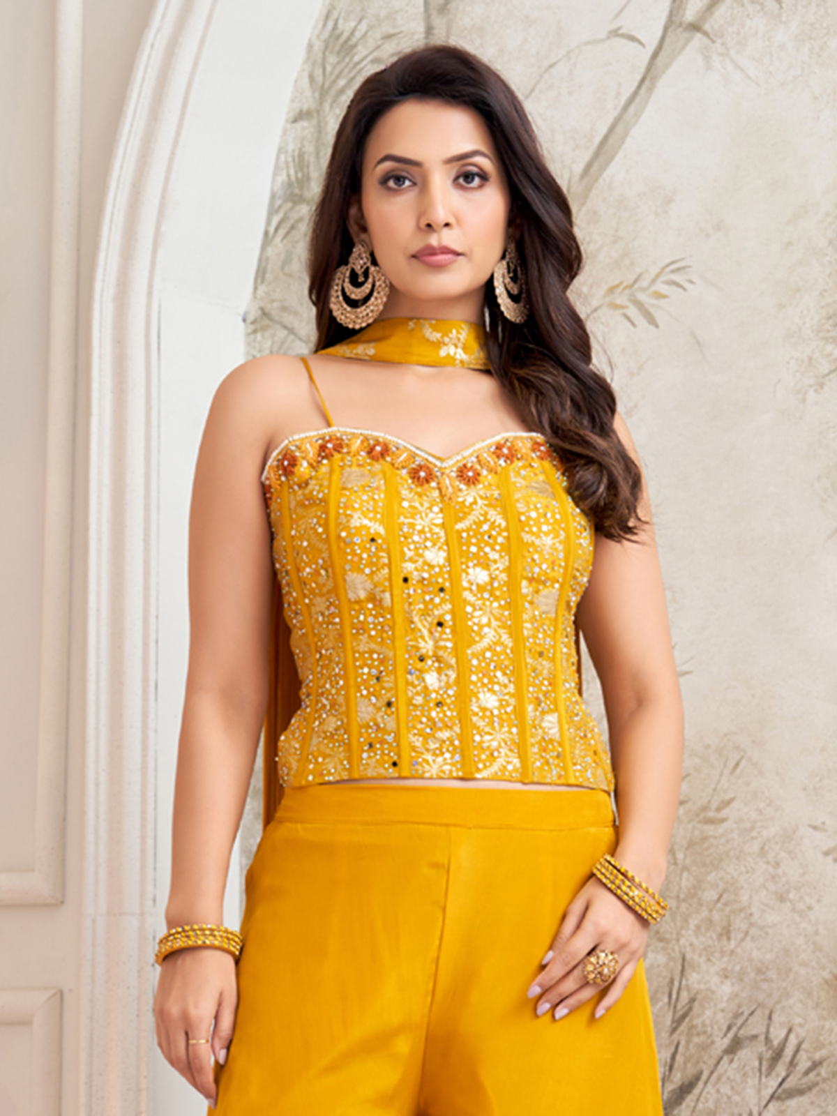 Mustard Yellow Embroidered Satin Silk Palazzo Suit
