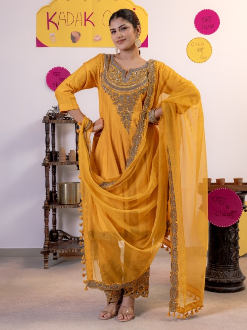A perfect fusion of tradition and trend, this mustard yellow silk salwar suit is a festive must-have. Featuring exquisite handwork with sequins, cutdana, zardosi, gota, and beads, it offers a graceful quarter-sleeve design. Paired with elegant pants and a coordinating dupatta, it’s a standout choice for any special occasion.