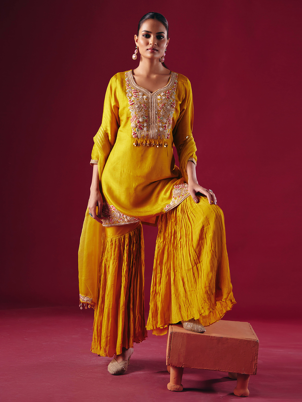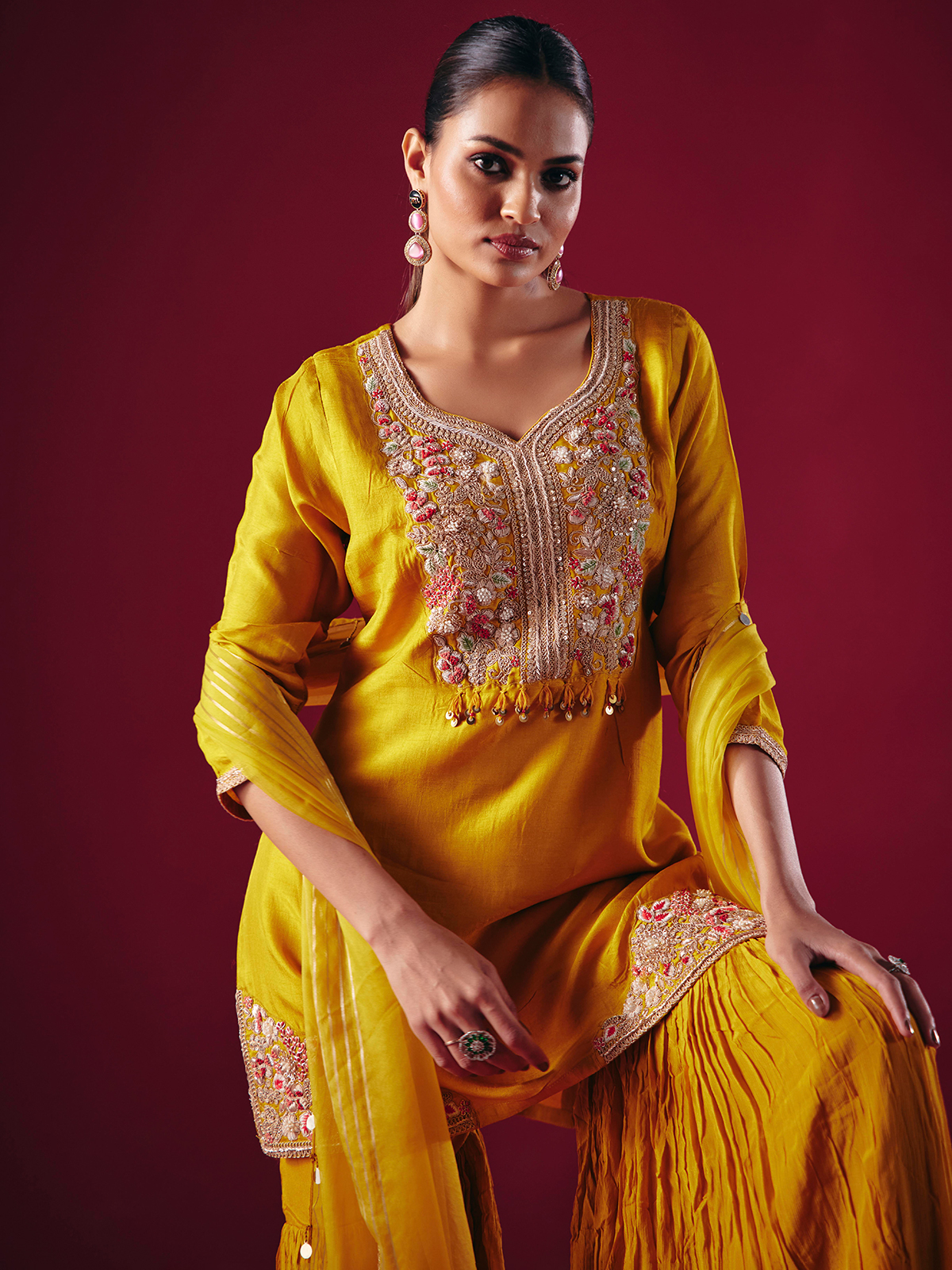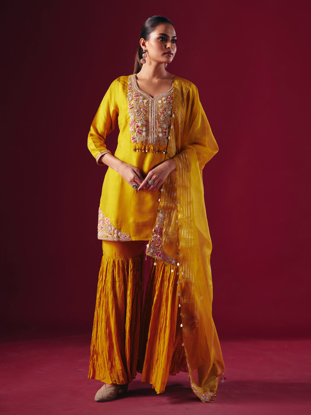 Vibrant mustard yellow silk forms the base of this sharara salwar suit, adorned with sequins, beads, zardosi, and thread embroidery. The sweetheart neckline, quarter sleeves, sharara bottoms, and dupatta create a lively and festive look for weddings and Haldi ceremonies.