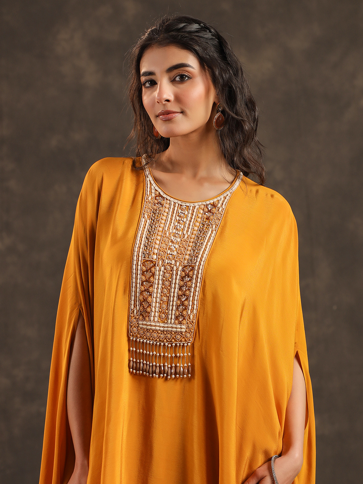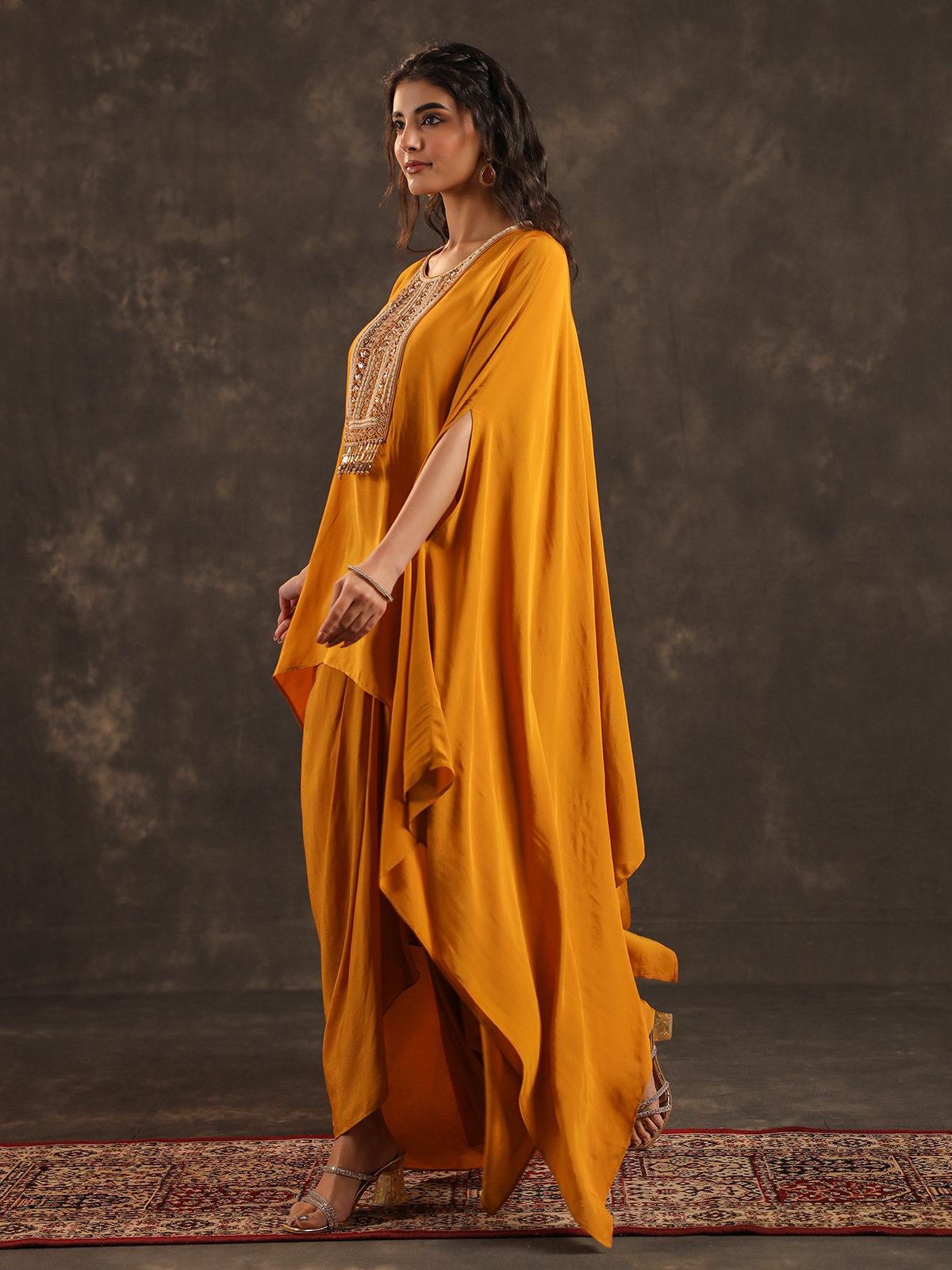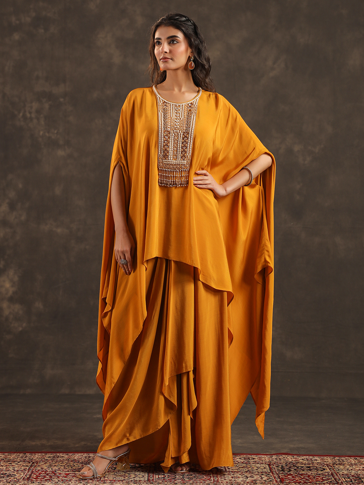 Radiating festive warmth mustard yellow viscose crepe kaftan suit captures the joyful spirit of celebrations. The round neckline silhouette is beautifully adorned with beads, sequins, cutdana and pearl embellishments that shimmer gracefully. Styled with coordinated bottoms, the flowing kaftan drape creates a relaxed yet elegant look, making it perfect for weddings, sangeet evenings, festive gatherings and vibrant haldi ceremonies.
