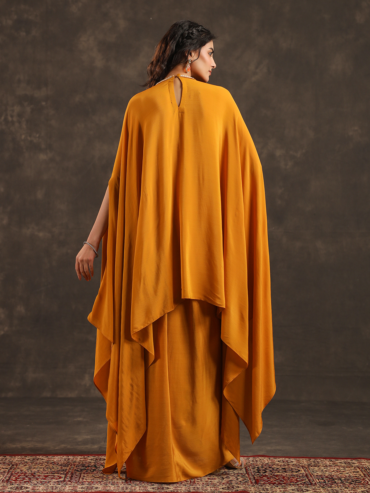 Mustard Yellow Viscose Crepe Kaftan Suit With Pearl Embellishments