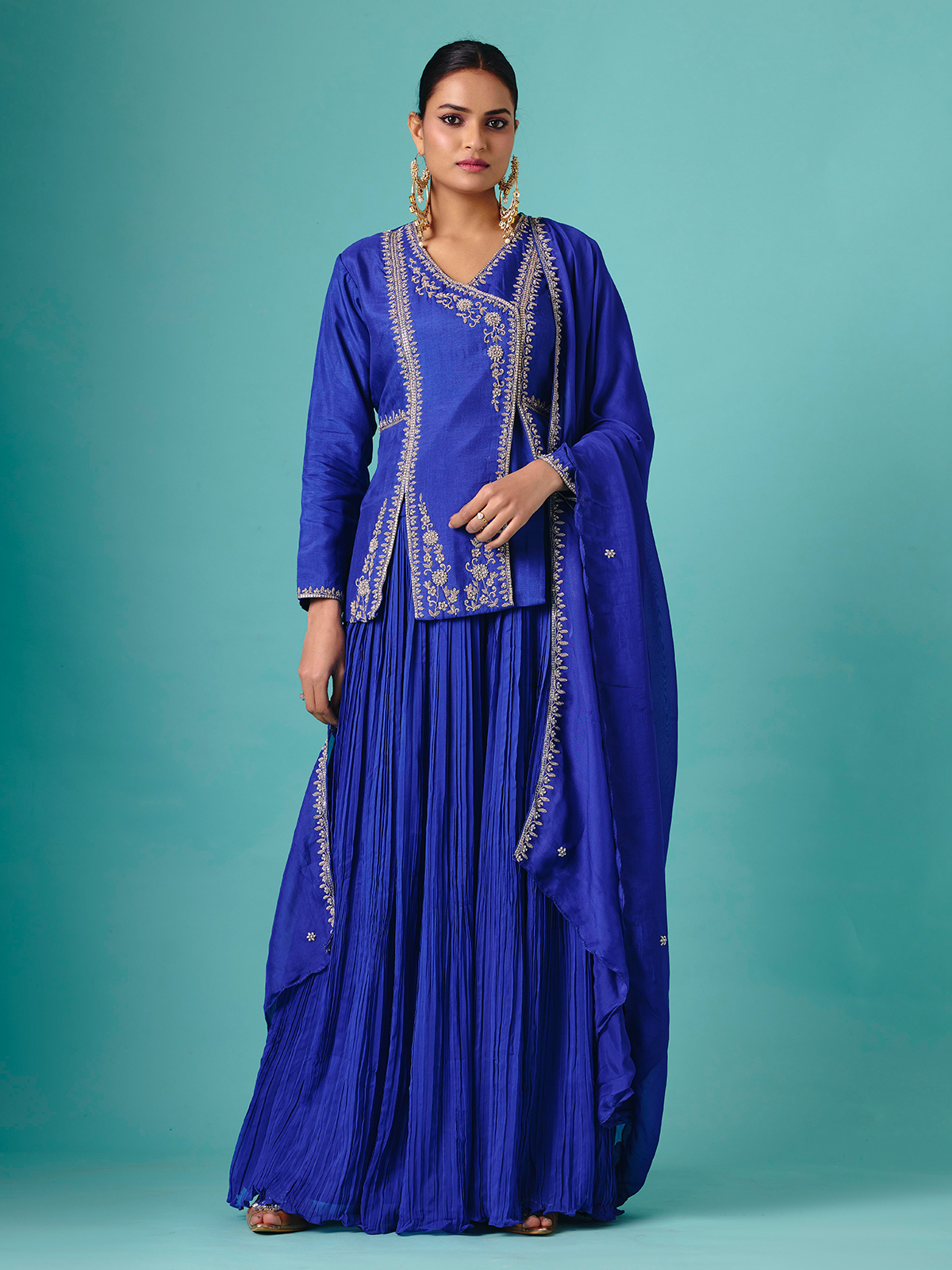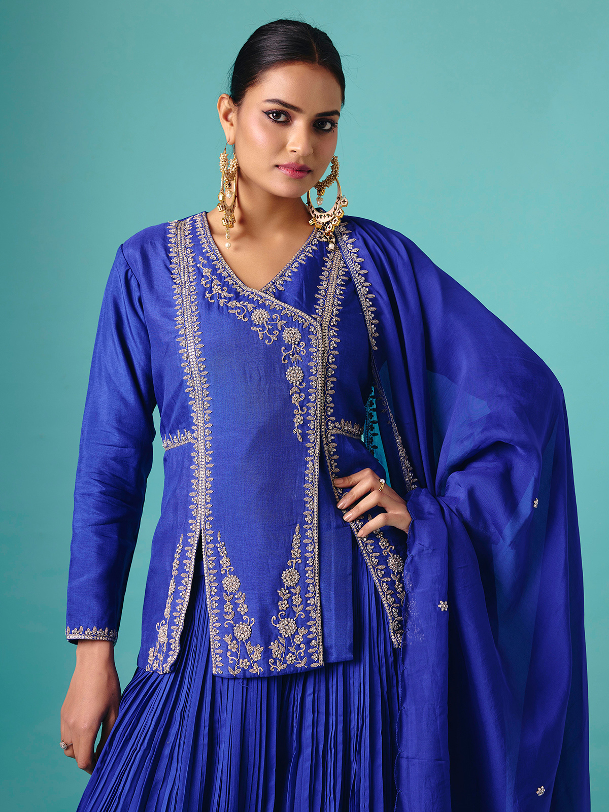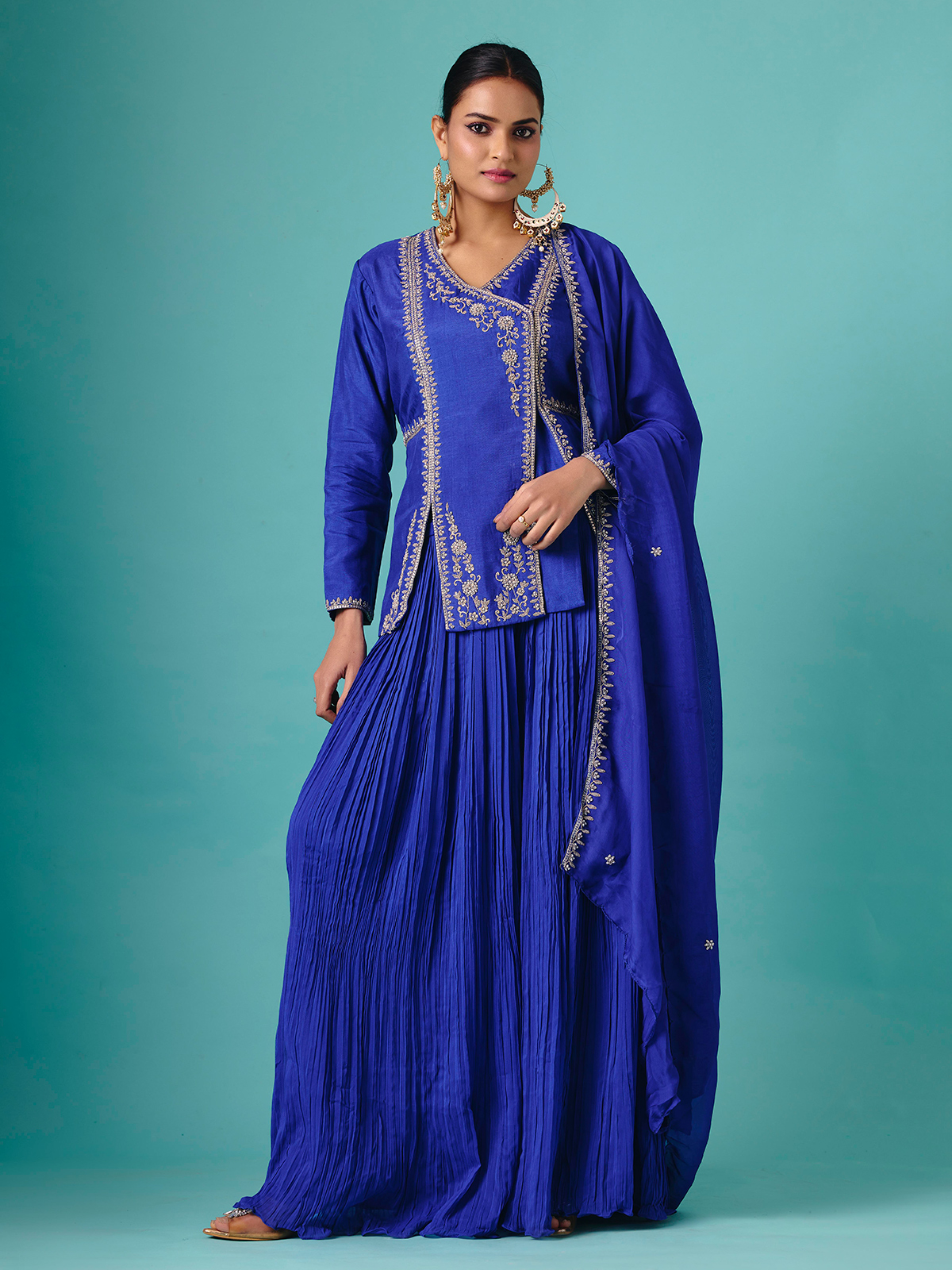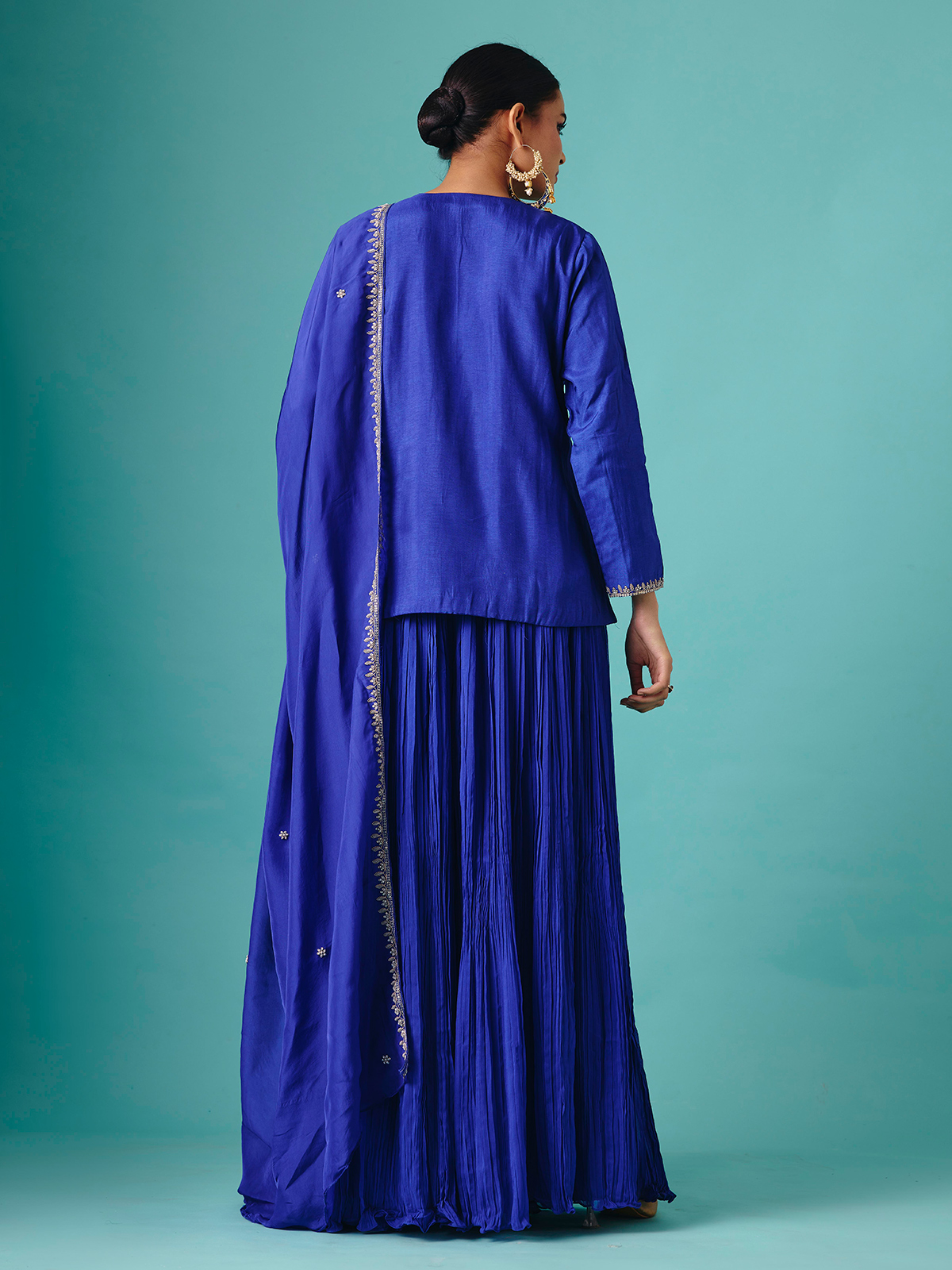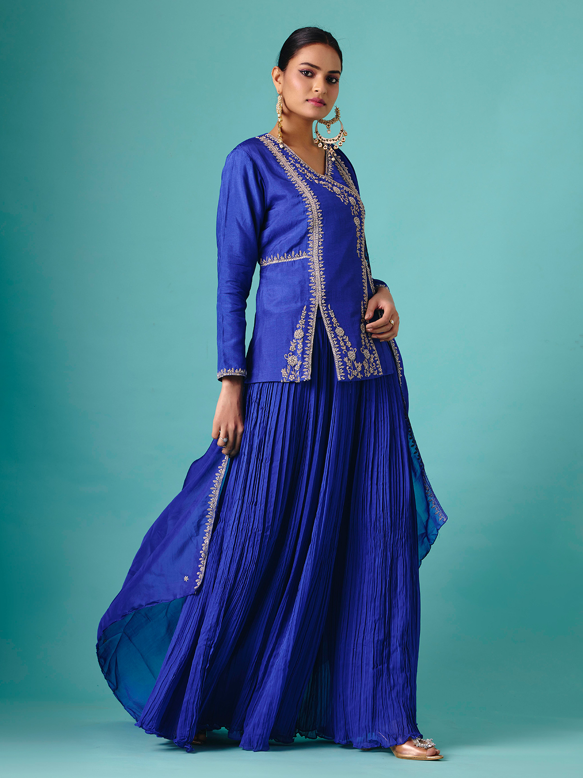 Deep navy blue cotton silk shapes this palazzo suit, enhanced with beads, zardosi, embroidery, and sequins work. V-neckline and full sleeves offer balanced elegance, while flowing palazzo bottoms lend effortless movement. Matched with a coordinating dupatta, it exudes regal charm, subtle shimmer, and sophisticated craftsmanship, perfect for weddings, sangeet, and reception festivities.