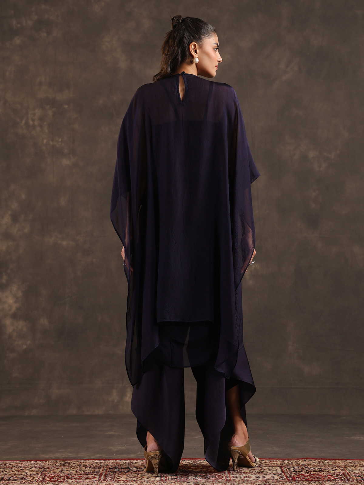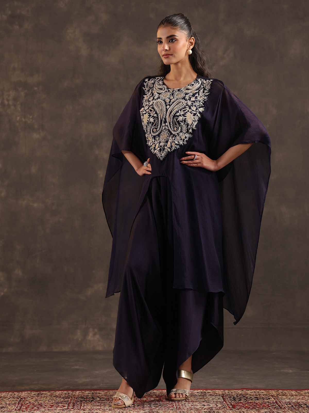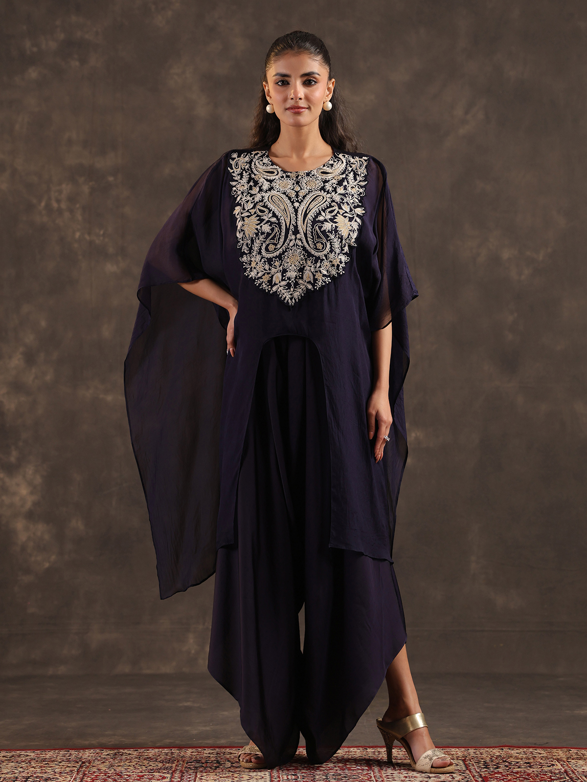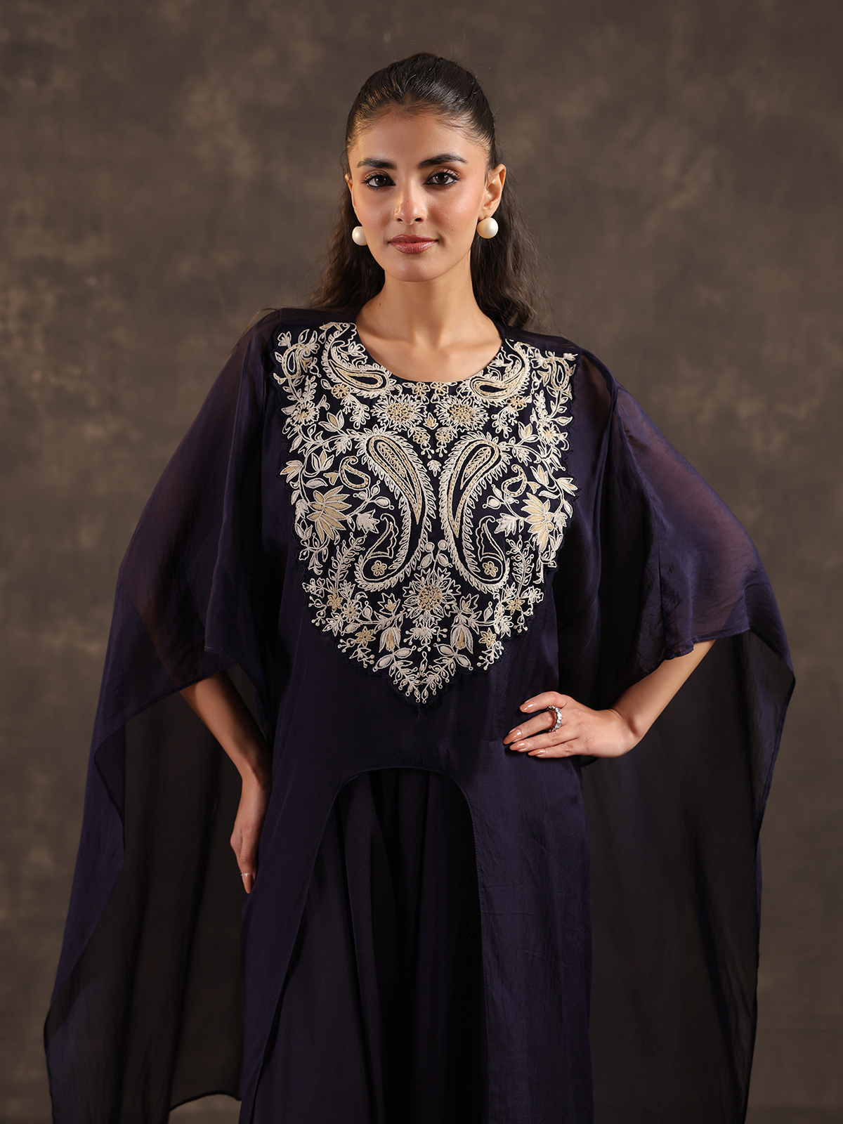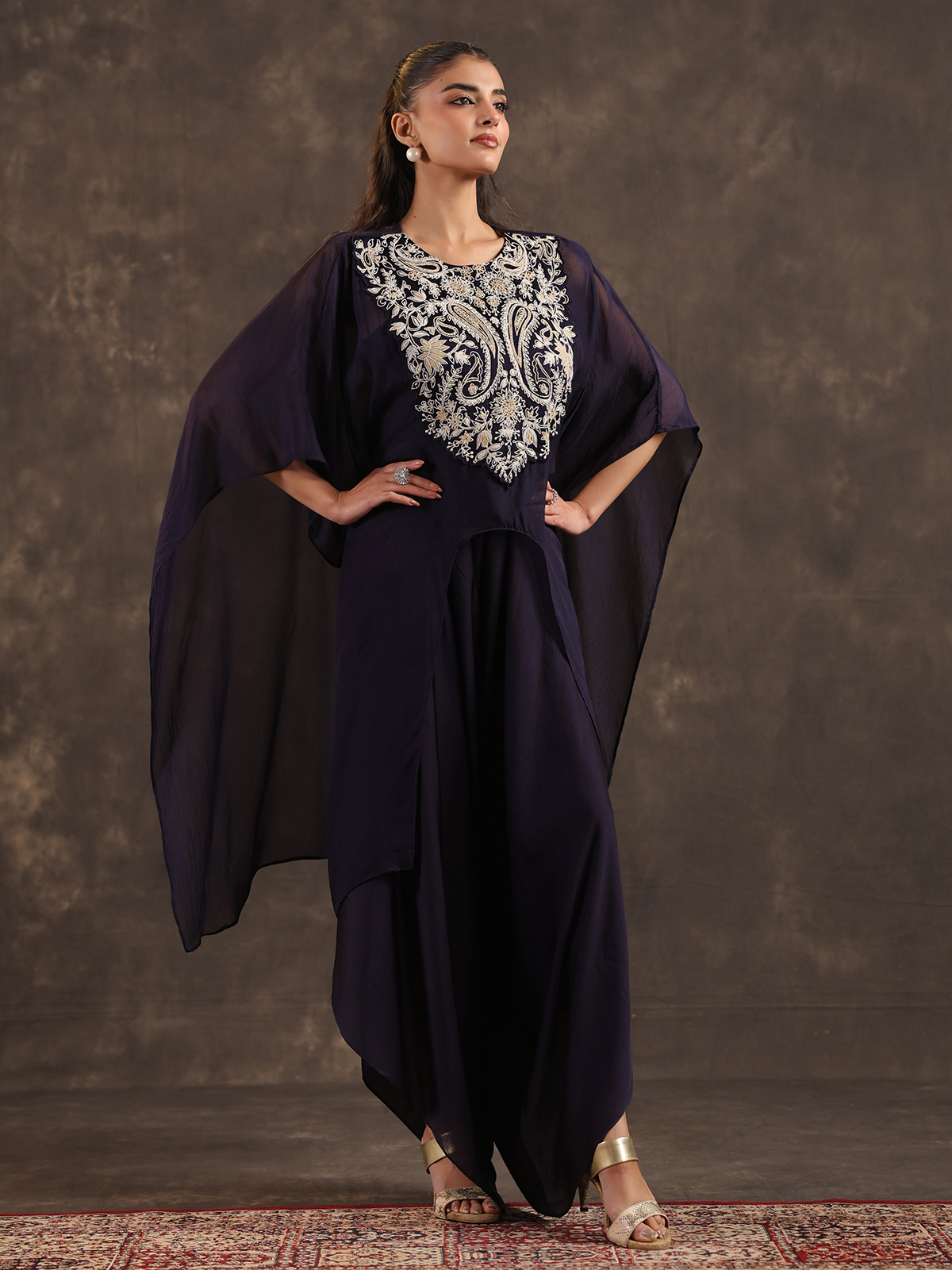 Graceful and contemporary navy blue organza kaftan suit blends fluid design with festive sophistication. The round neckline silhouette is enhanced with subtle thread detailing that brings understated elegance. Paired with a stylish dhoti bottom. The ensemble creates a modern ethnic look ideal for festive gatherings and chic party celebrations.