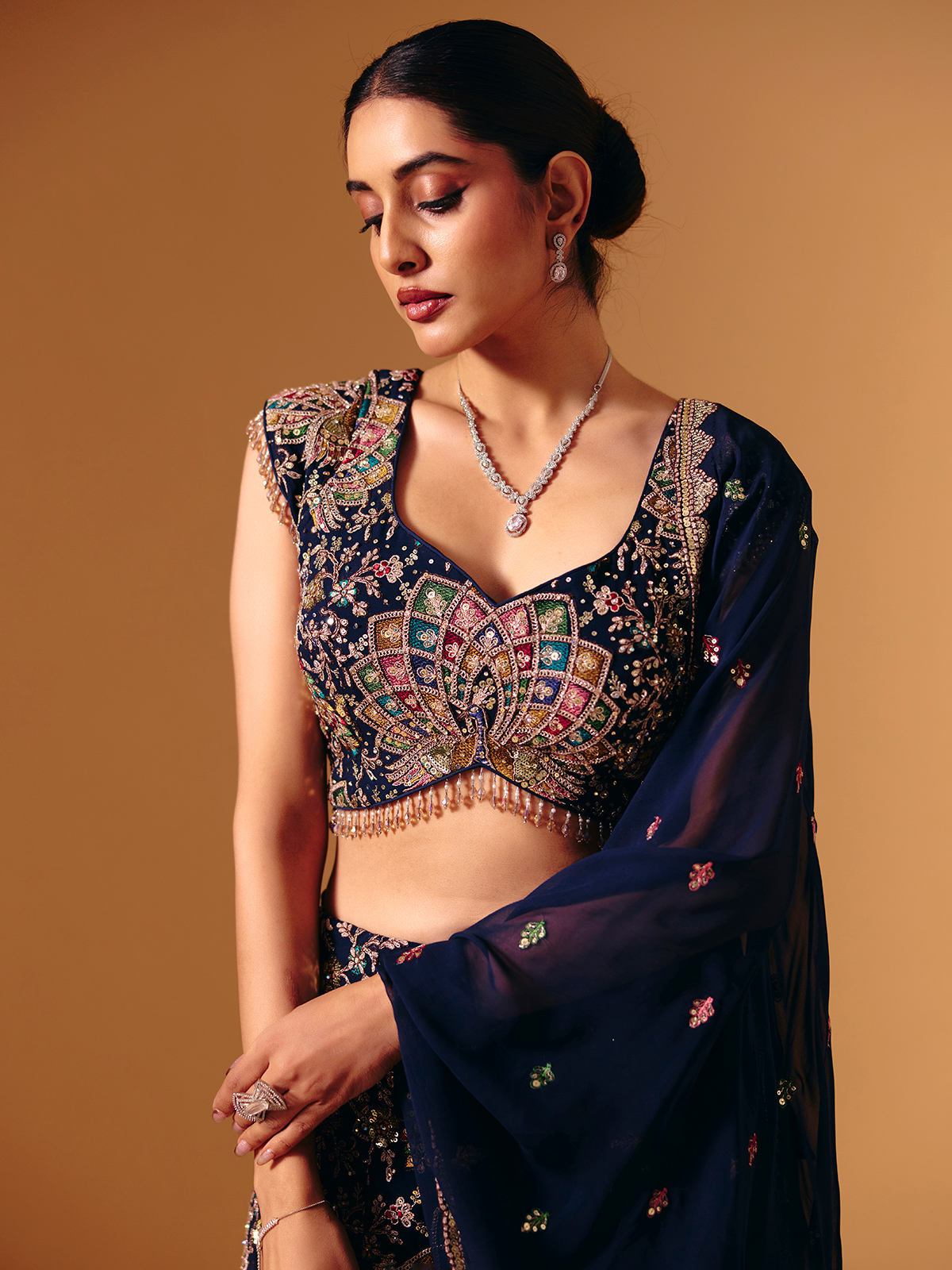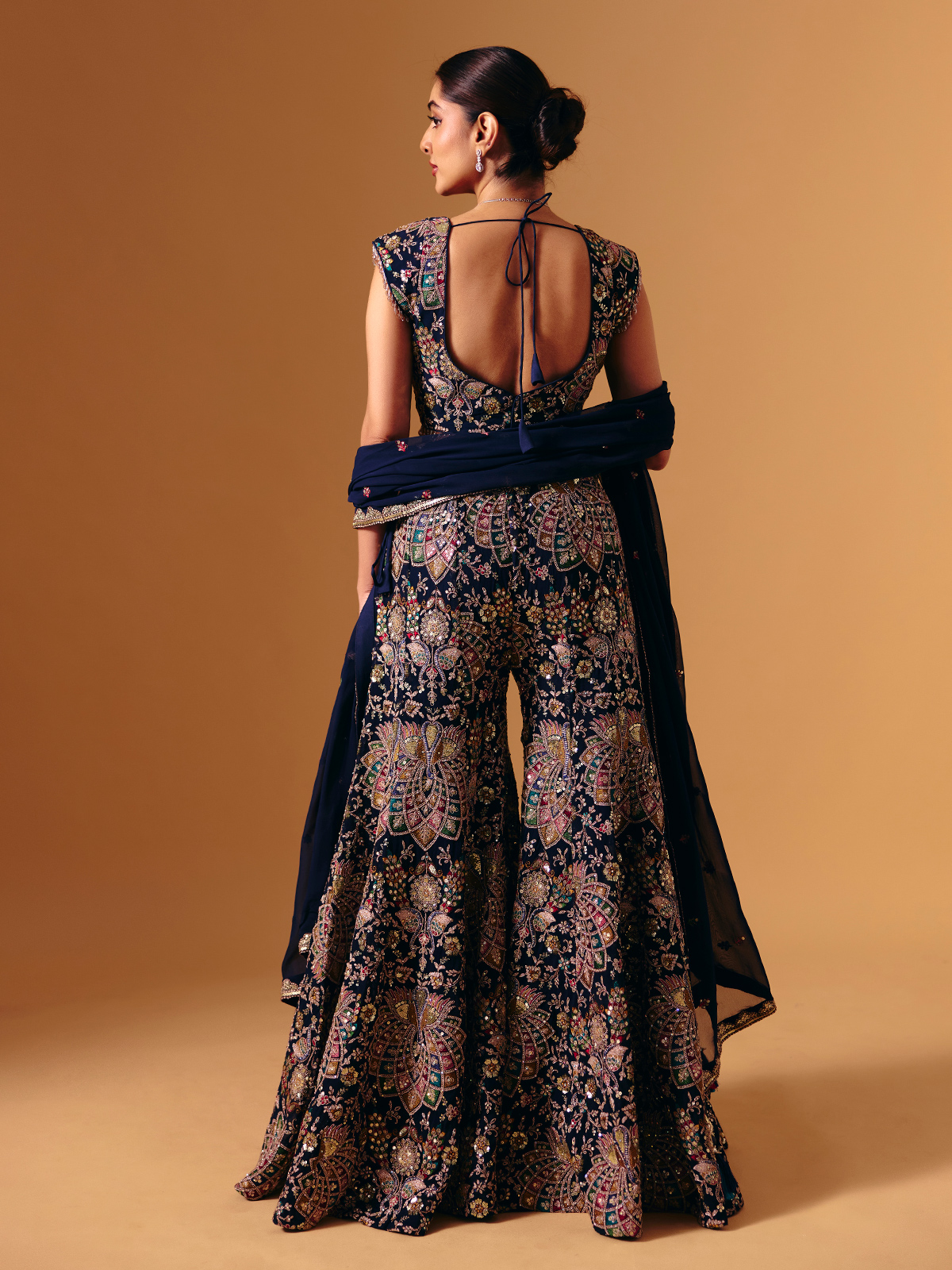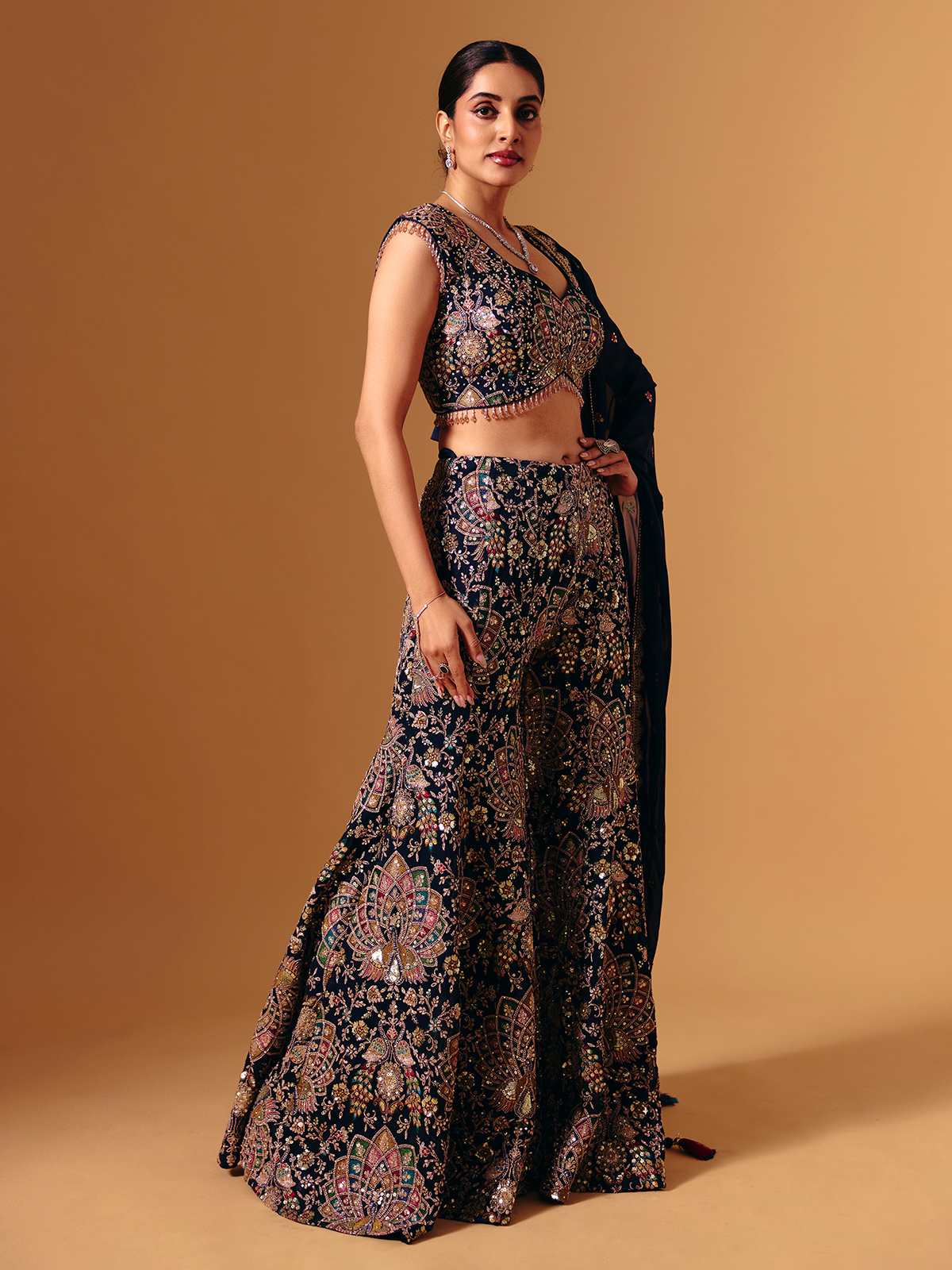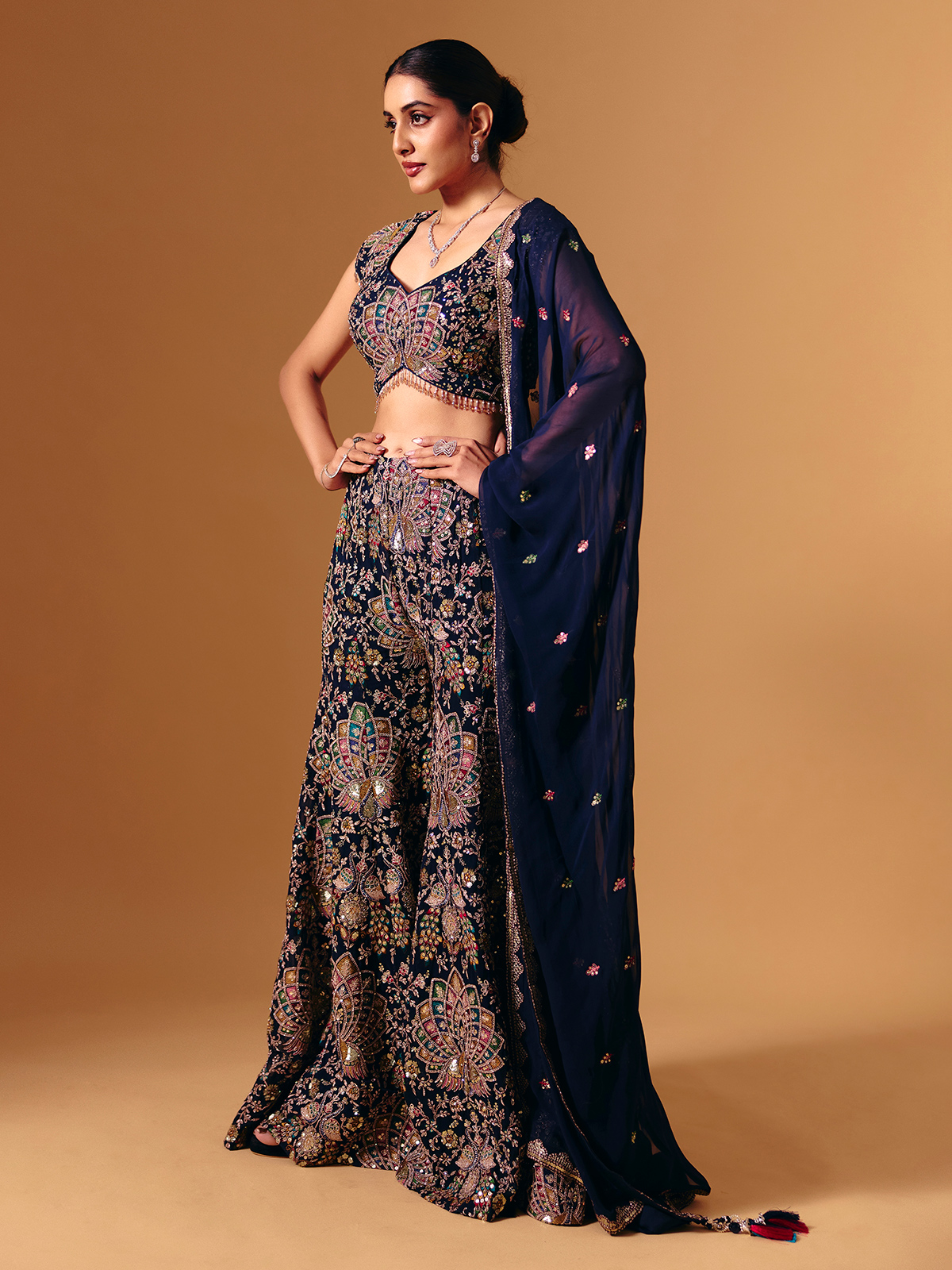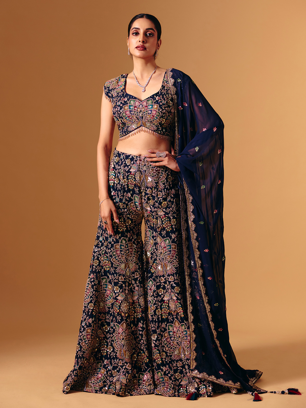 Crafted in deep navy blue georgette, this Pakistani-inspired palazzo suit features intricate embroidery accented with sequins, cutdana, zardosi and stone detailing. Styled with a sleeveless sweetheart neckline, matching palazzo and dupatta, it offers graceful sophistication for weddings, sangeet evenings and festive occasions.