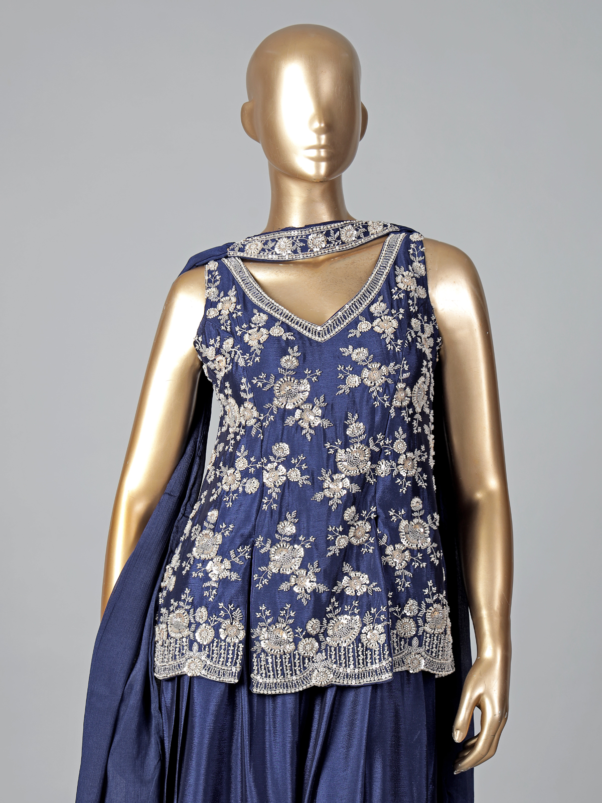 Classic navy blue enrich this silk palazzo suit. Adorned with cutdana, sequins, beads and thread detailing. Designed with a V neckline and sleeveless pattern. It creates a sleek silhouette. Paired with a dupatta, it is perfect for weddings, receptions and festive celebrations.