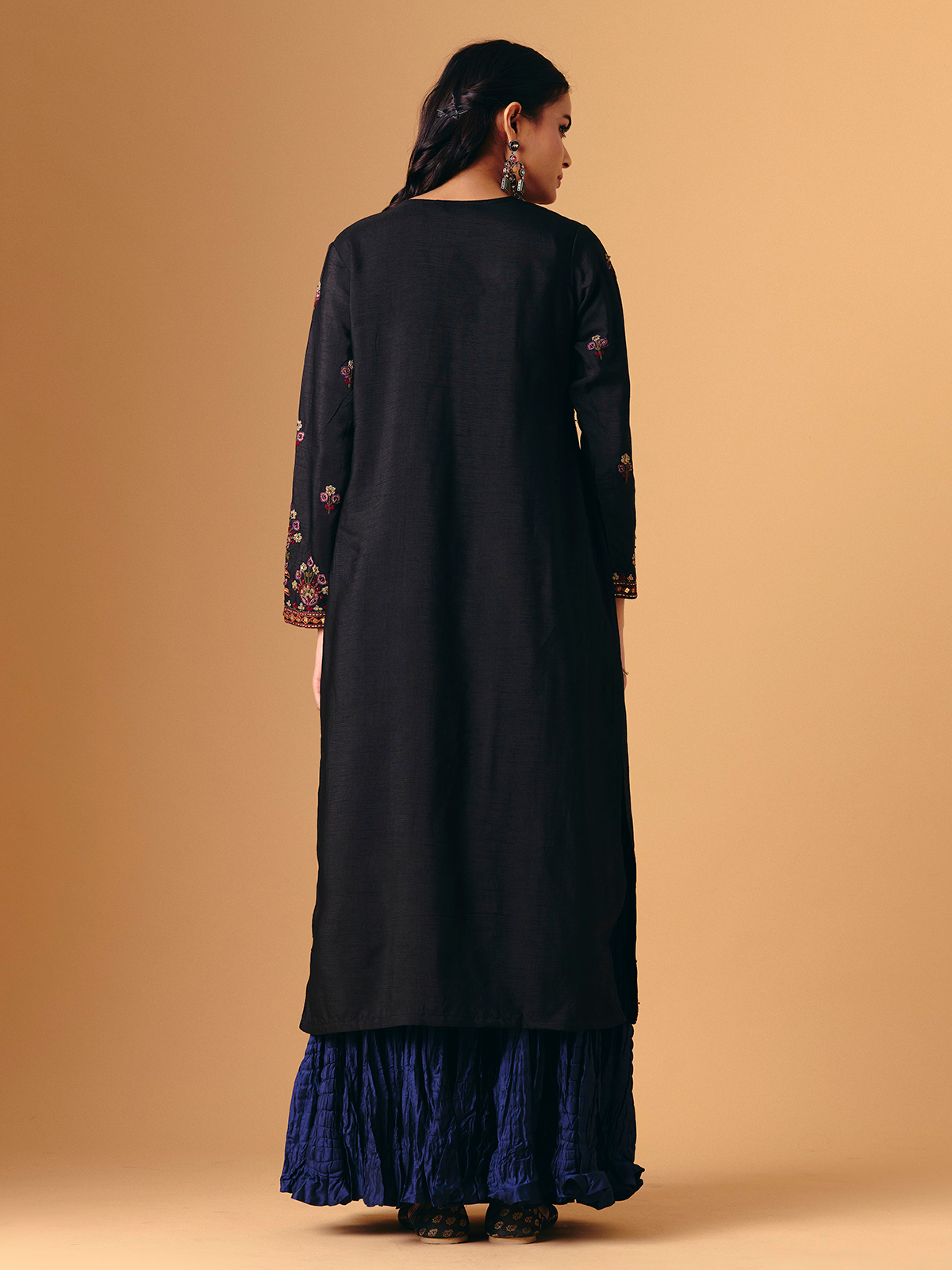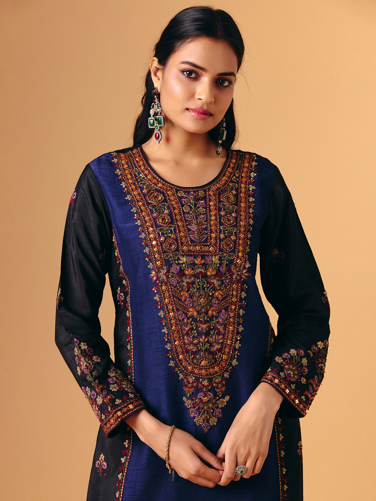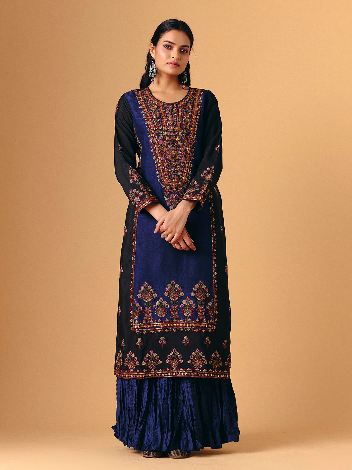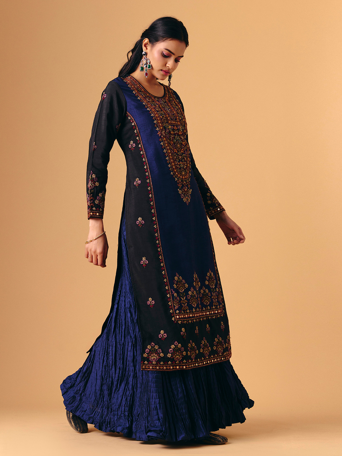 Deep navy silk forms the base of this exquisite lehenga suit adorned with sequins, beads, zari, cutdana, thread, and embroidery work. Full sleeves and a round neckline create a stately silhouette, enhanced by a coordinated dupatta. Ideal for wedding, festive, Eid, or sangeet occasions, it reflects timeless sophistication and regal charm.